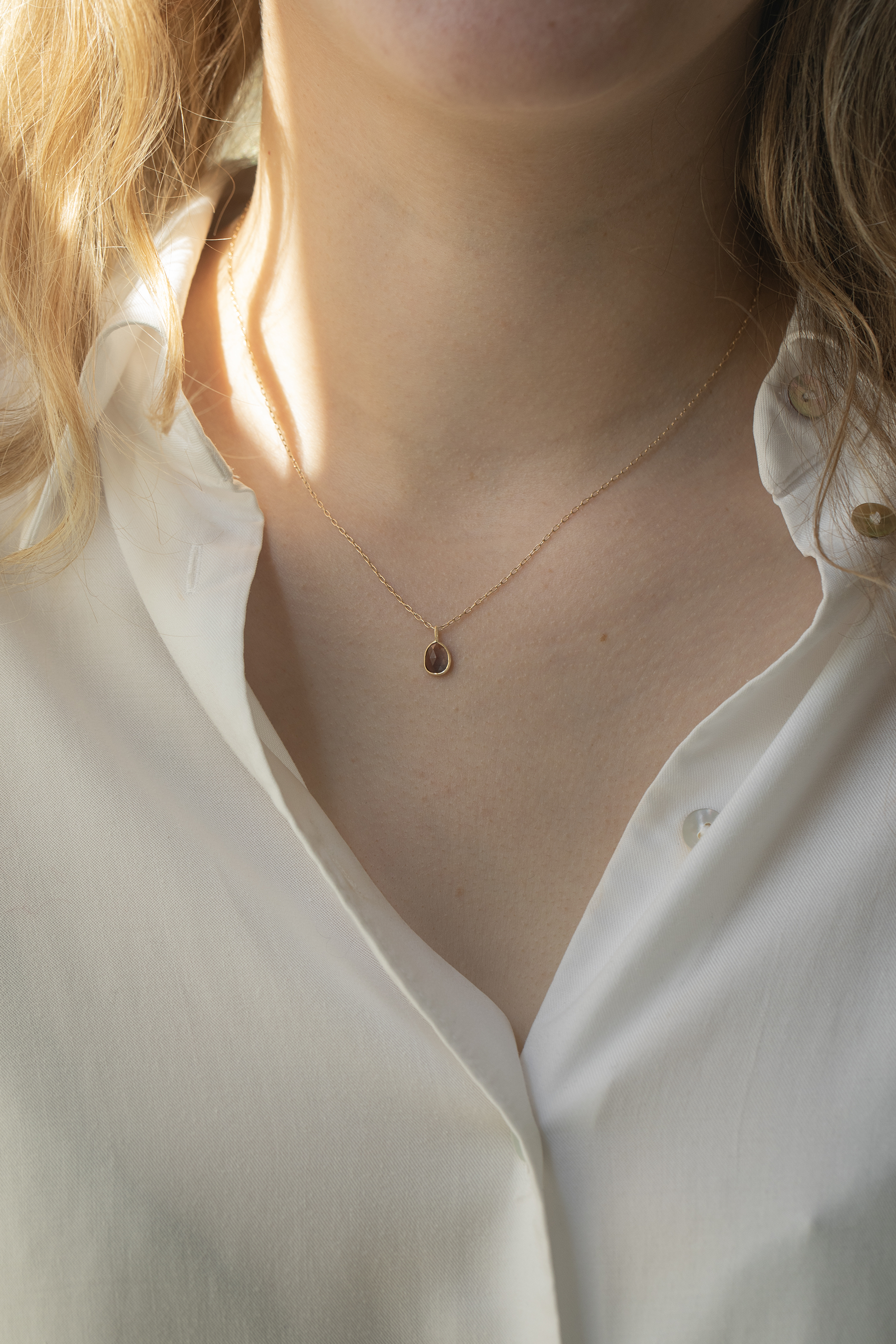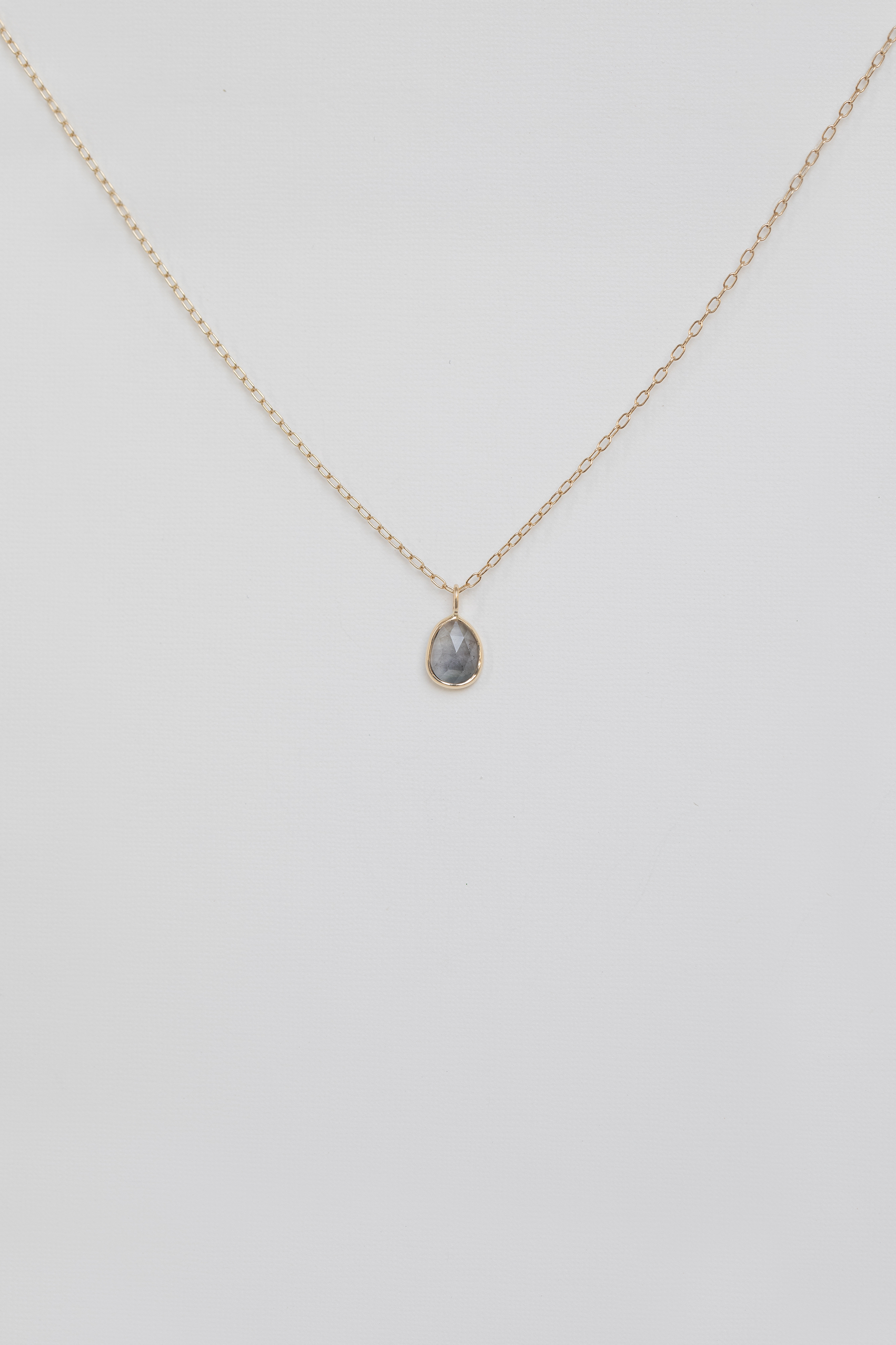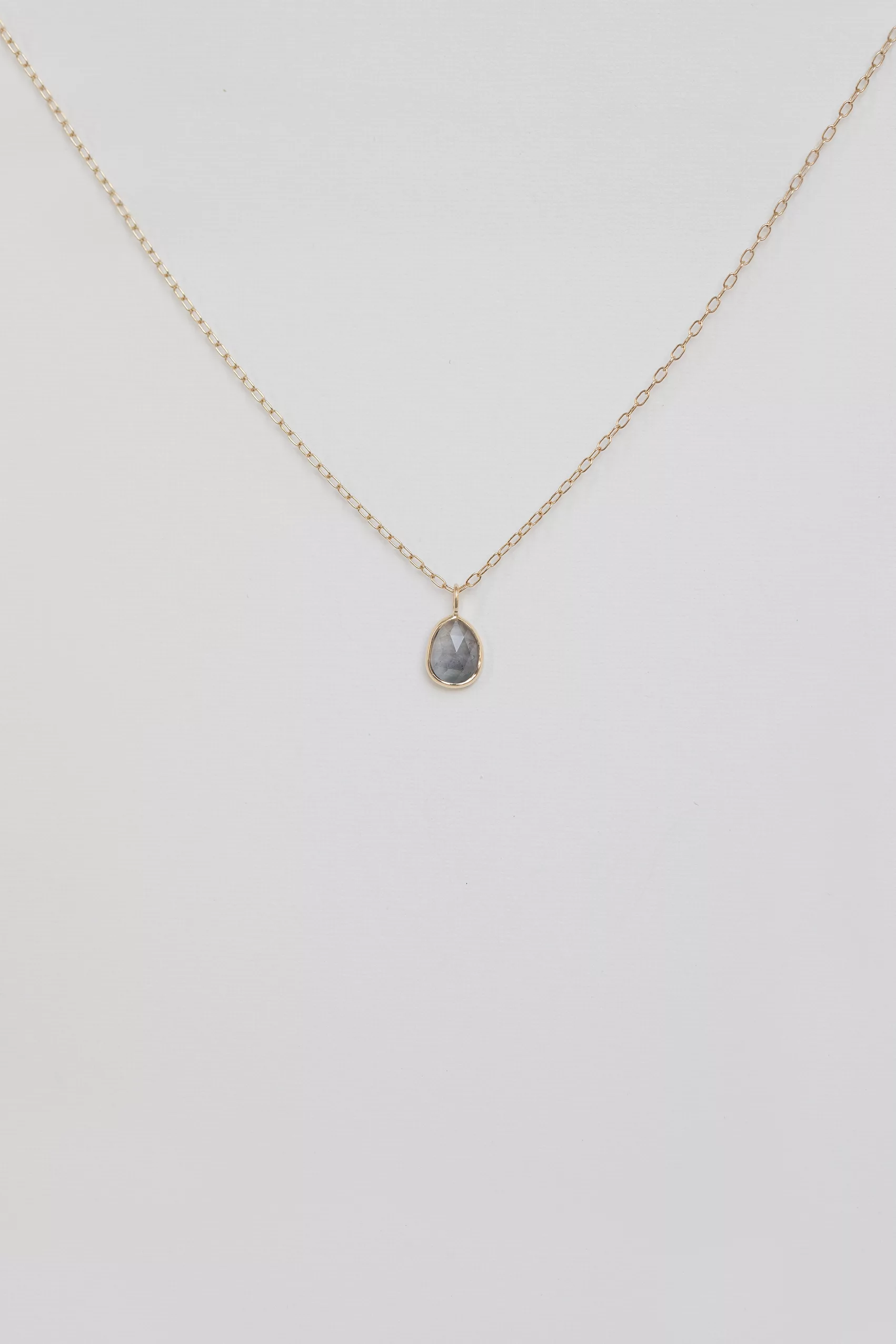 Celine Daoust 14k light yellow gold Maya blue grey tourmaline necklace. The stone is a grey blue shade.
