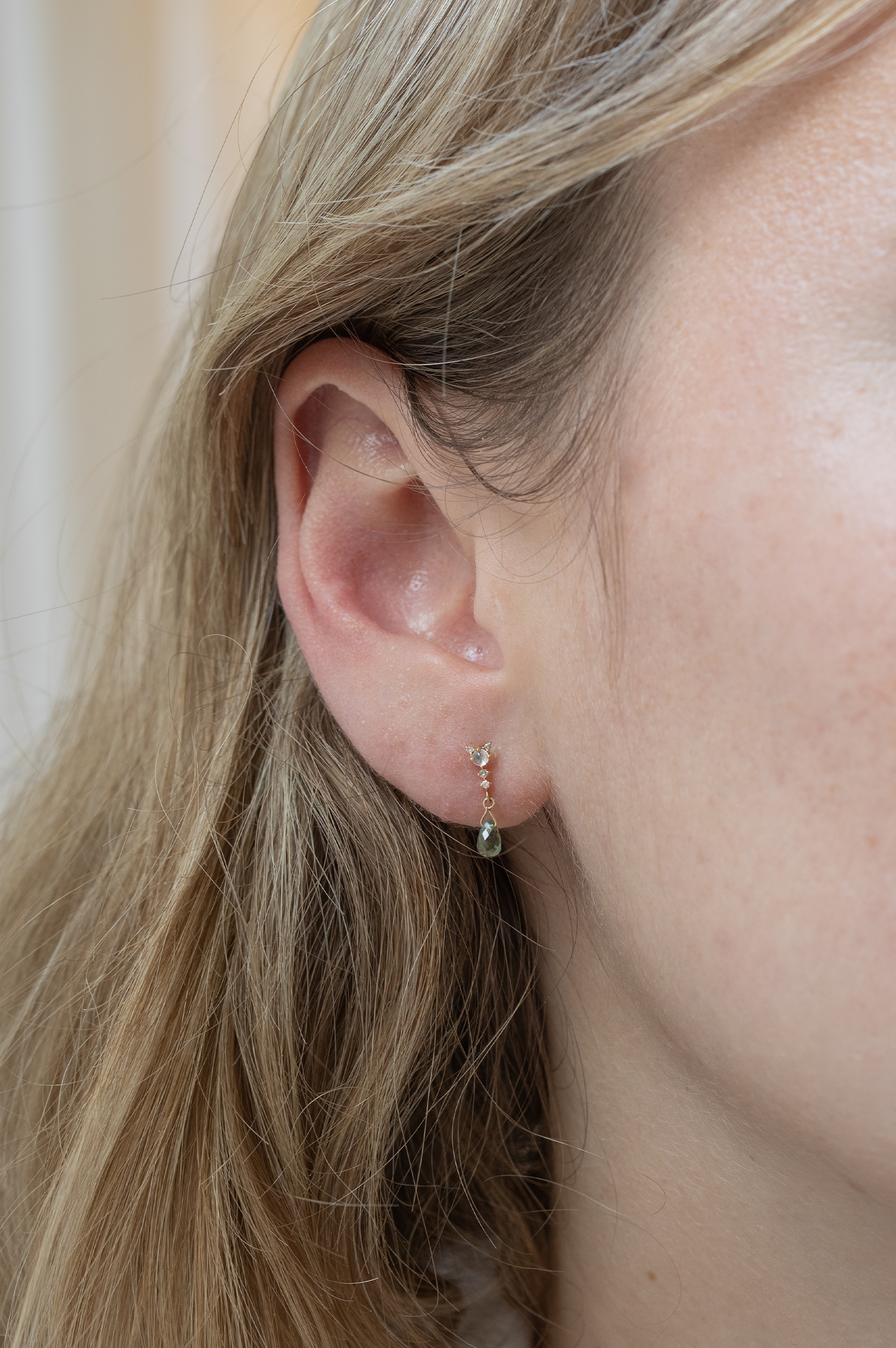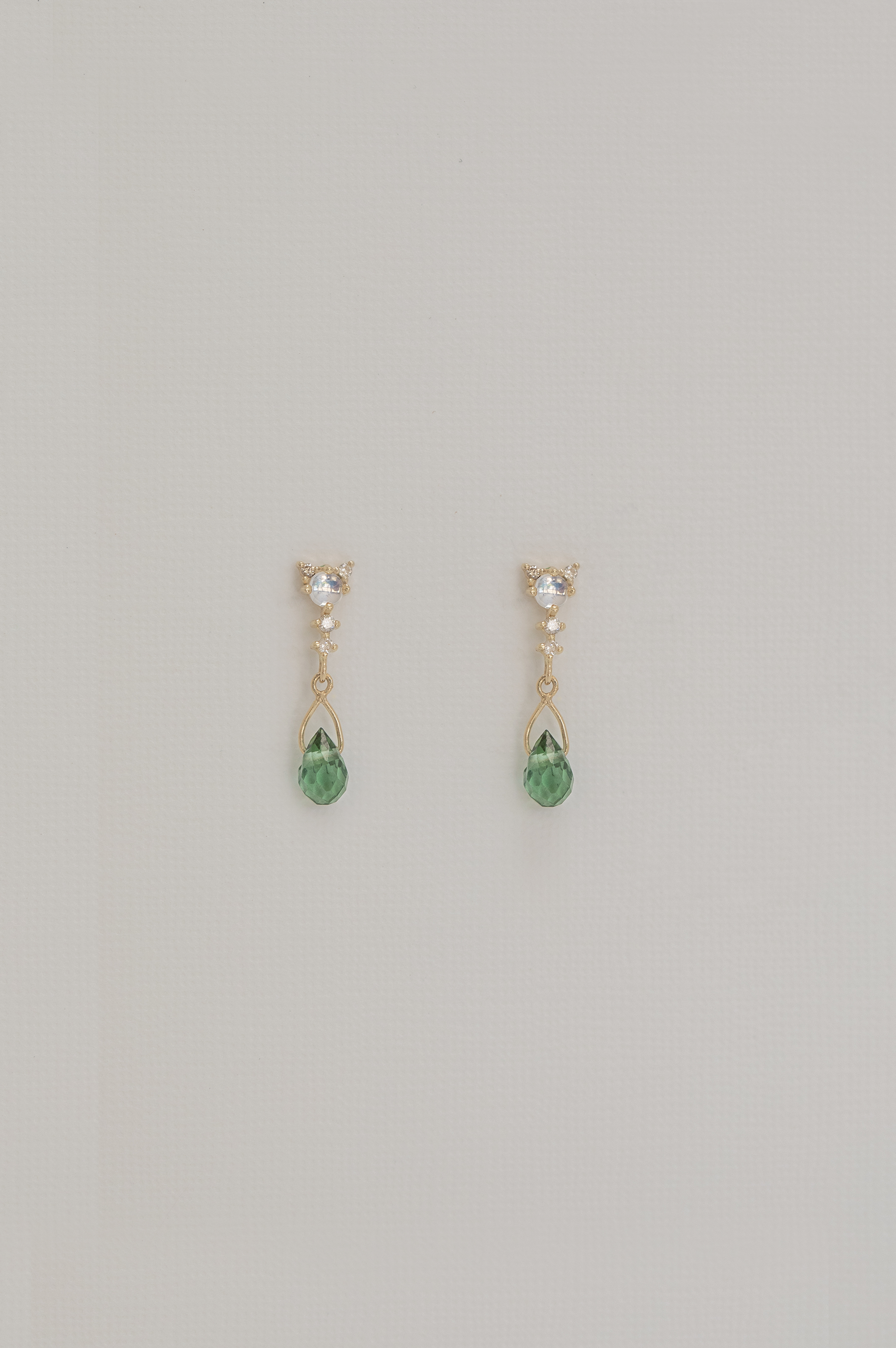 Celine Daoust 14k light yellow gold pair earrings with one green tourmaline, one moonstone and diamonds. The stone comes in gradient of green.