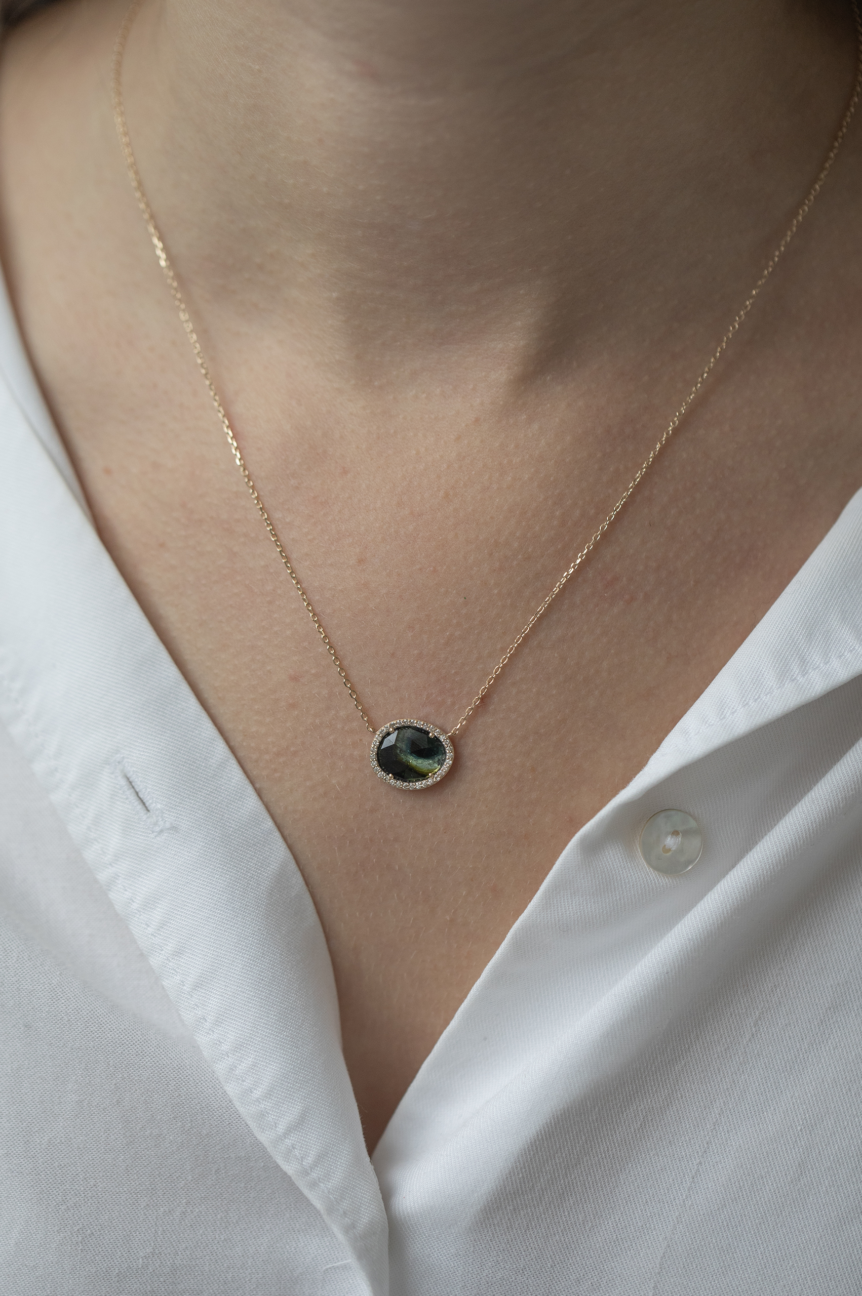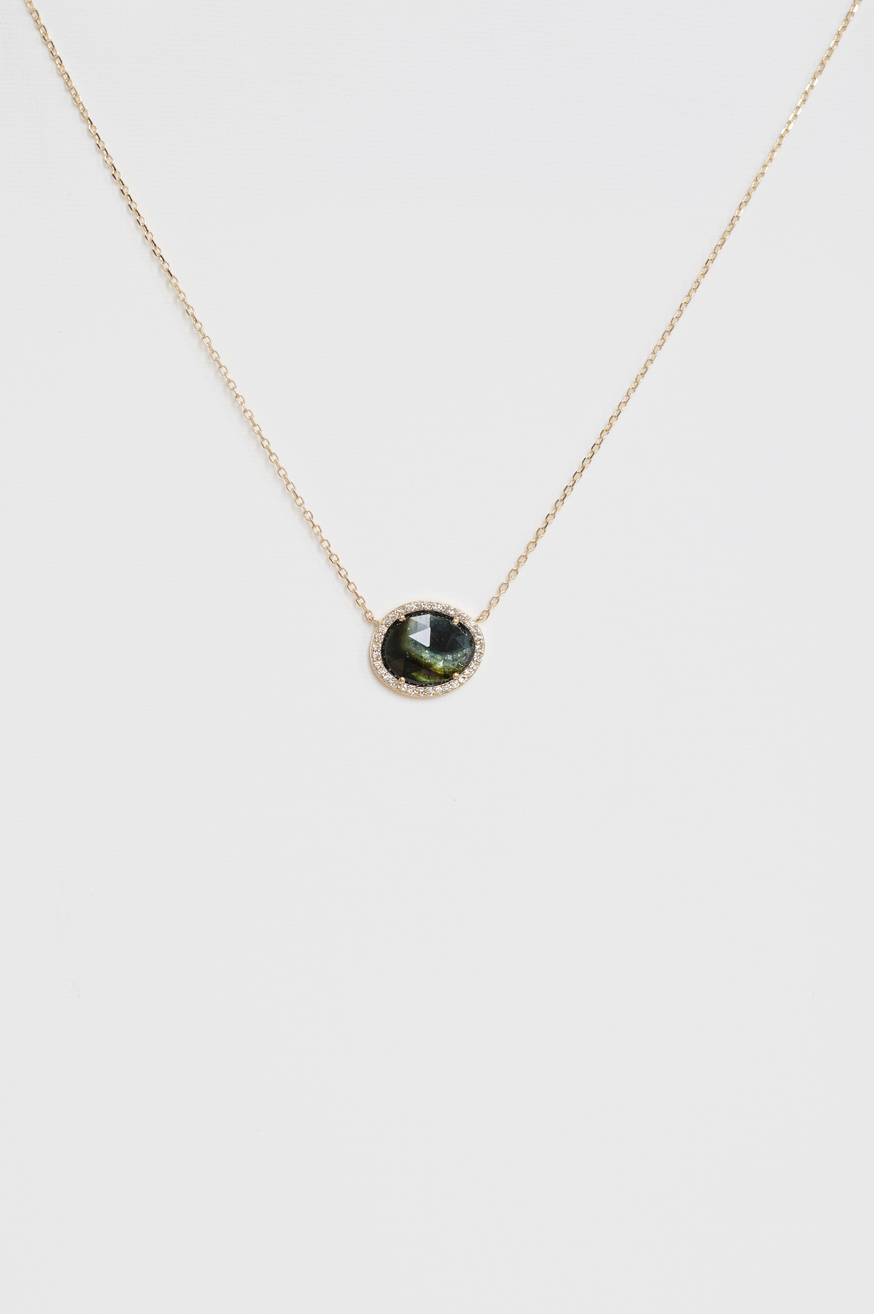 Celine Daoust 14k light yellow gold chain necklace with one grey green tourmaline surrounded by diamonds. The stone comes in a gradient of deep green and turquoise.