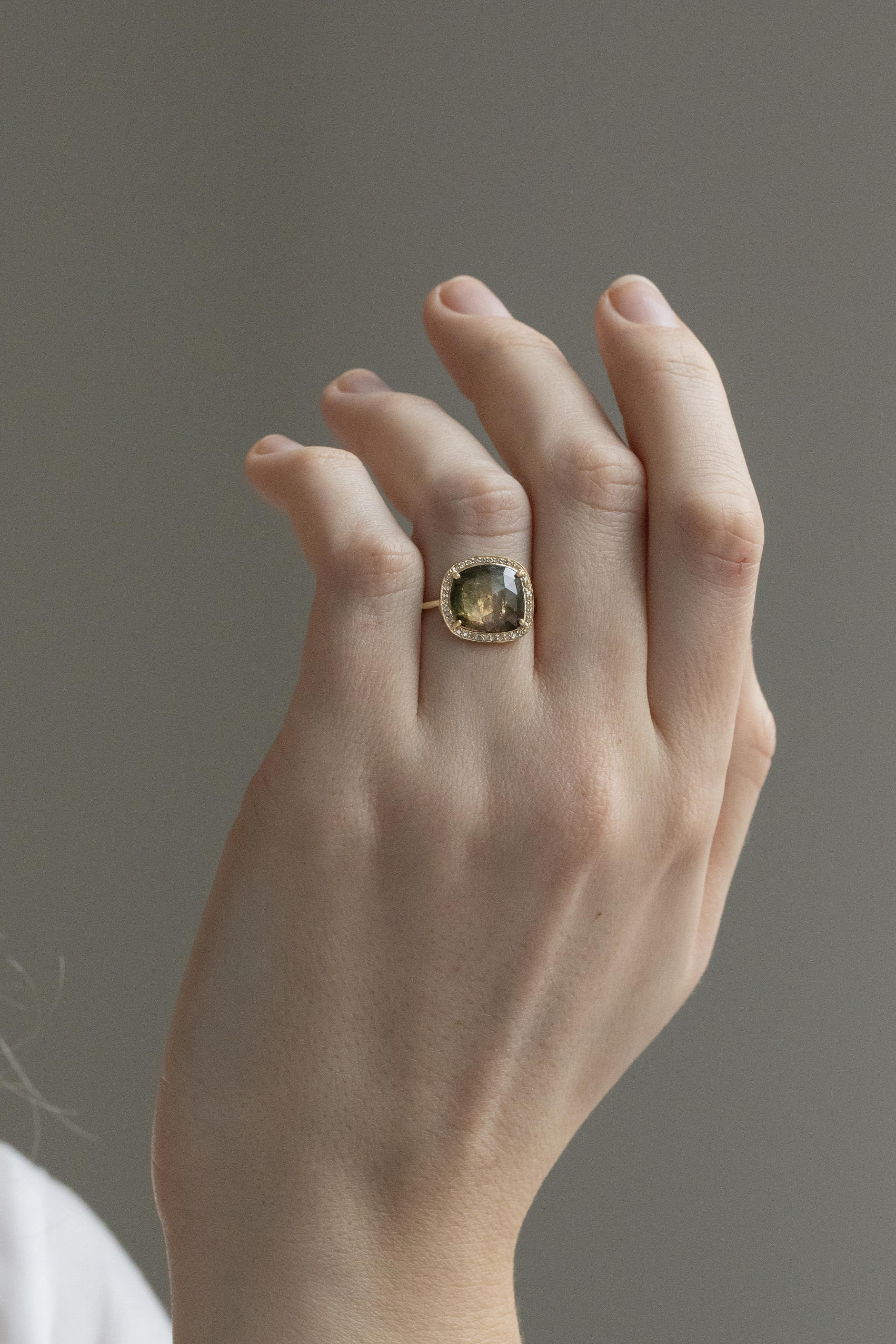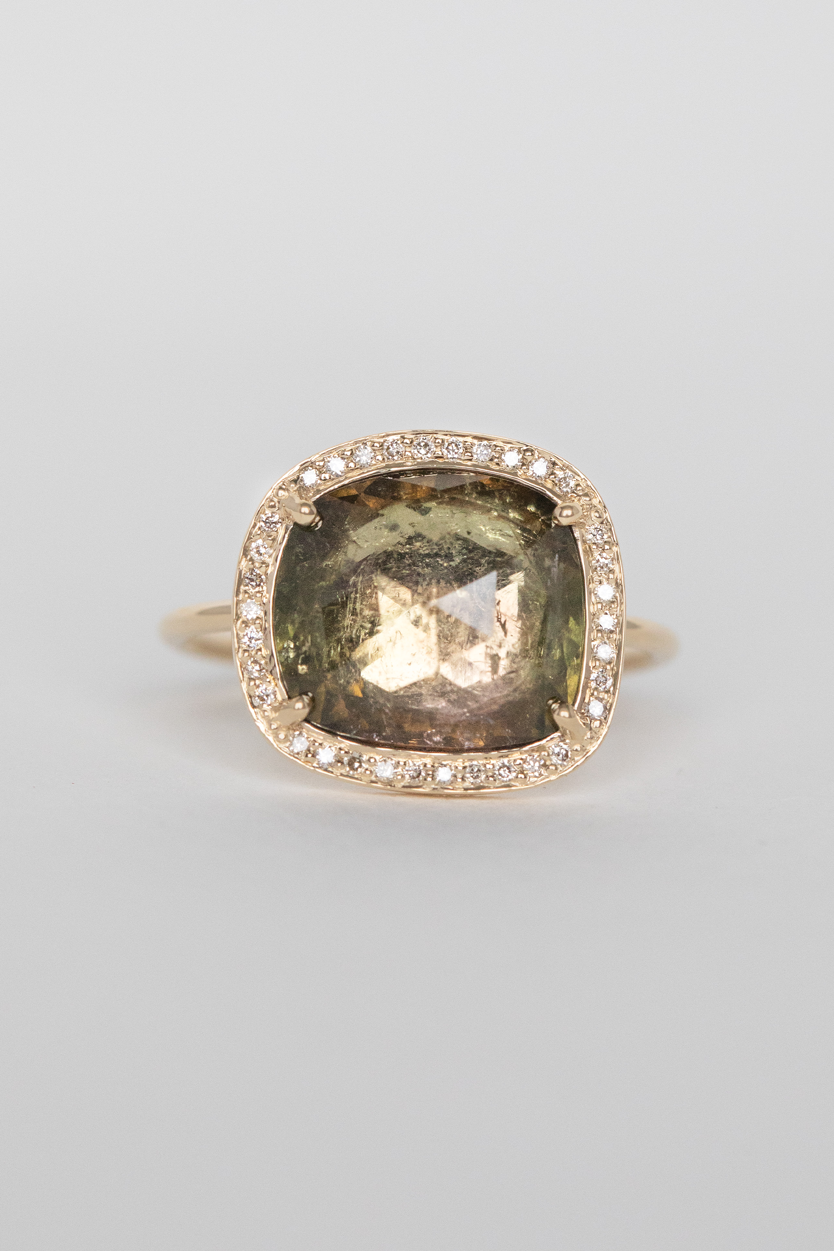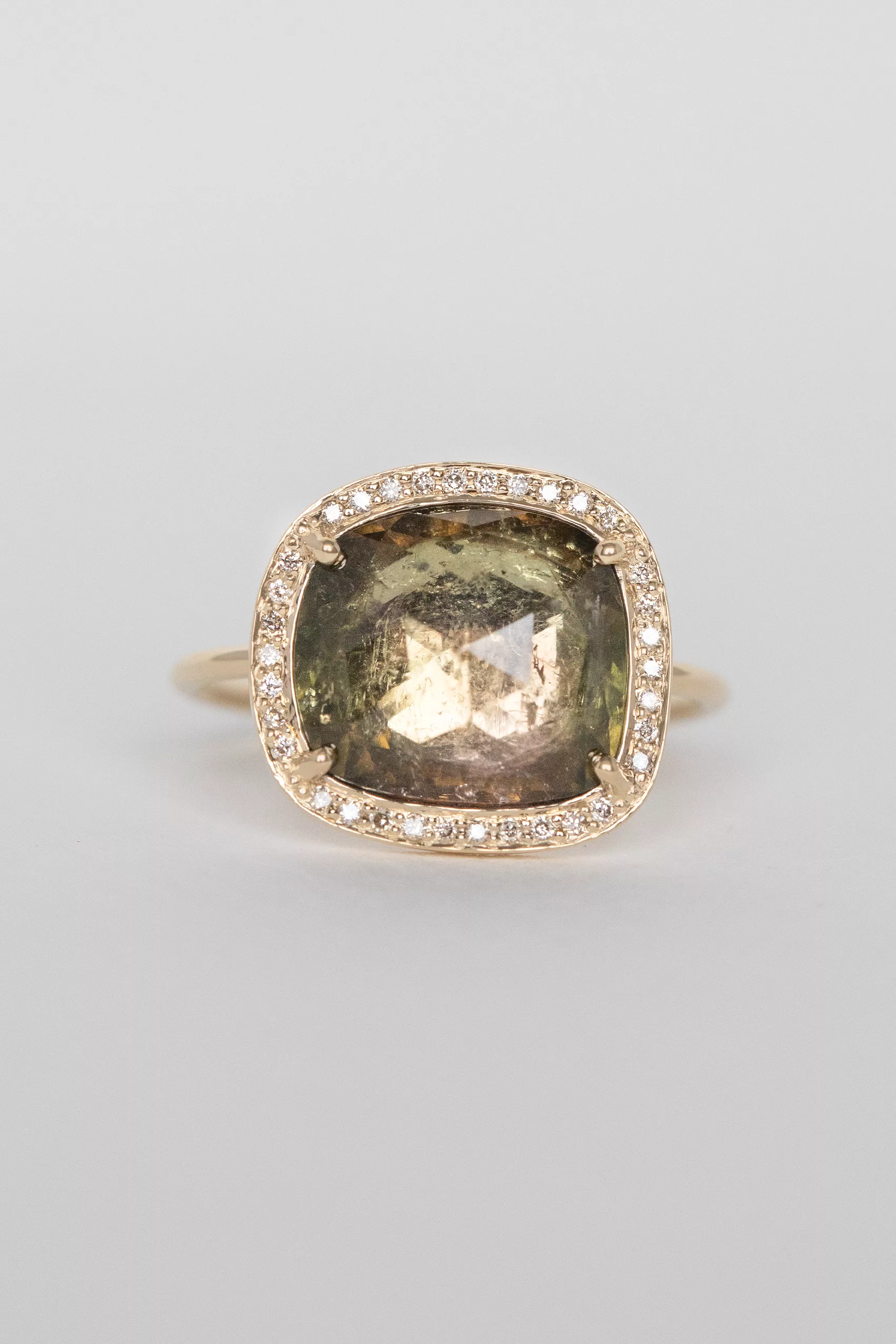 Céline Daoust 14k light yellow gold ring with a tourmaline surrounded by diamonds. The stone comes in a gradient of green with some darker hues.