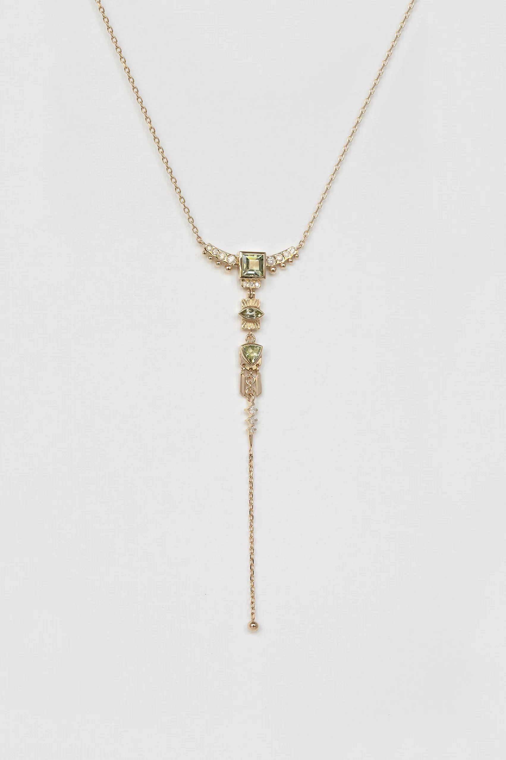 Celine Daoust 14k light yellow gold lariat pendant with 3 green tourmalines and diamonds with dangling details. The stone is a gradient of green and turquoise.