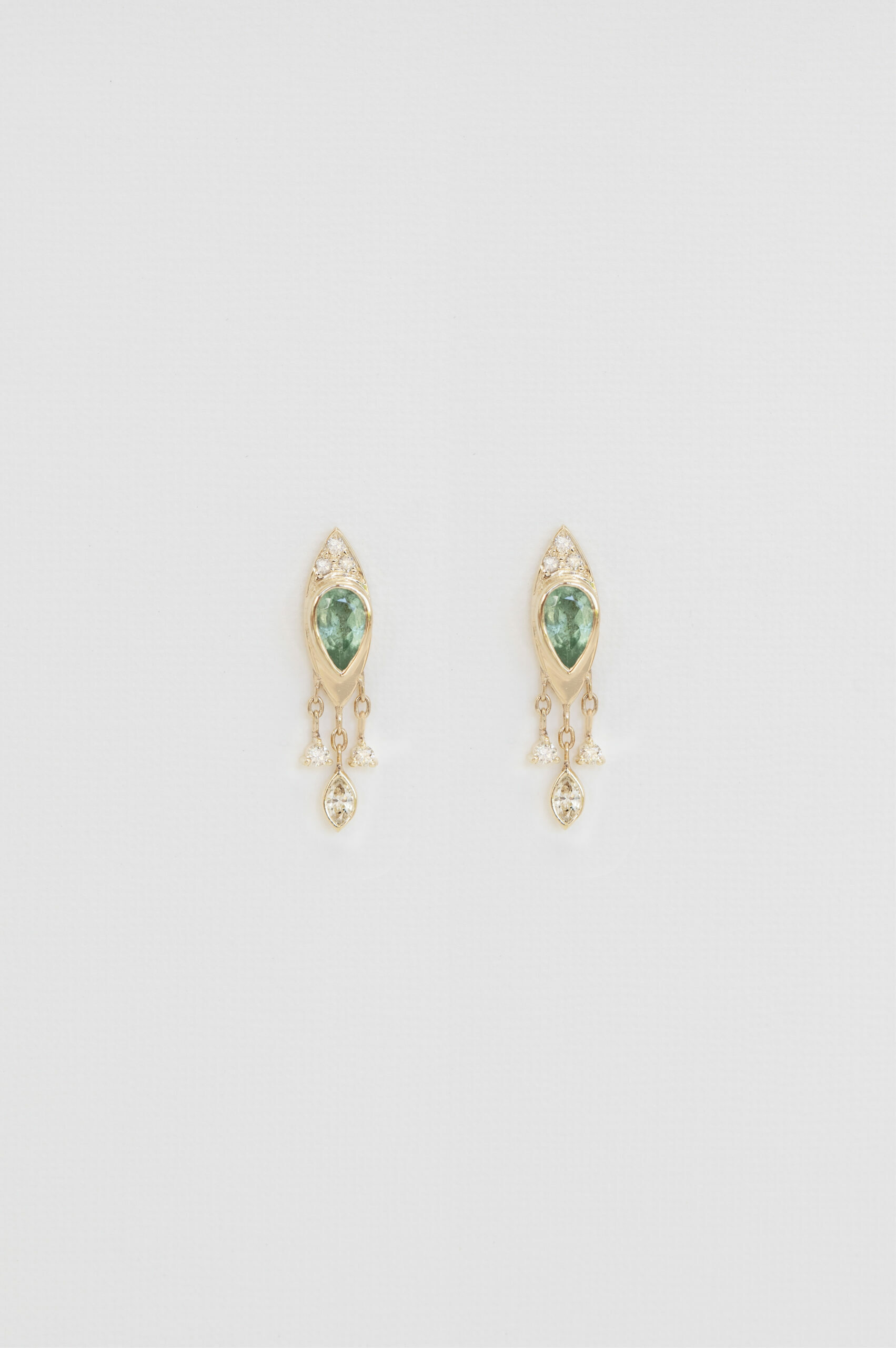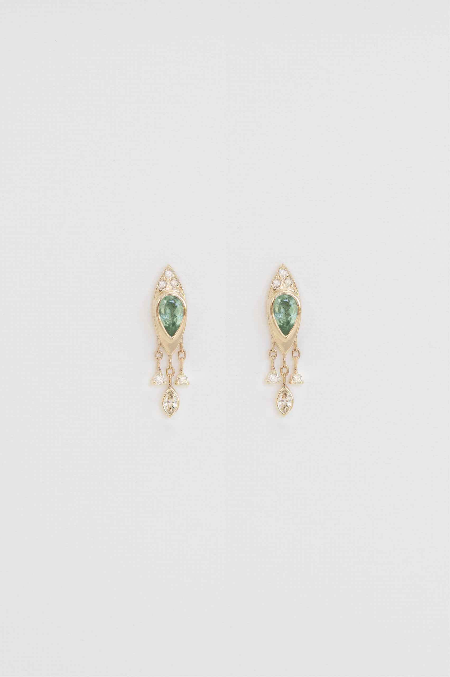 Céline Daoust 14k light yellow gold totem stud earring with one green pear tourmaline and diamonds. The stone is a gradient of green.