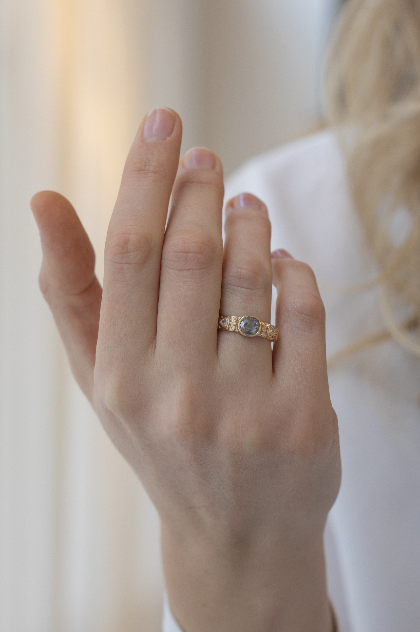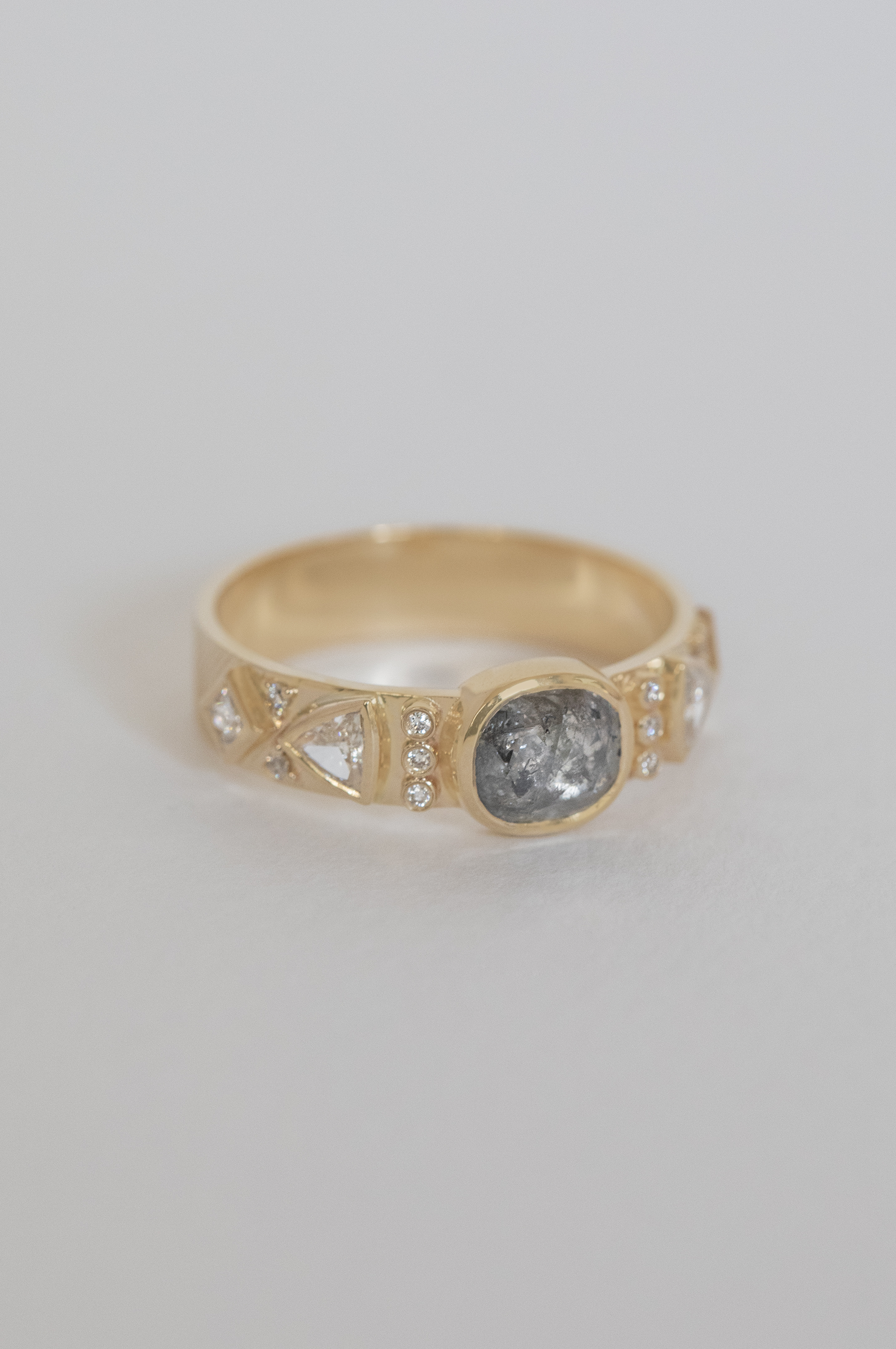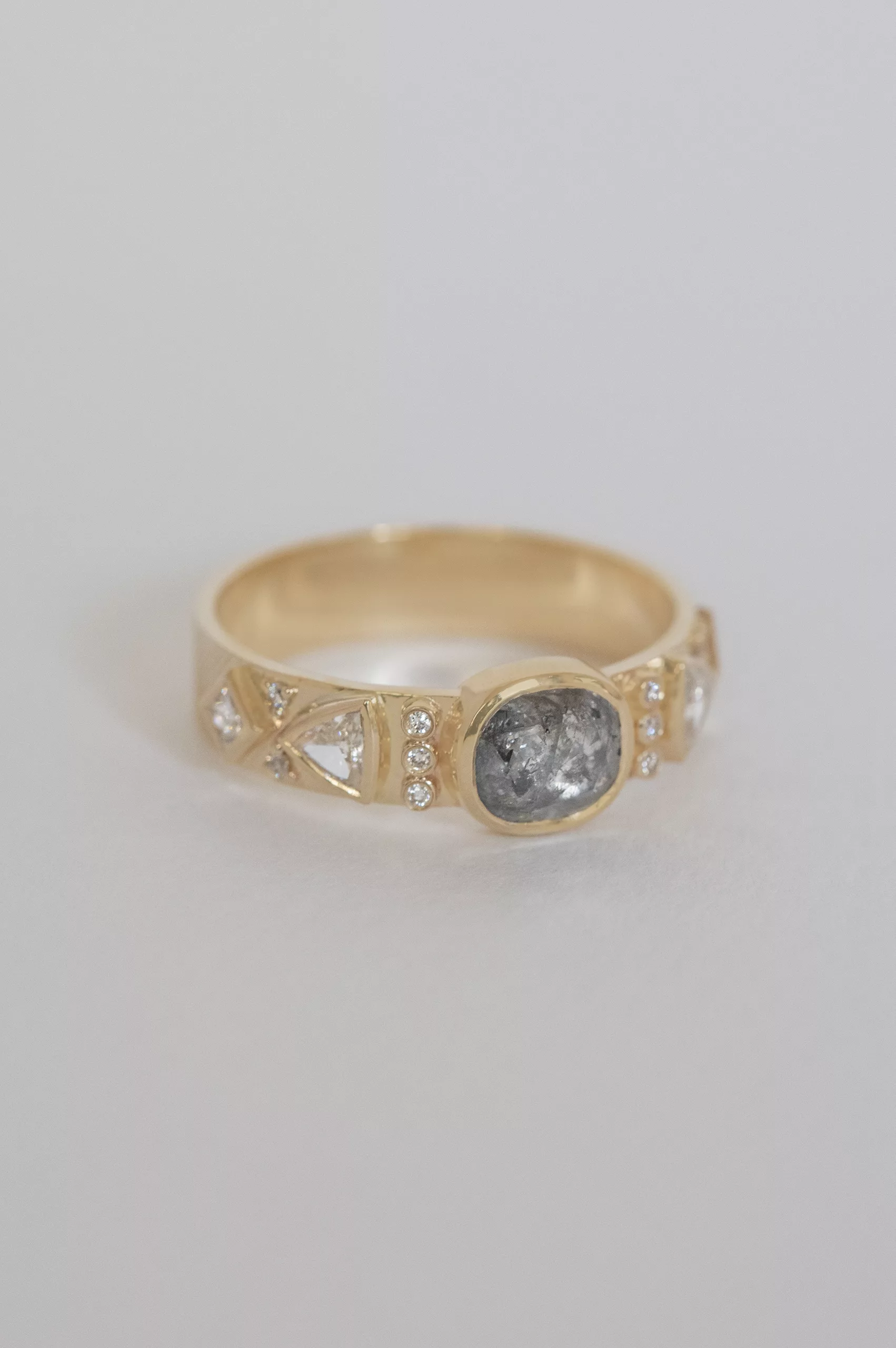 Celine Daoust 14k light yellow gold ring with one grey Diamond surrounded with diamonds details. The stone comes in gradient of grey.
