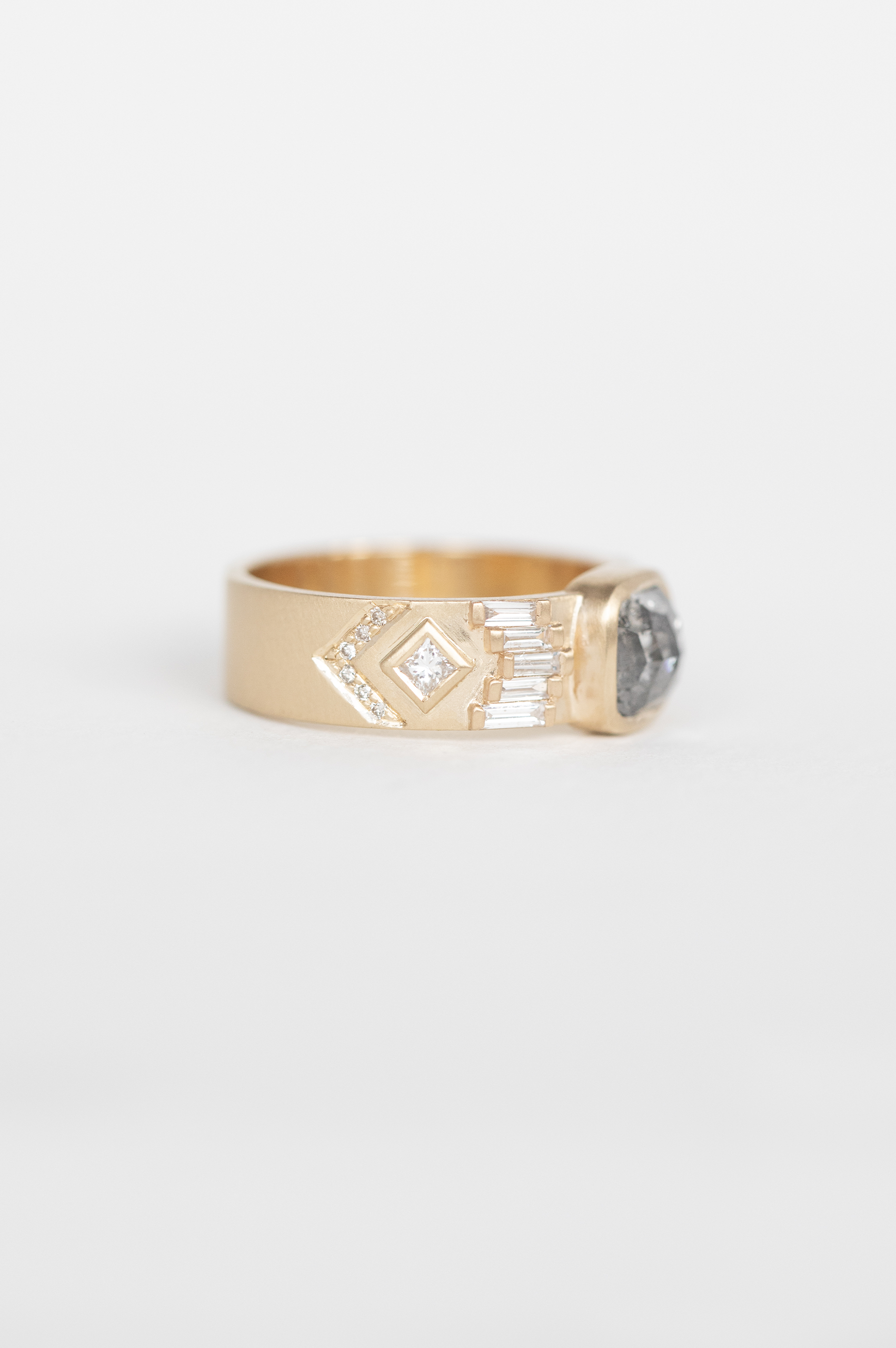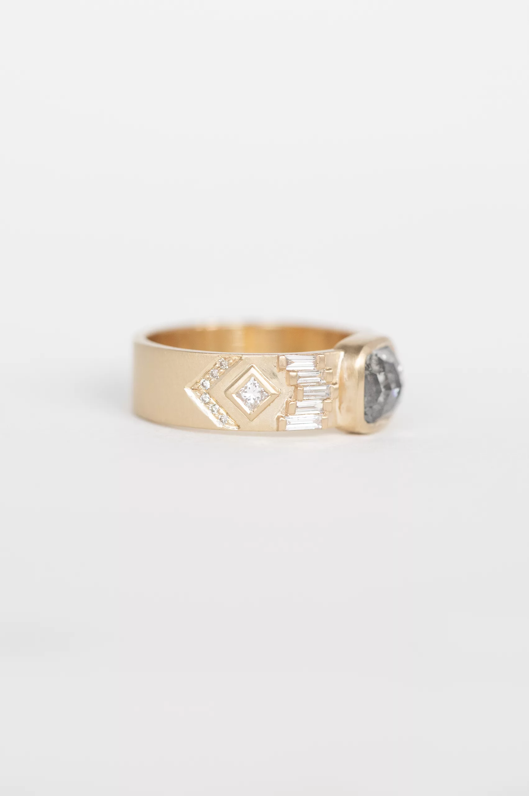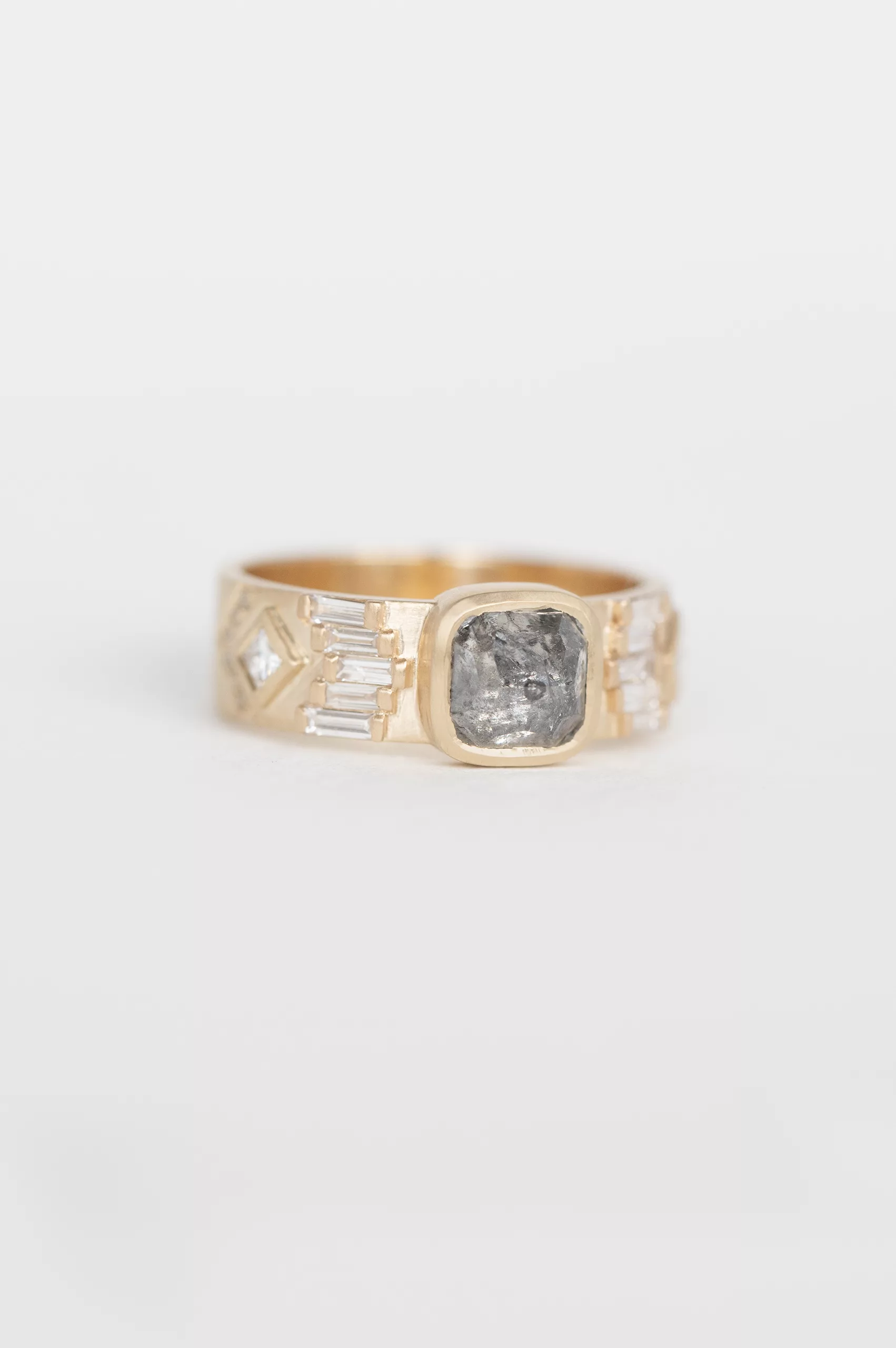 Celine Daoust 14k light yellow gold ring with one grey Diamond surrounded with baguette diamonds and two diamonds. The stone comes in gradient of light and dark grey.