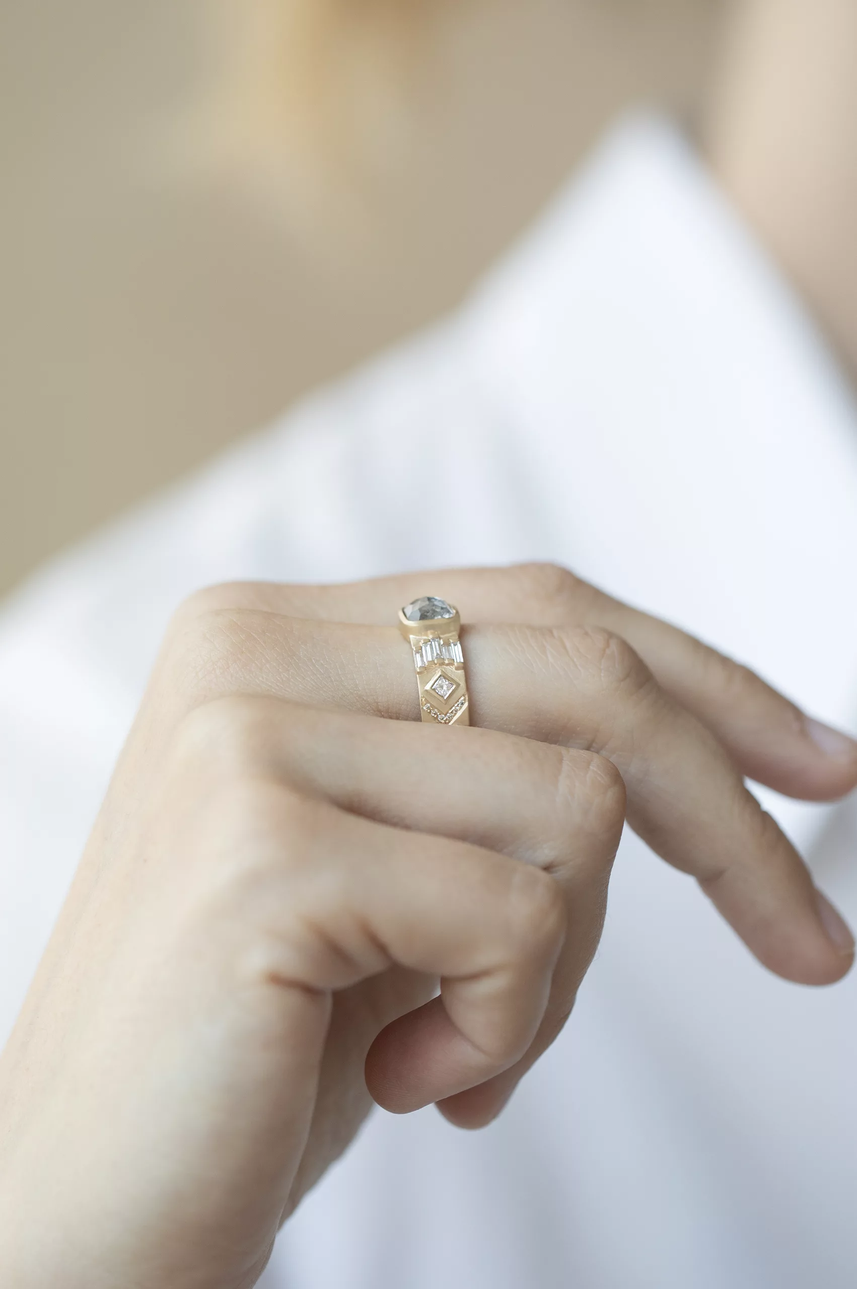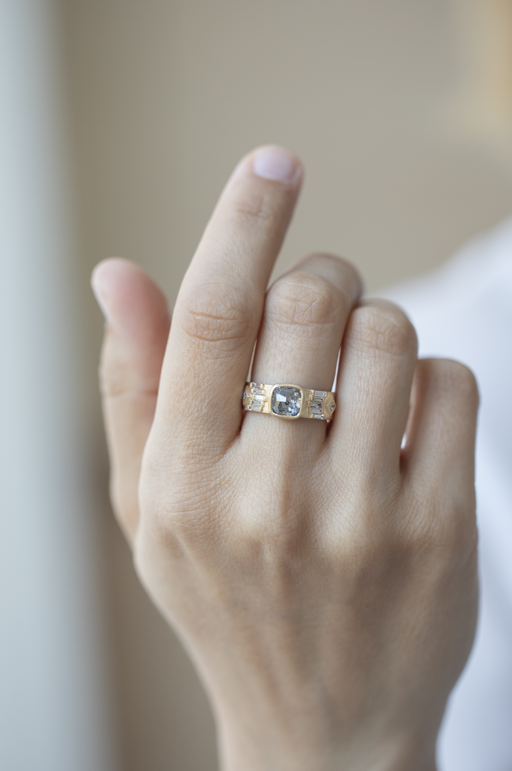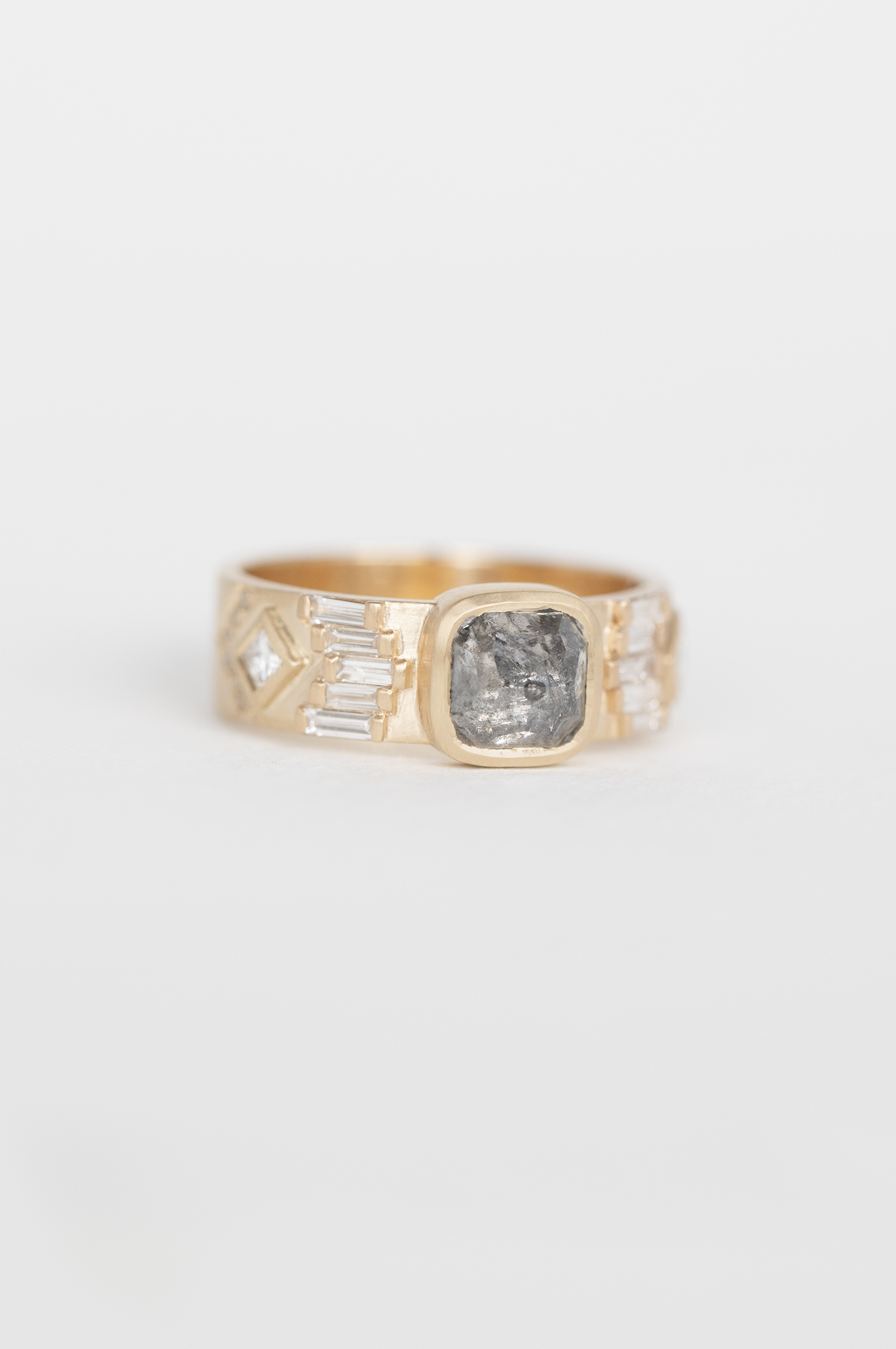 Celine Daoust 14k light yellow gold ring with one grey Diamond surrounded with baguette diamonds and two diamonds. The stone comes in gradient of light and dark grey.