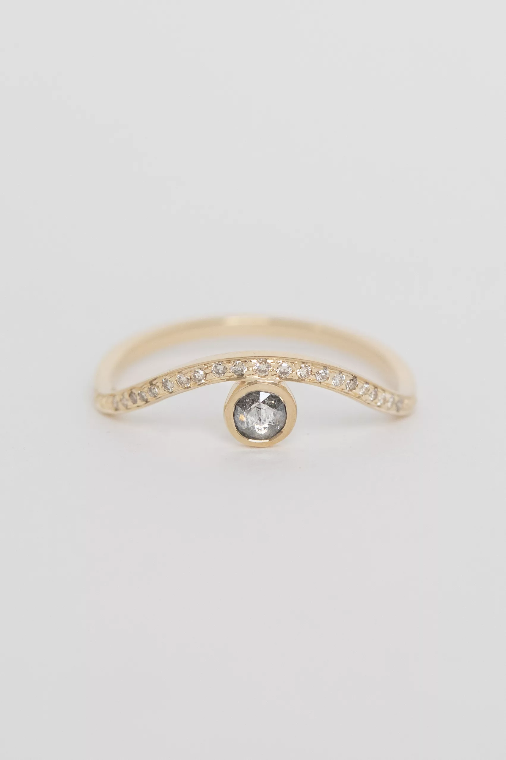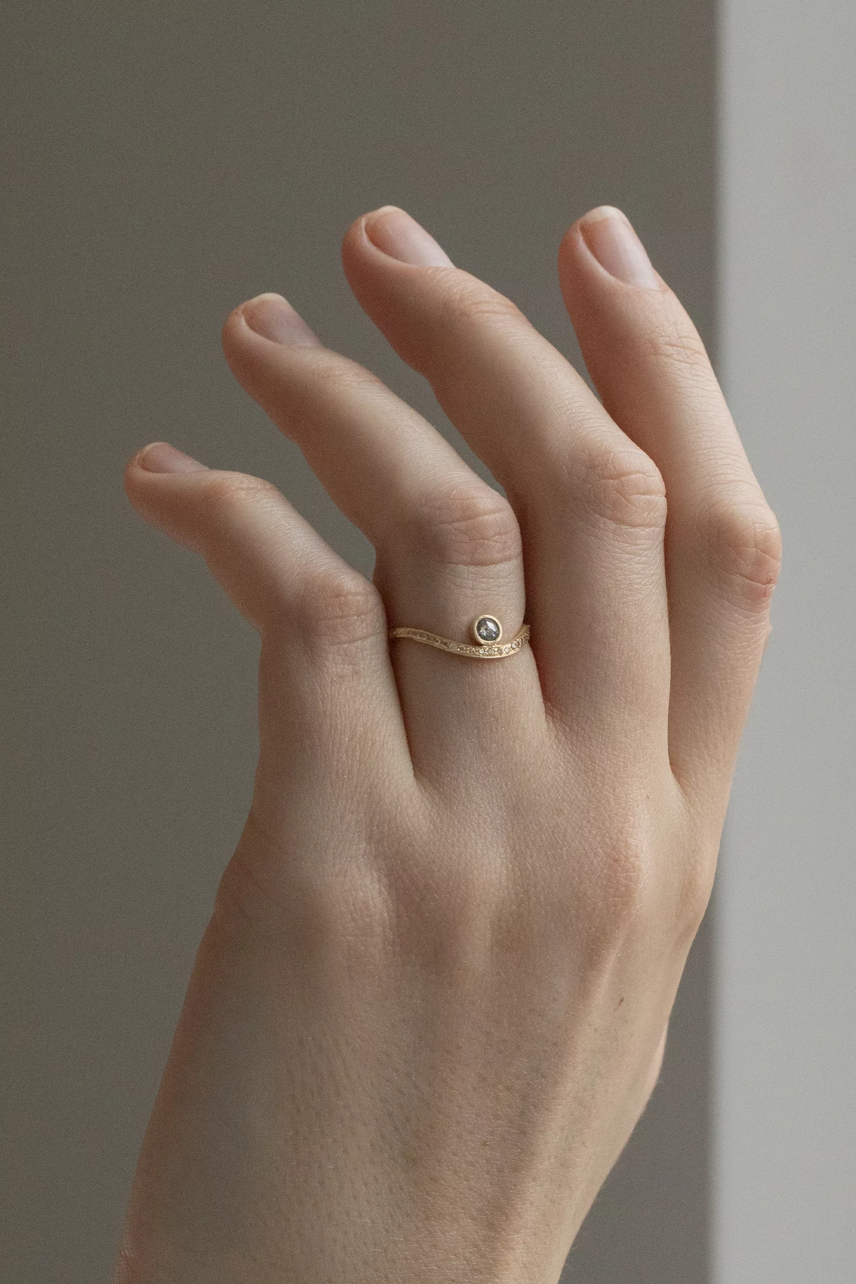 Celine Daoust 14k light yellow gold ring with a rose cut grey diamond on a gold wave with diamonds.