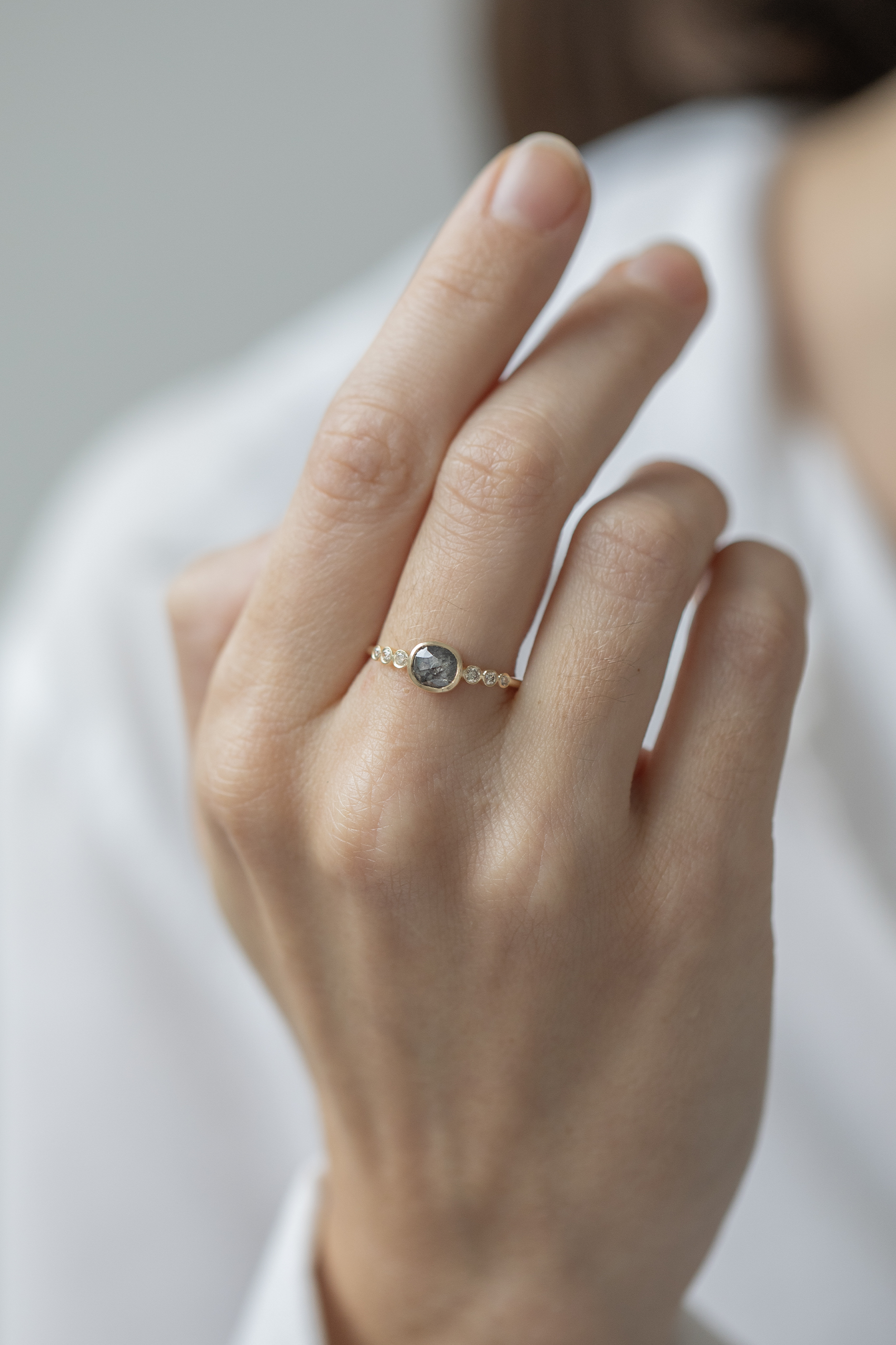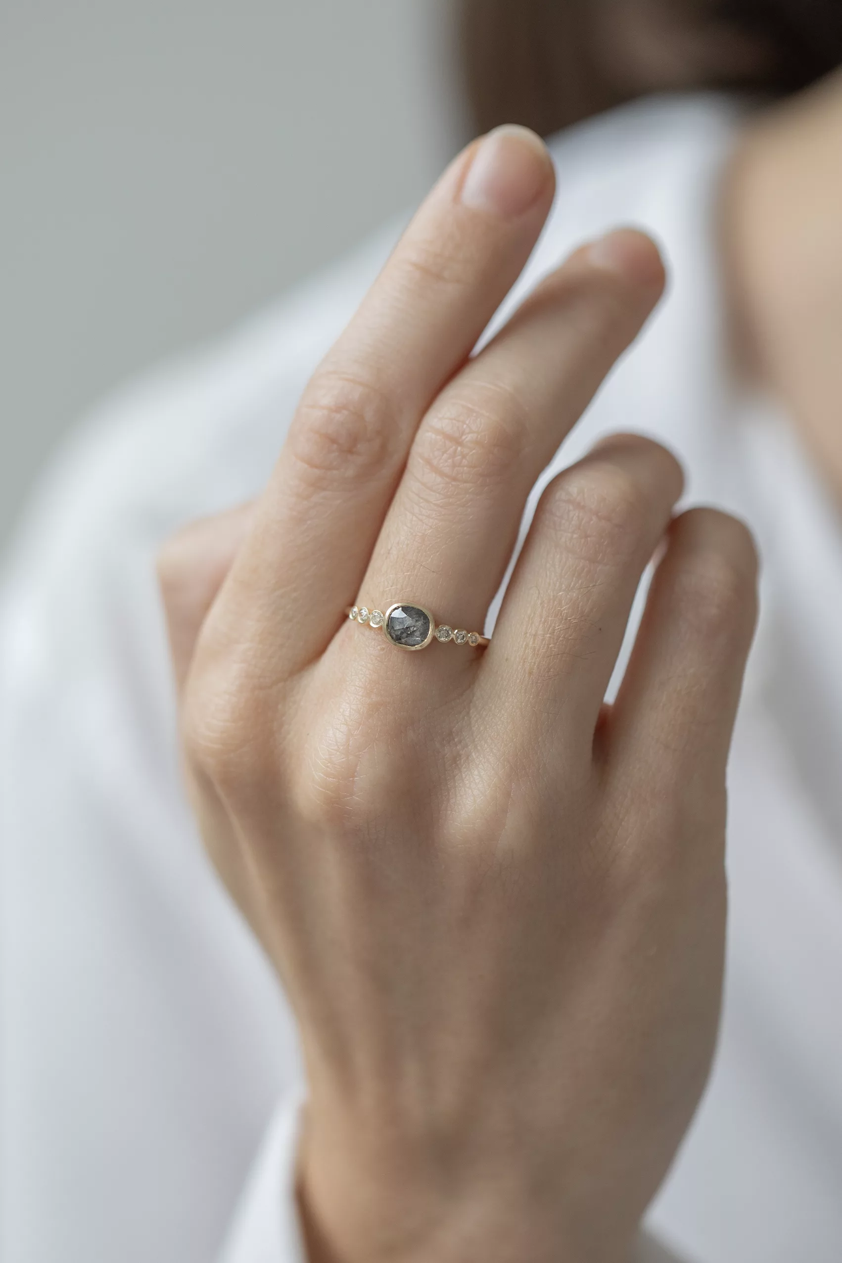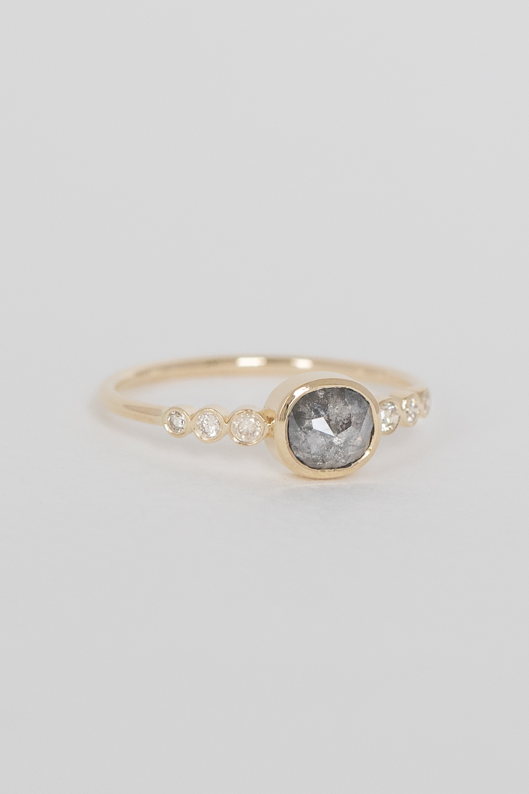 Celine daoust 14k light yellow gold with one central grey diamond and six diamonds. The stone comes in a gradient of light and dark grey.