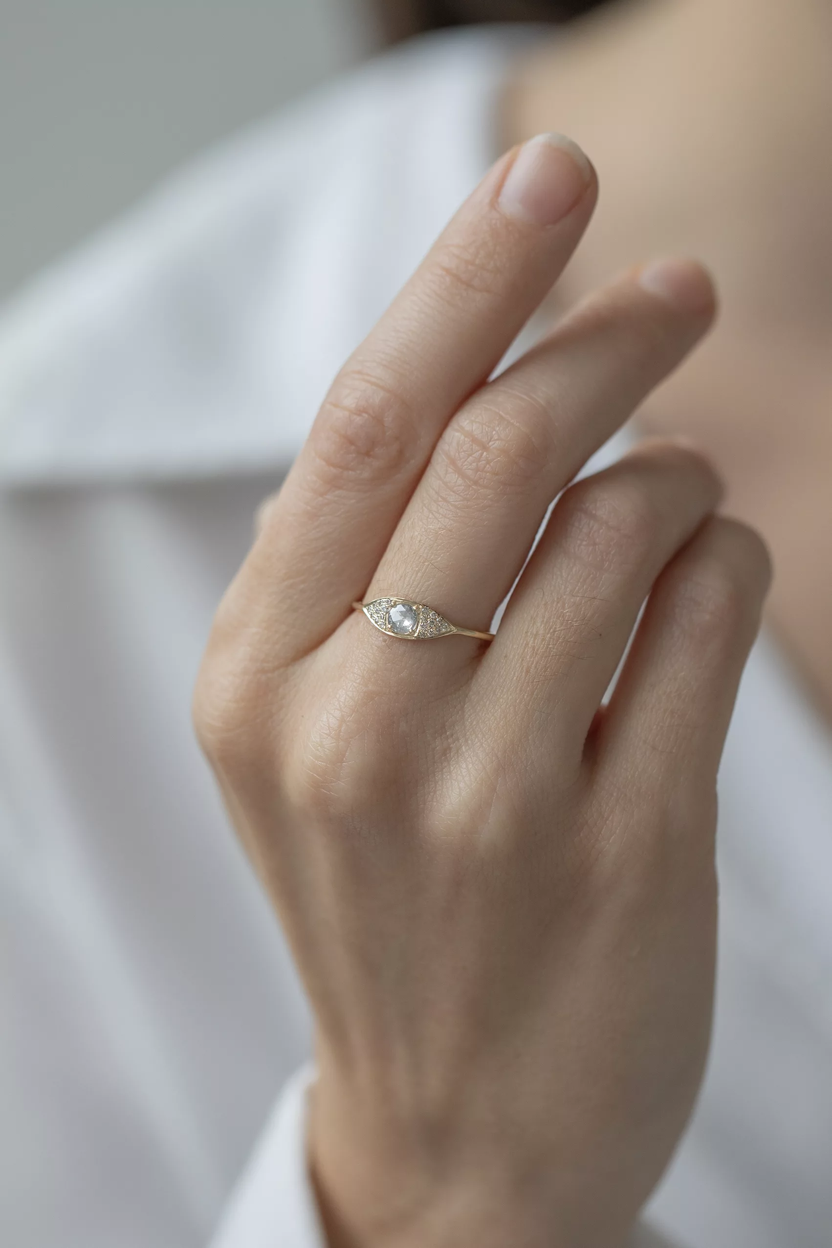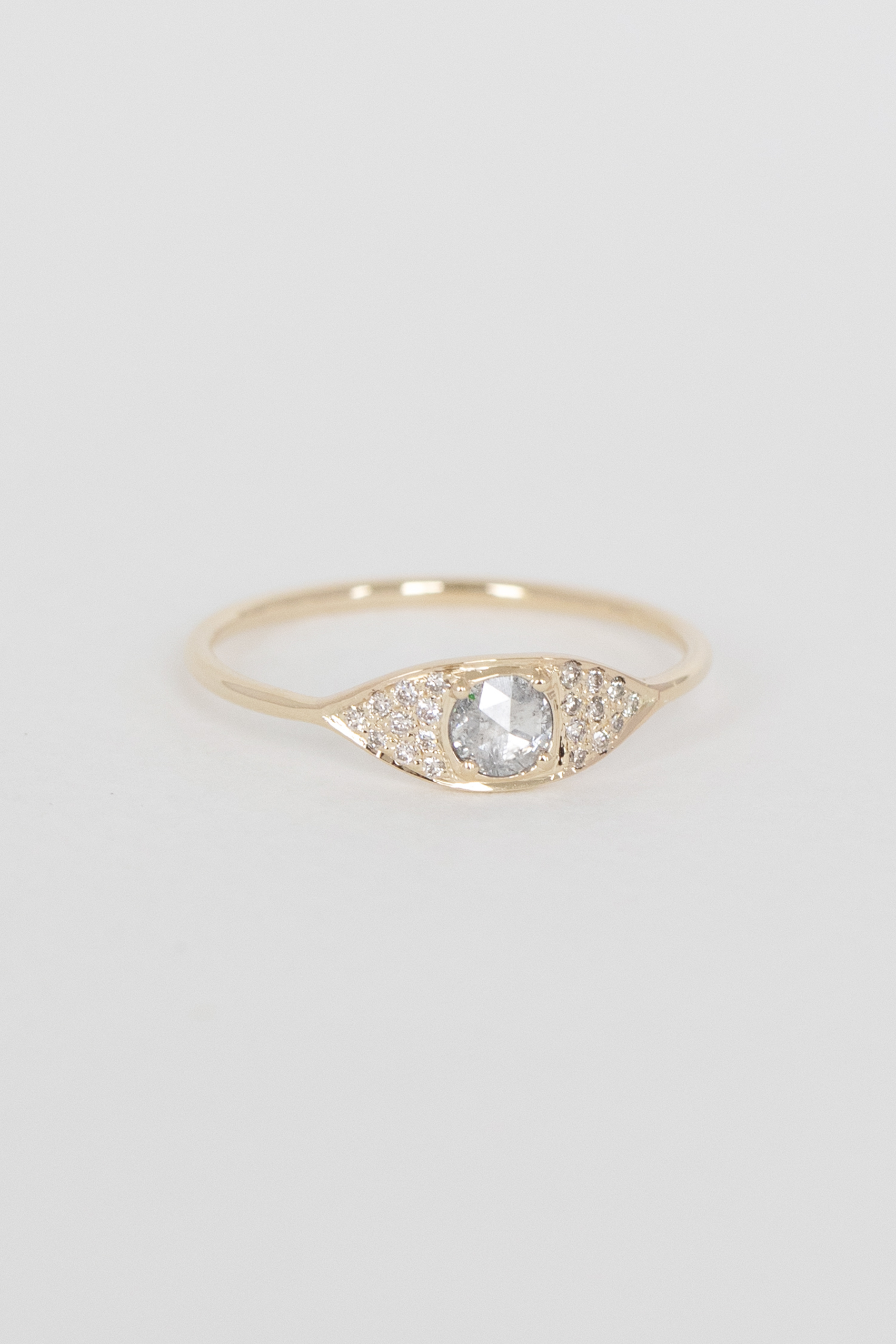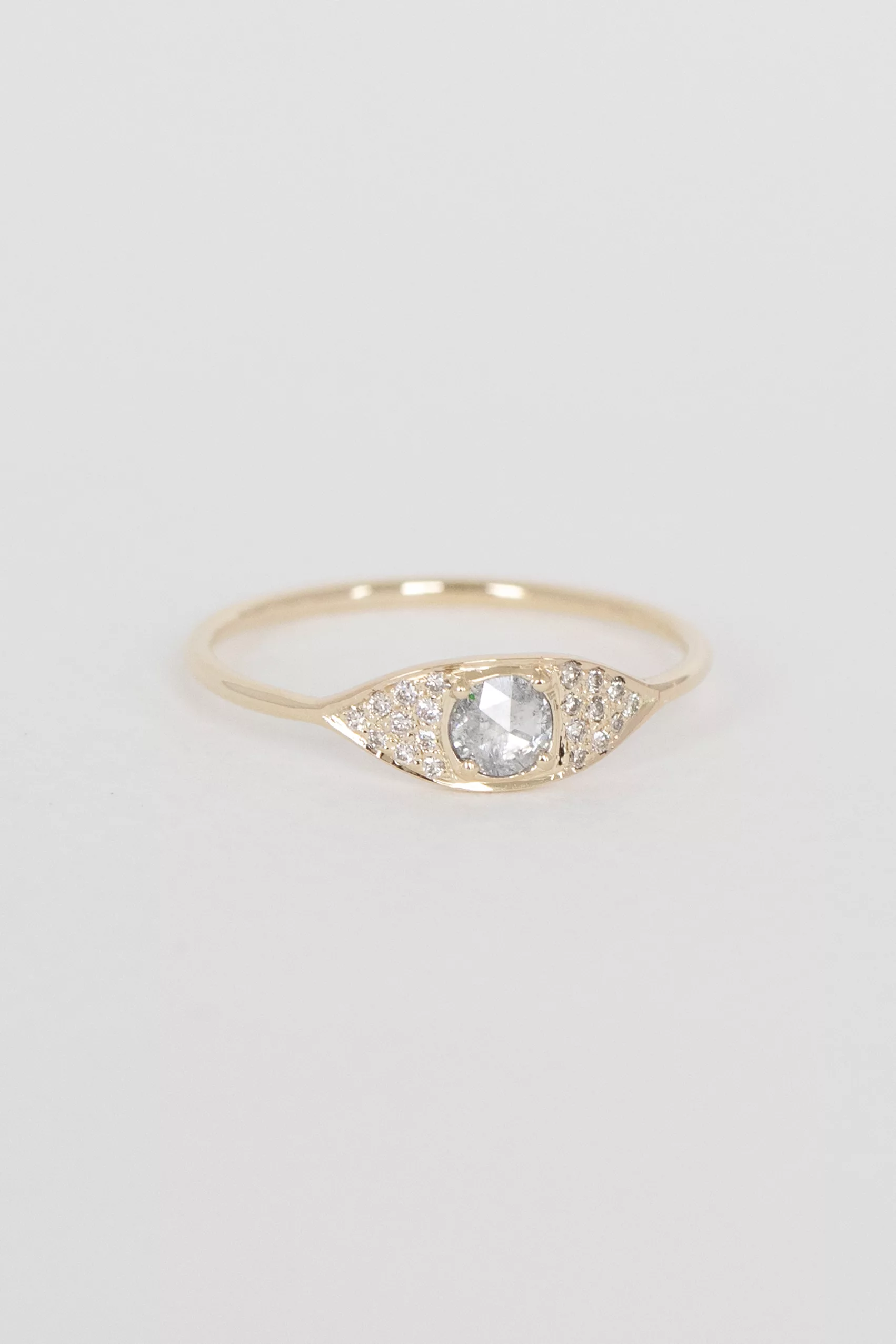 Celine Daoust 14k yellow gold full eye ring with one rose cut grey diamond and diamonds. The stone color is a gradient of dark and light grey.