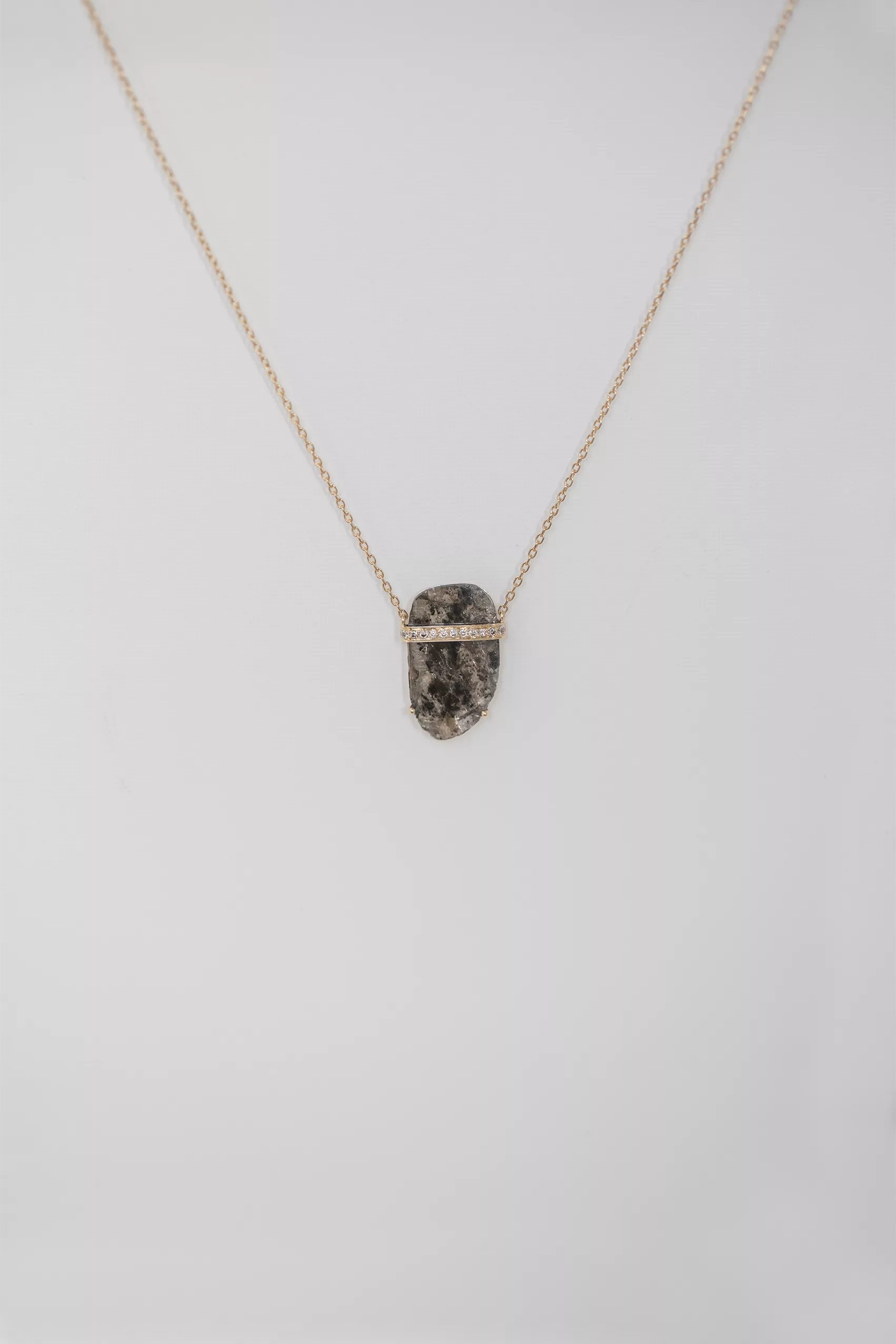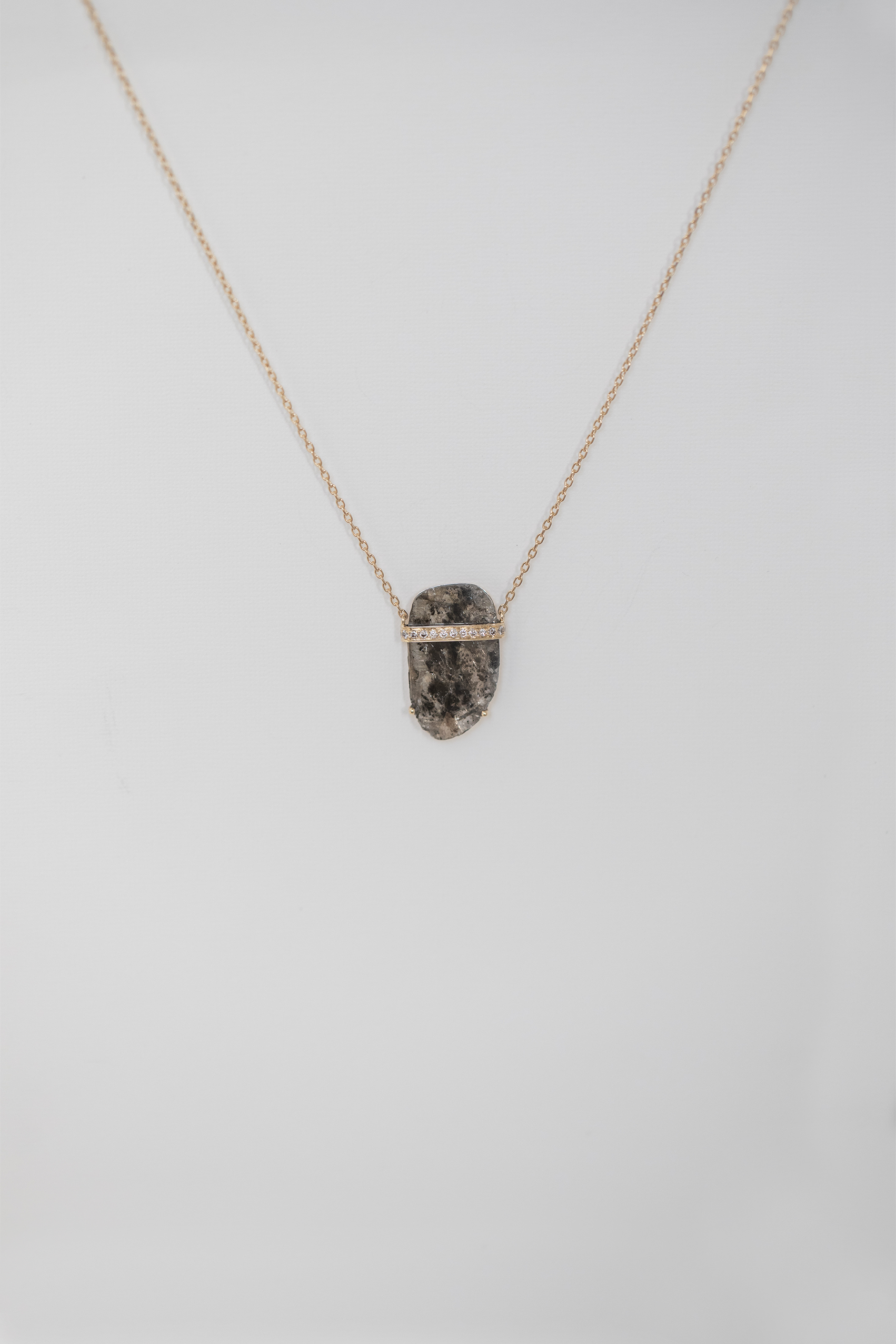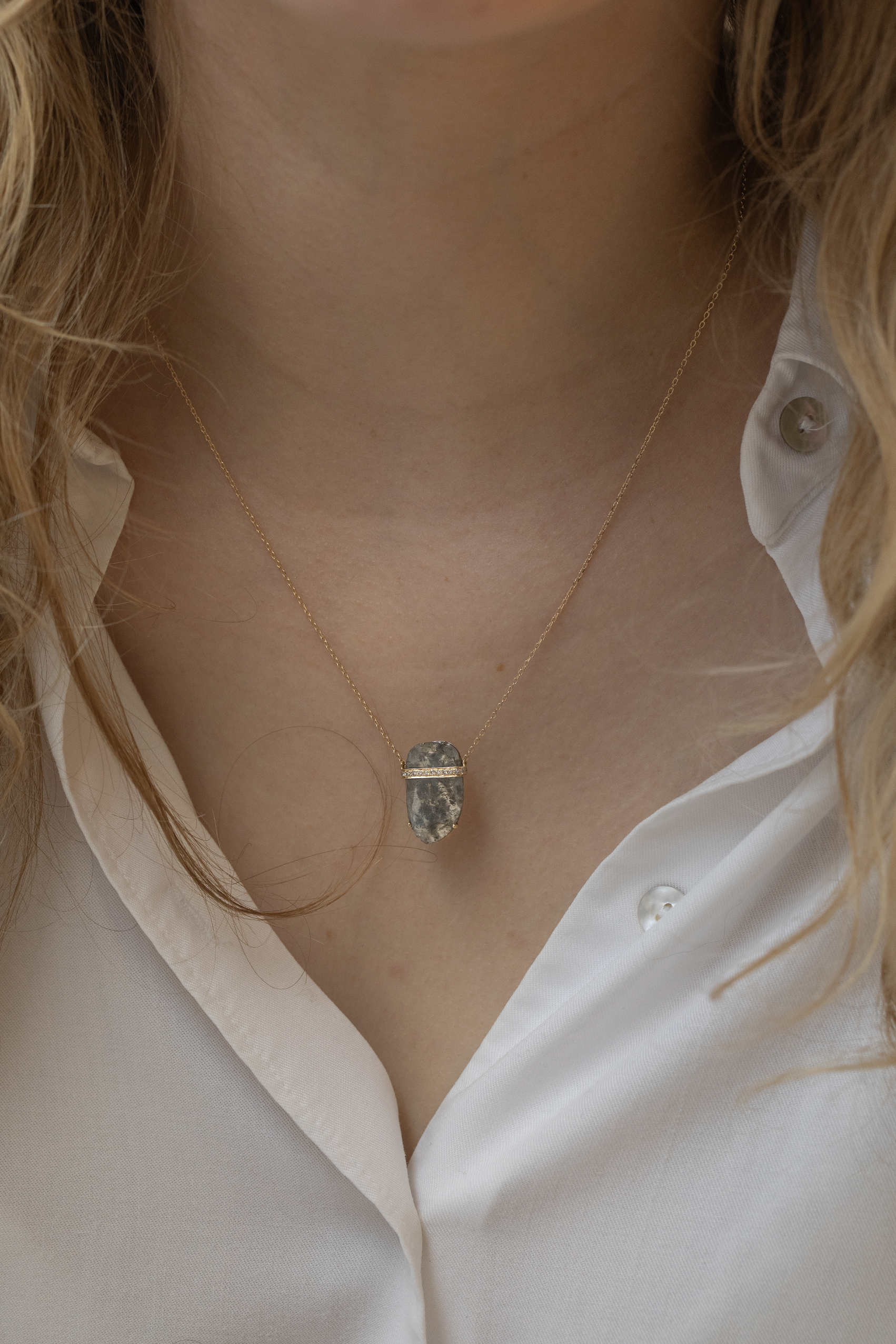 Celine Daoust 14k light yellow gold necklace with a rough pencil grey diamond and diamonds. The stone comes in a gradient of light and dark grey.