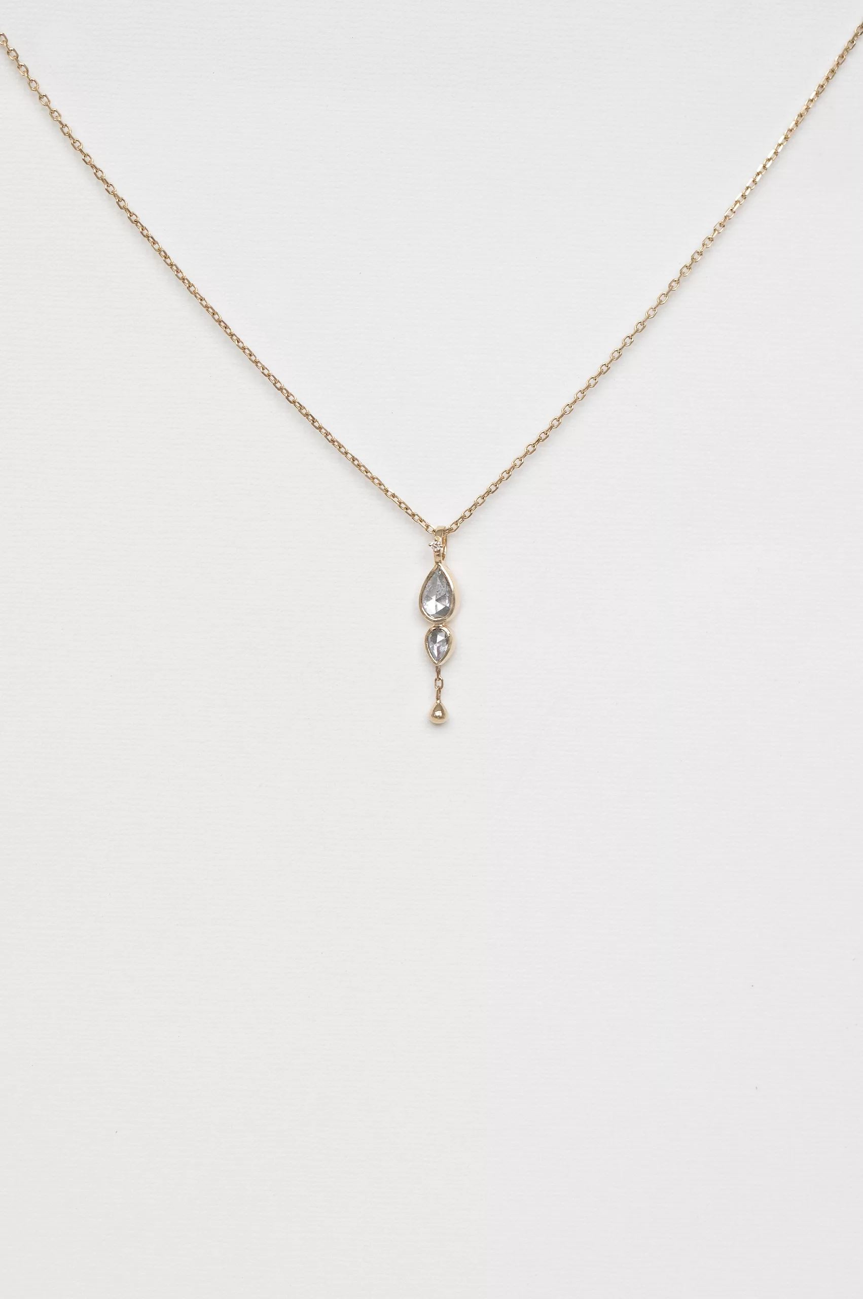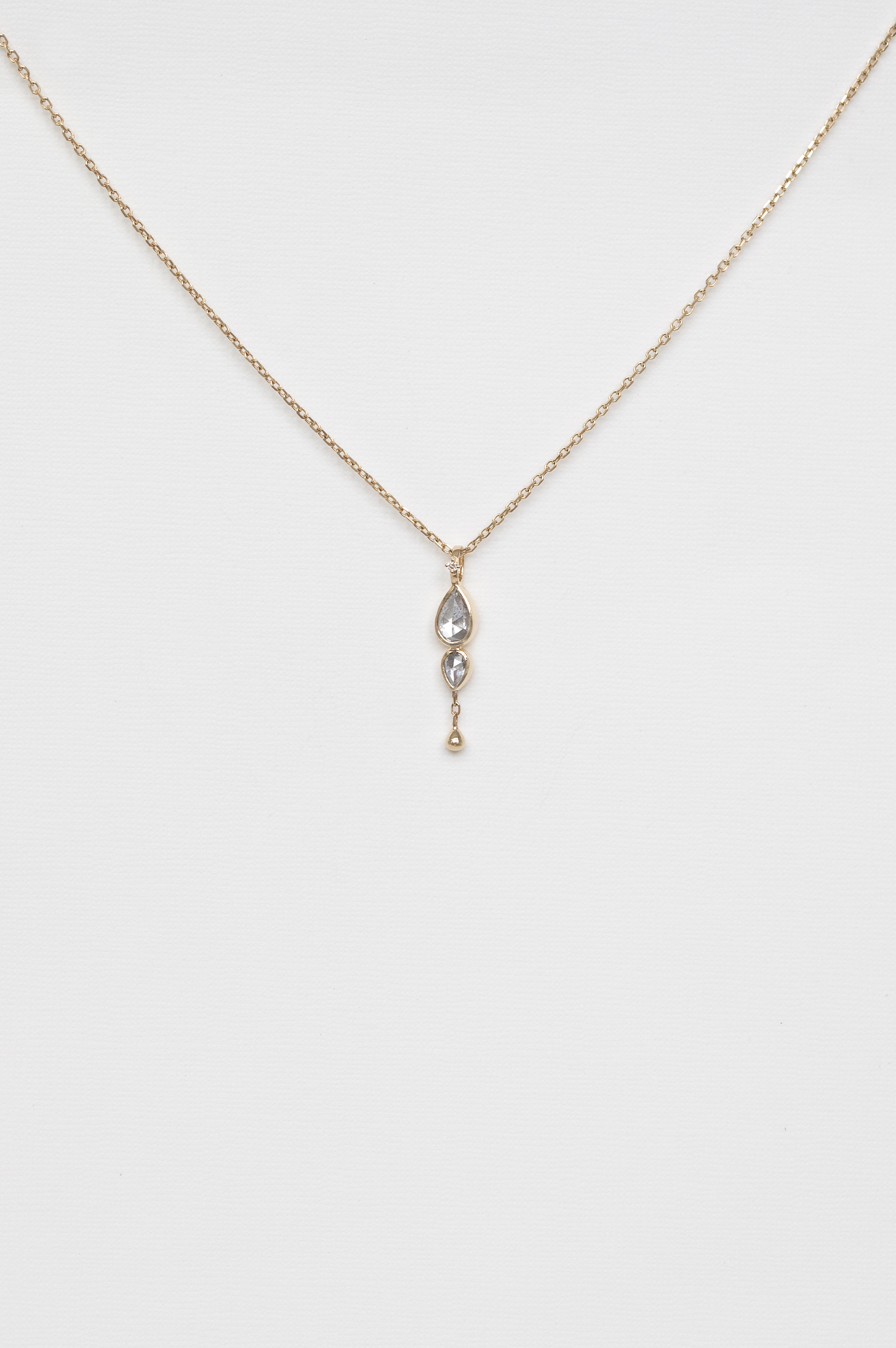 Celine Daoust 14k light yellow gold chain necklace with one pear shaped grey diamond, one rose cut grey diamond, and dangling gold ball. The stone comes in a gradient of light and dark grey.