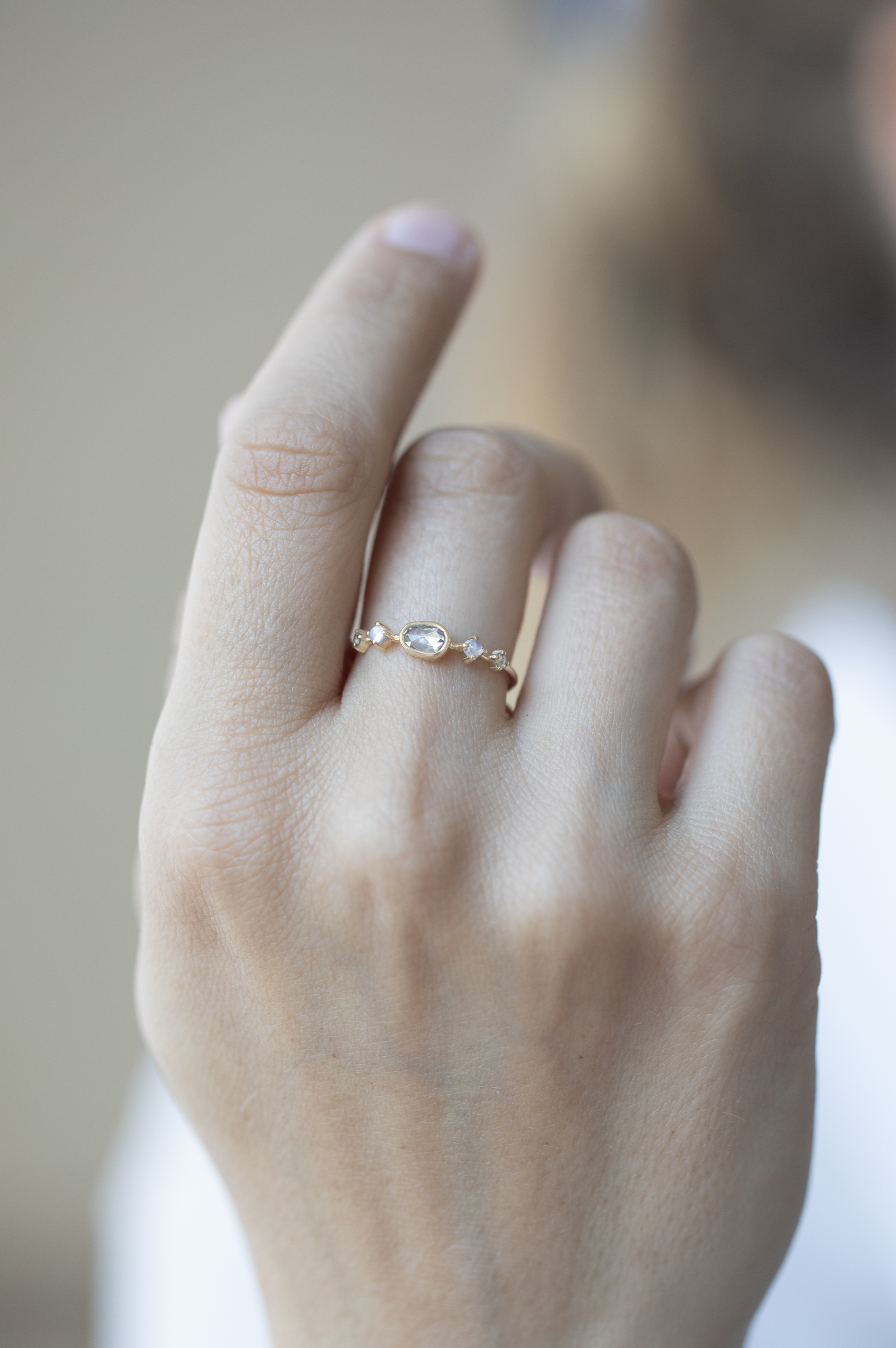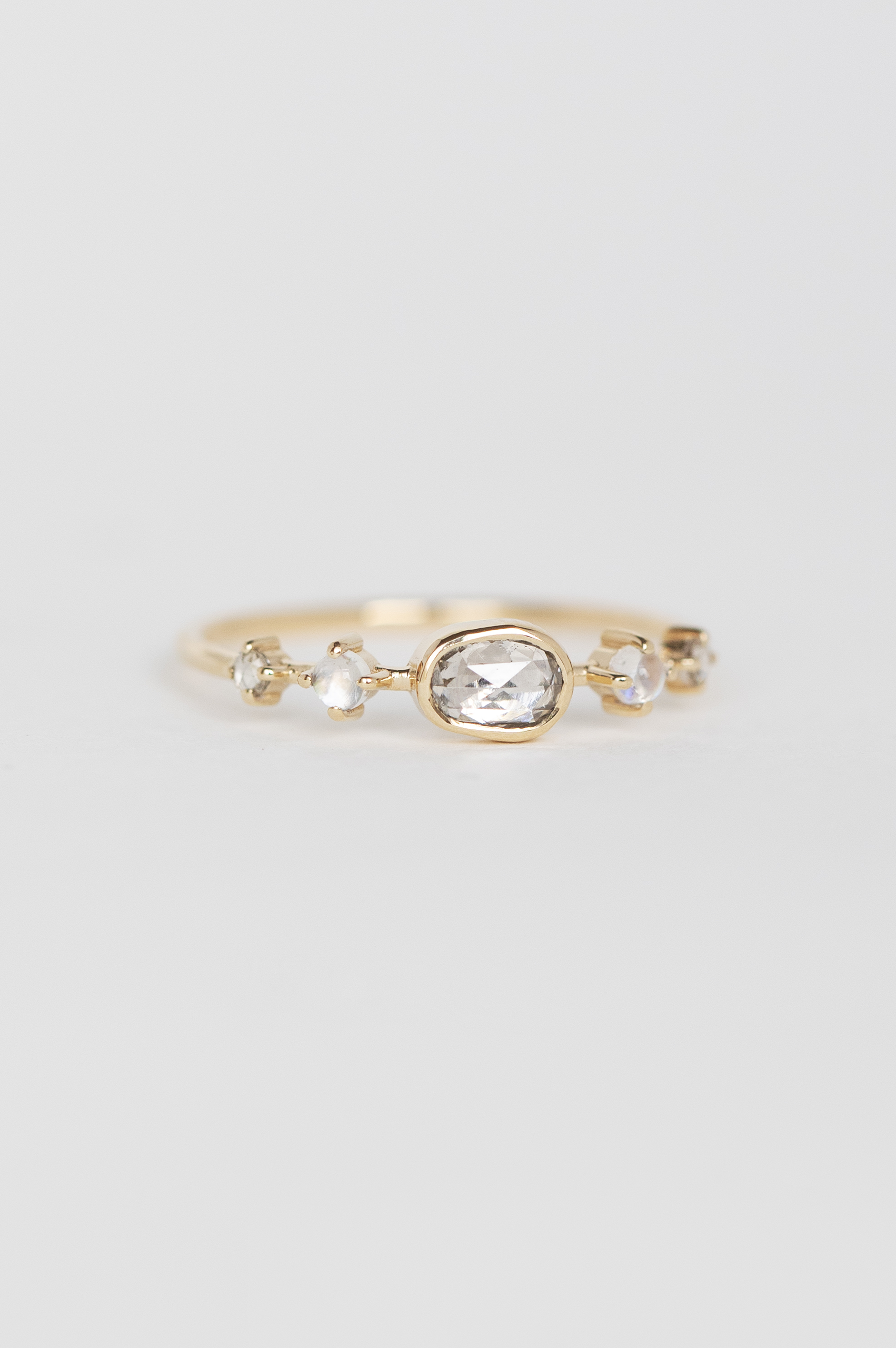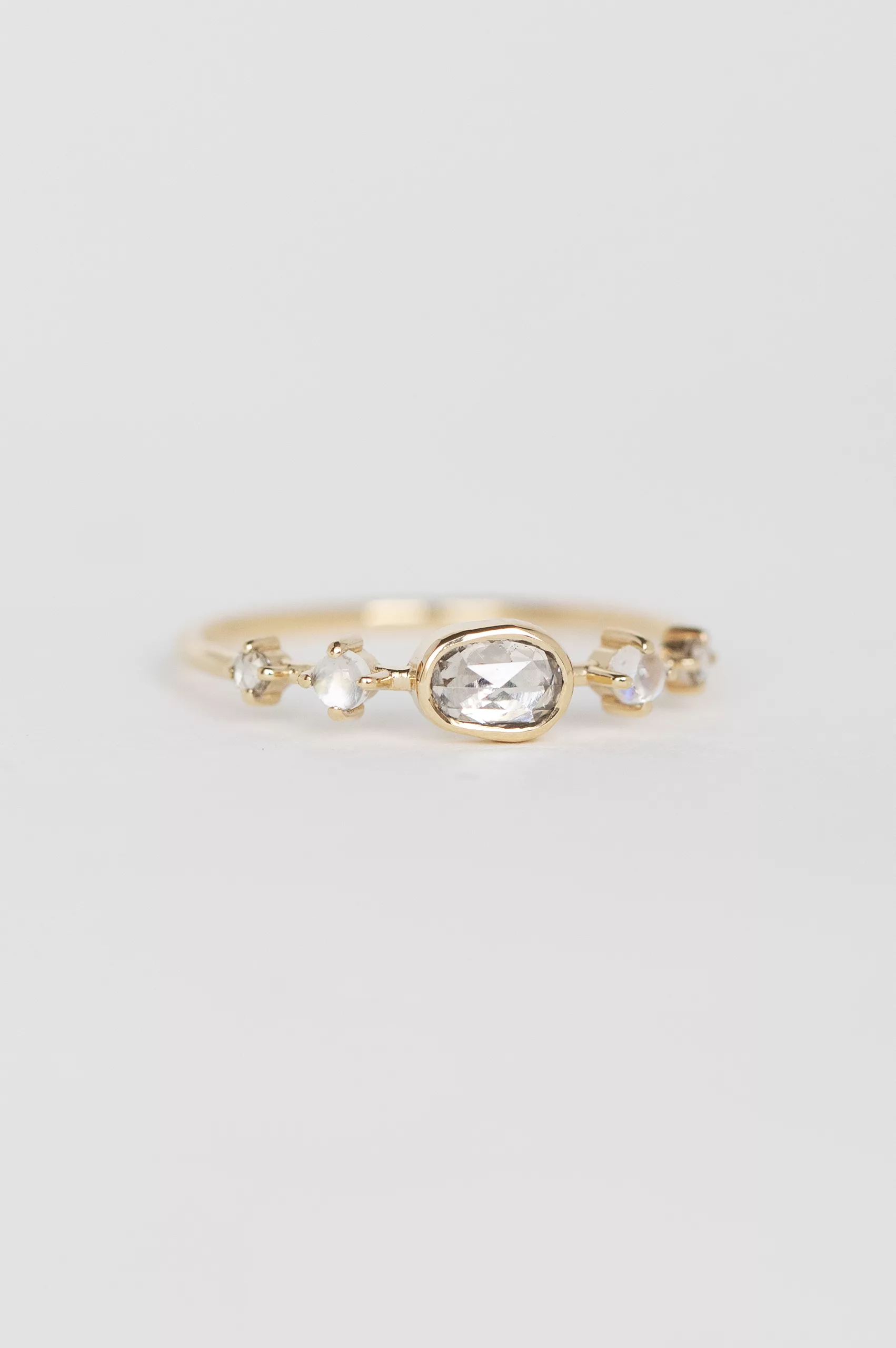 Celine Daoust 14k light yellow gold ring with one central grey diamond, two moonstones and two diamonds. The stone comes in a gradient of light and dark grey.