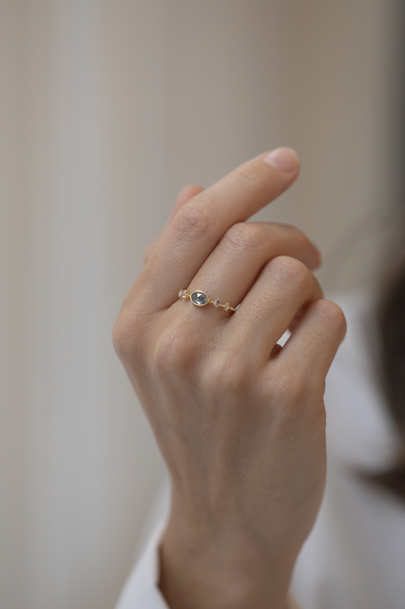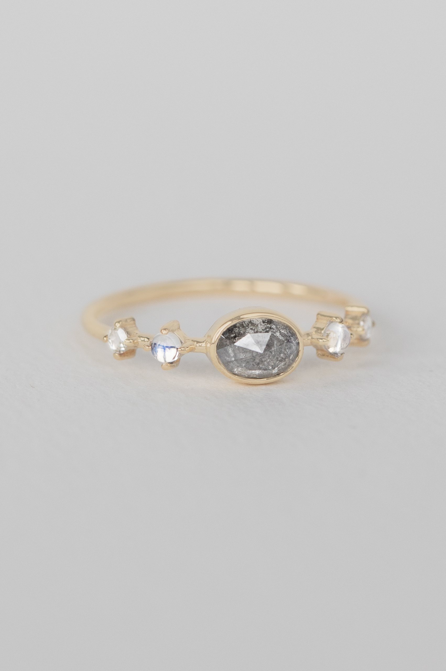 Celine Daoust 14k light yellow gold ring with one central grey diamond, two moonstones and two diamonds. The stone comes in a gradient of light and dark grey.