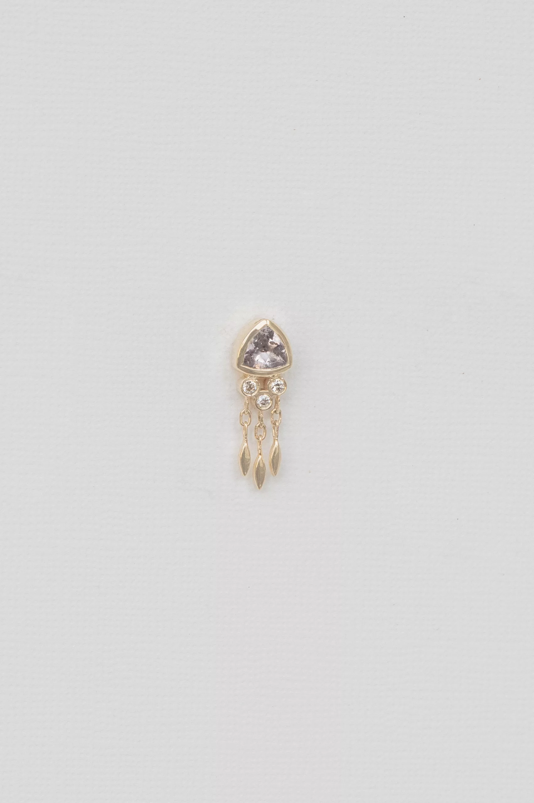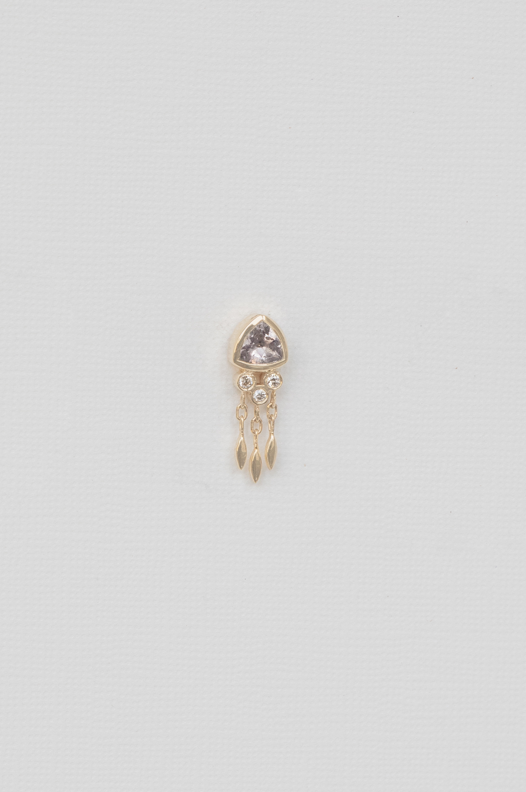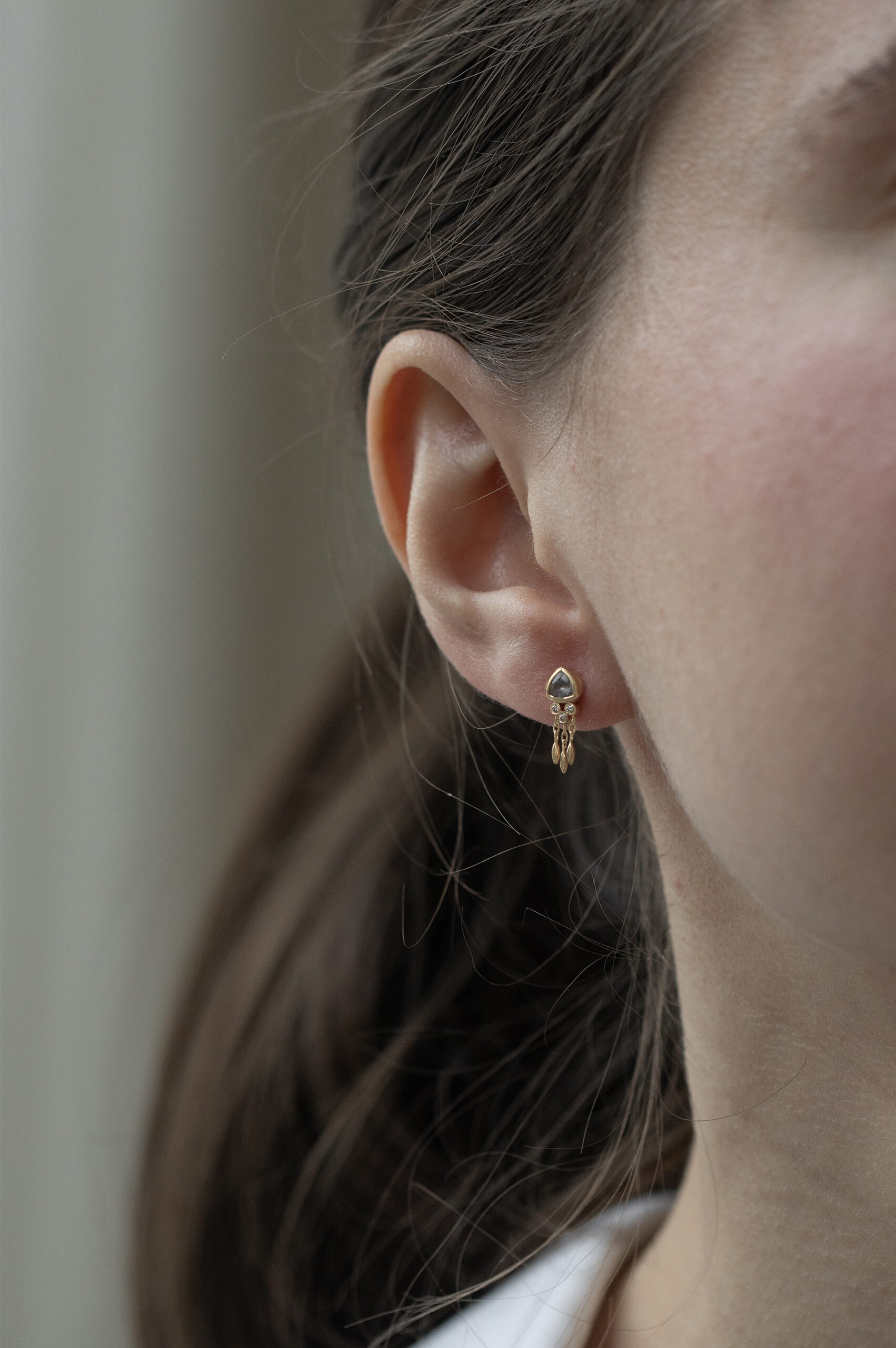 Céline Daoust 14kt light yellow gold earring with one grey tourmaline, diamonds and dangling details. The color stone is a light grey.