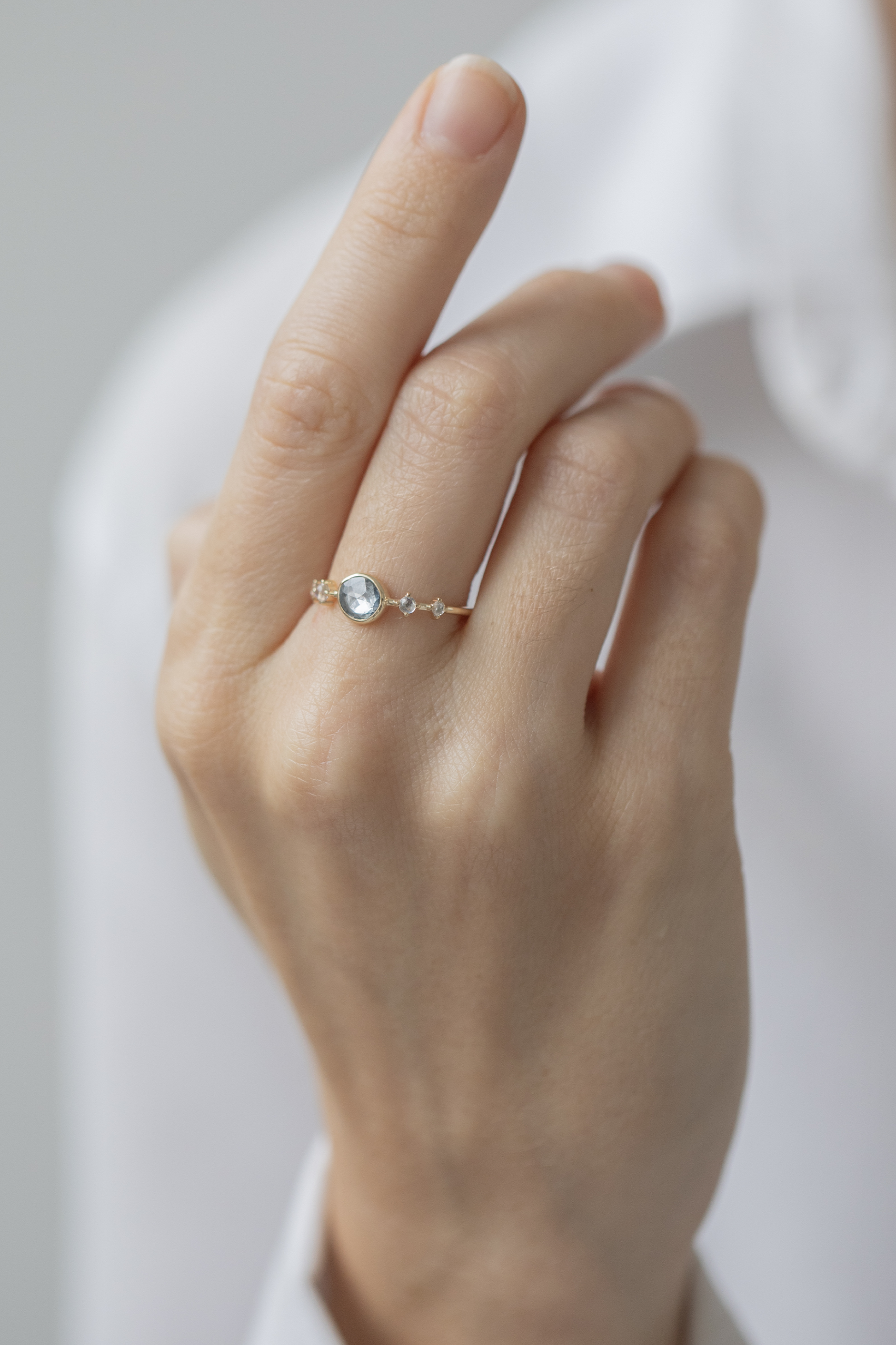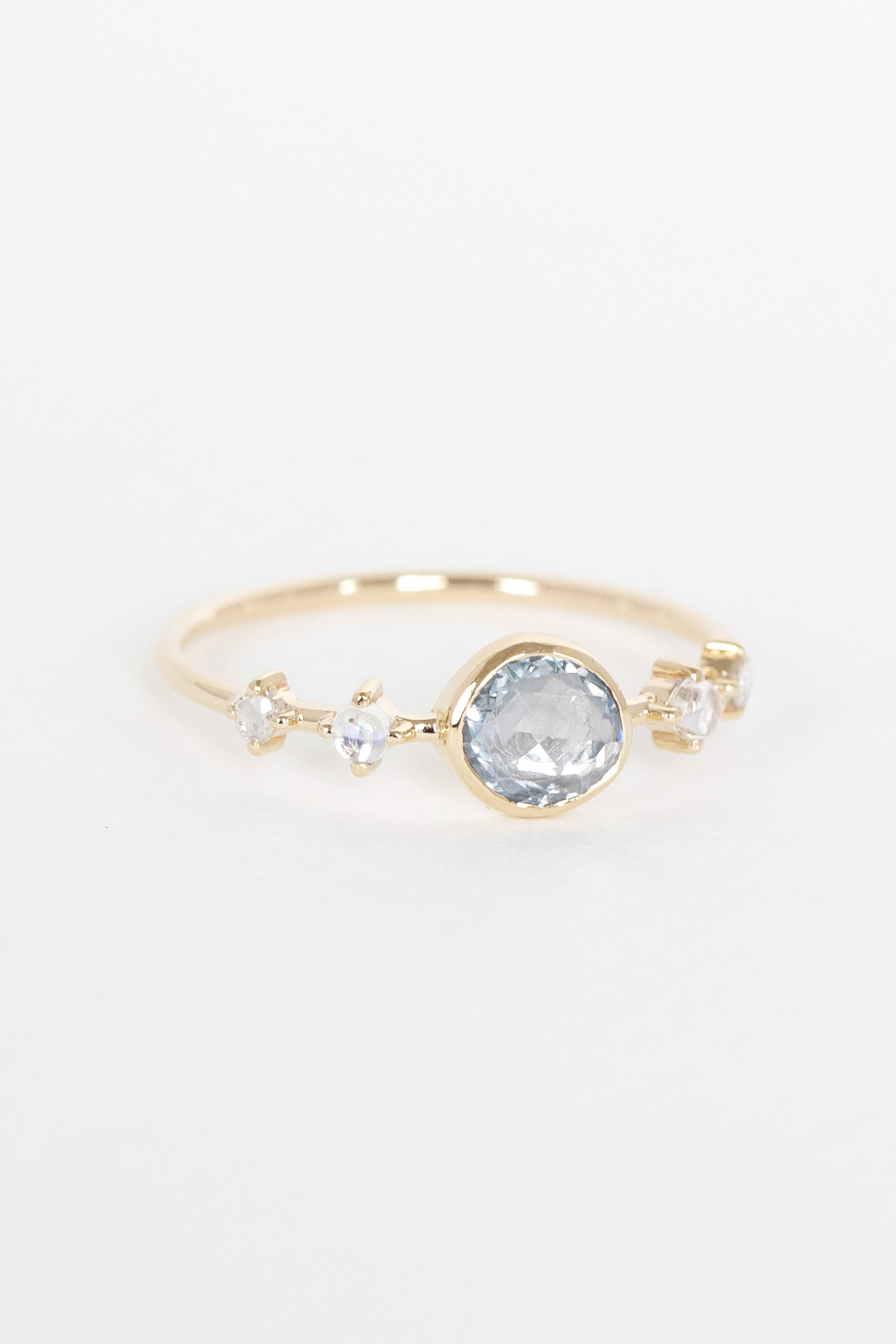 Celine Daoust 14k light yellow gold ring with one light blue central sapphire, two moonstones and two diamonds. The stone comes in gradient of light blue.