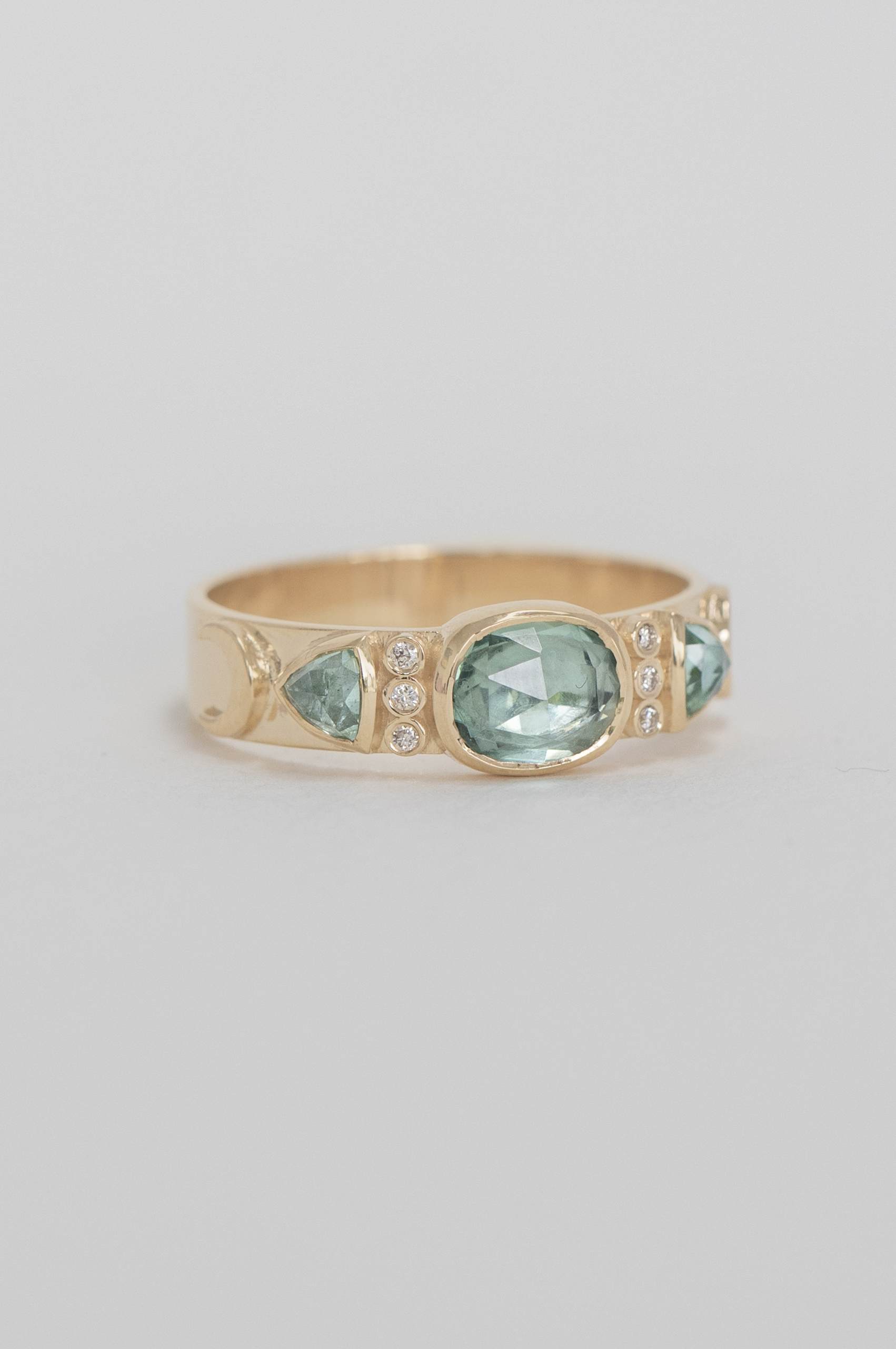 Celine Daoust 14k light yellow gold ring with one light blue tourmaline, tourmaline triangles and rose cut diamonds. The stones come in a gradient of light blue and light turquoise.