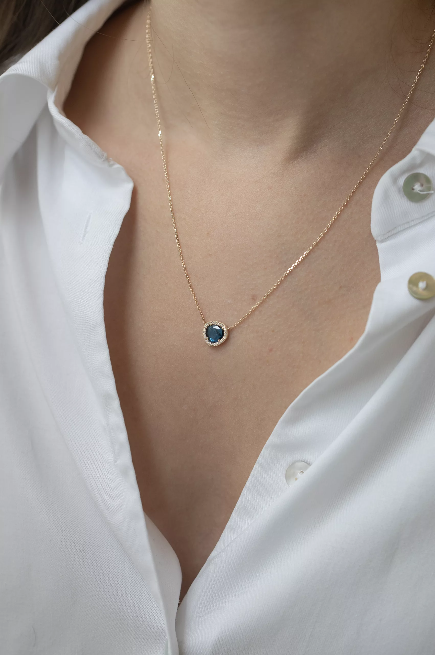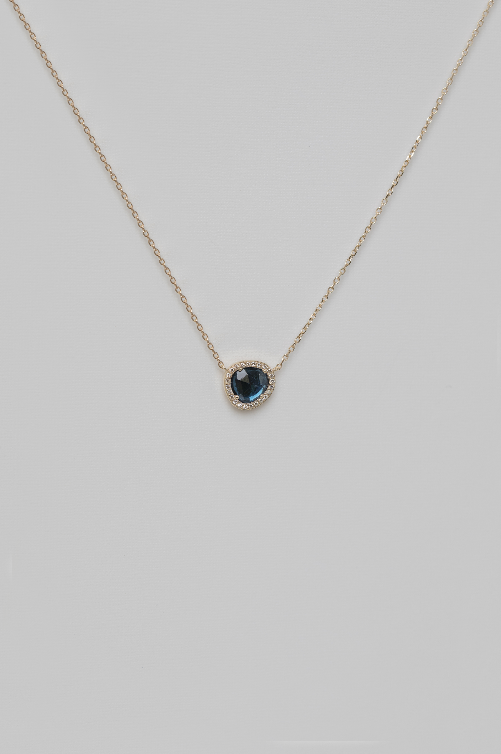 Céline Daoust 14k light yellow gold chain necklace with one tourmaline surrounded by diamonds. The stone comes in a gradient of deep blue.