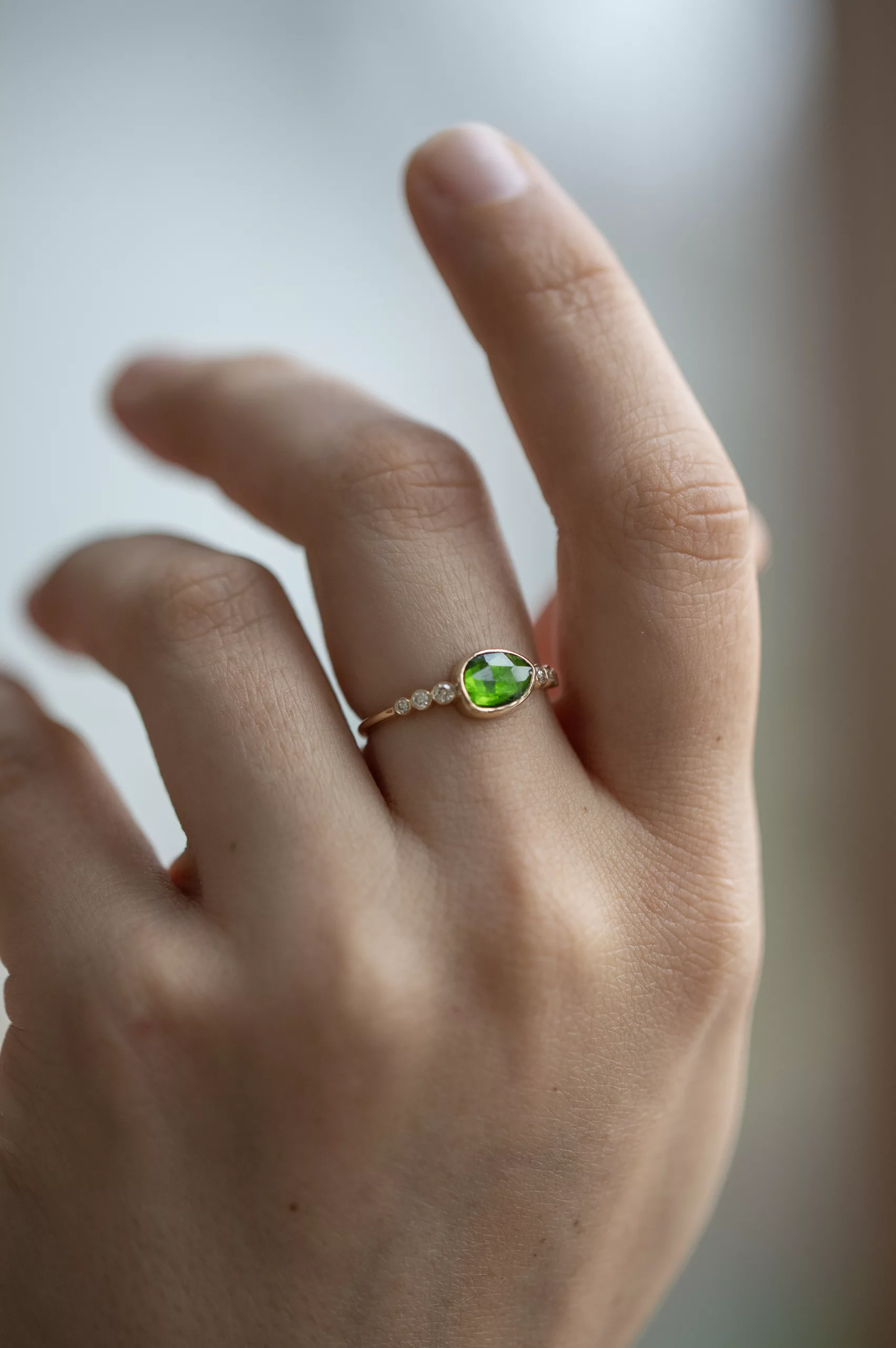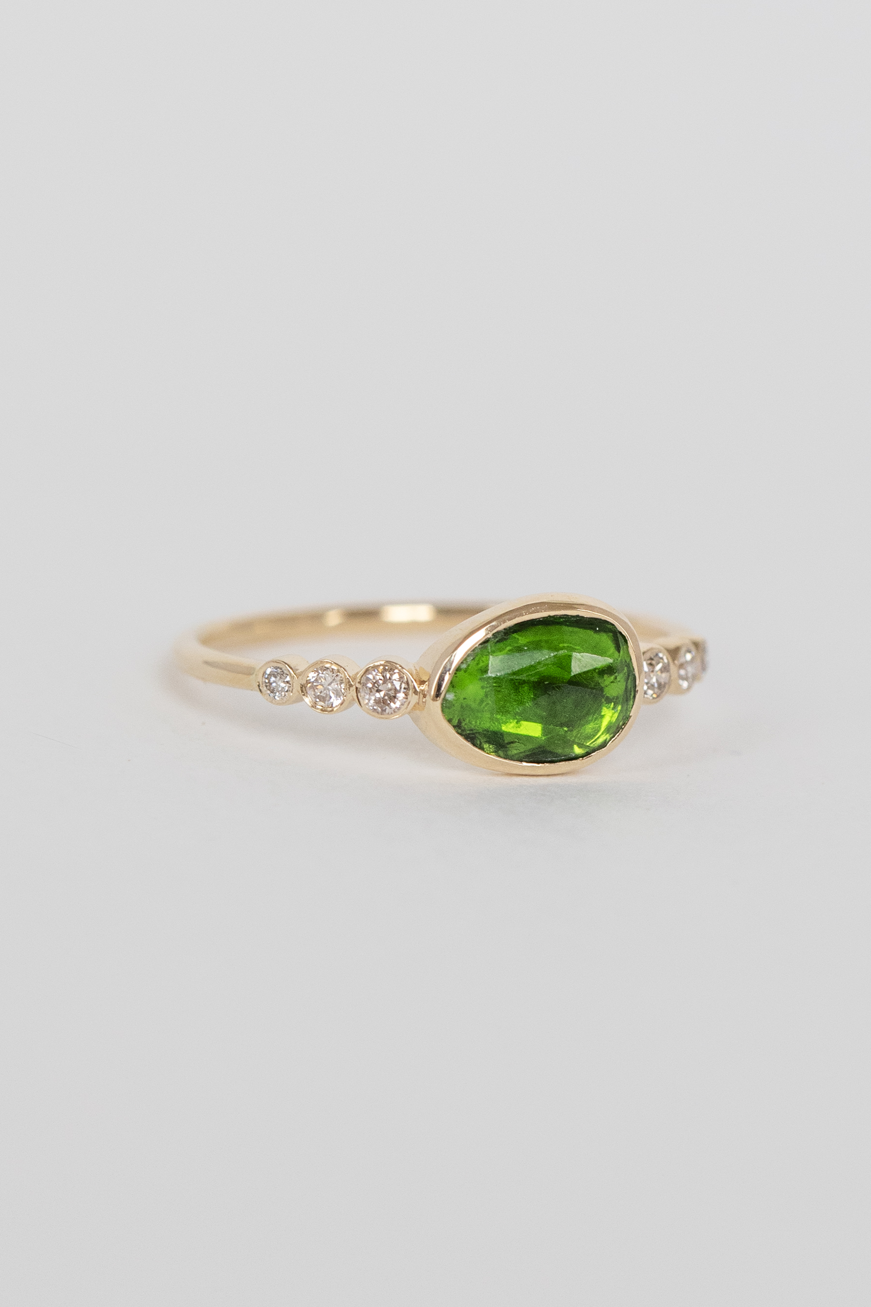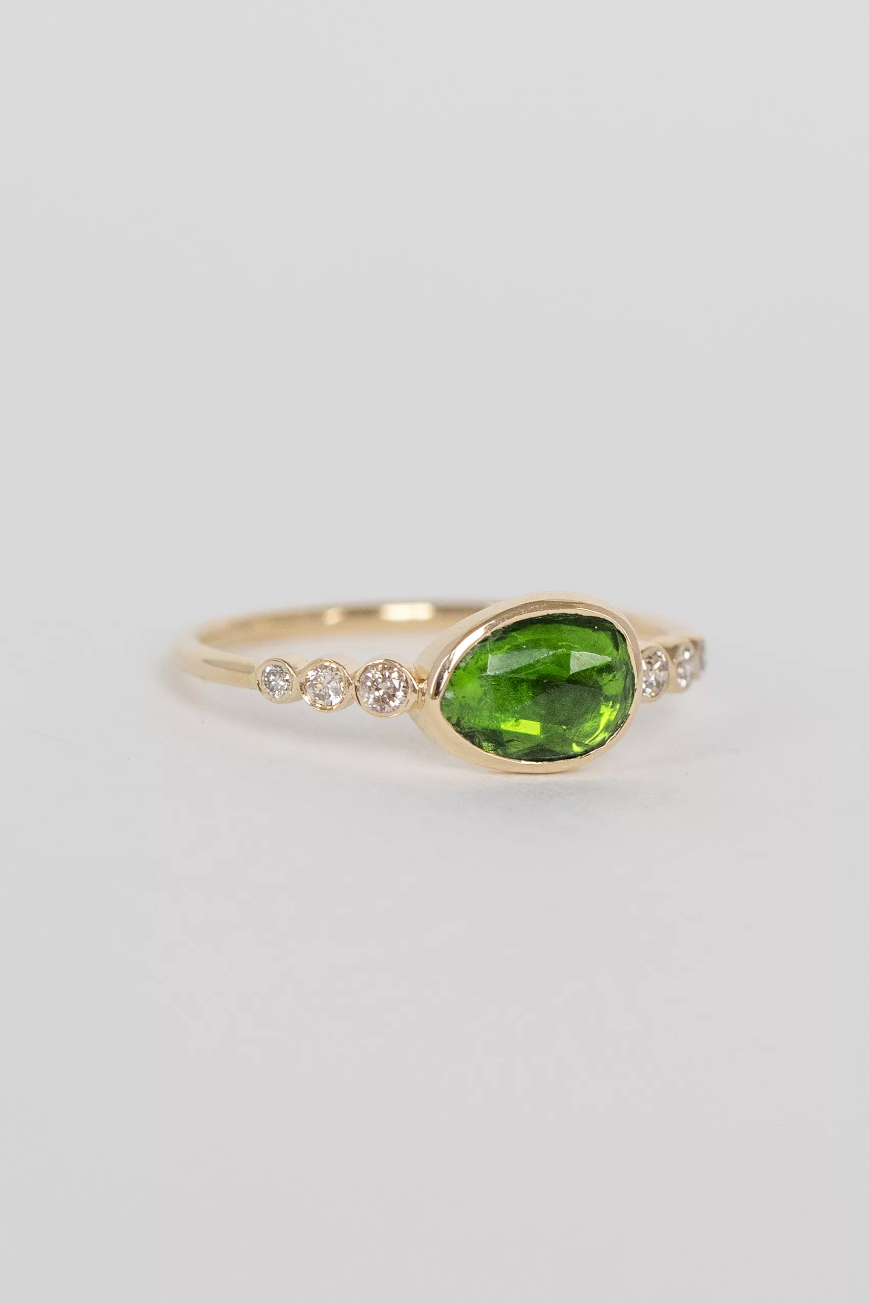 Celine Daoust 14k light yellow gold with one central light green tourmaline and six diamonds. The stone comes in a gradient of deep green.