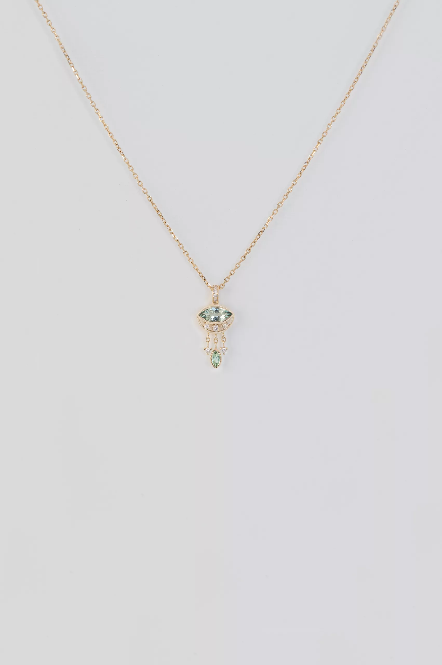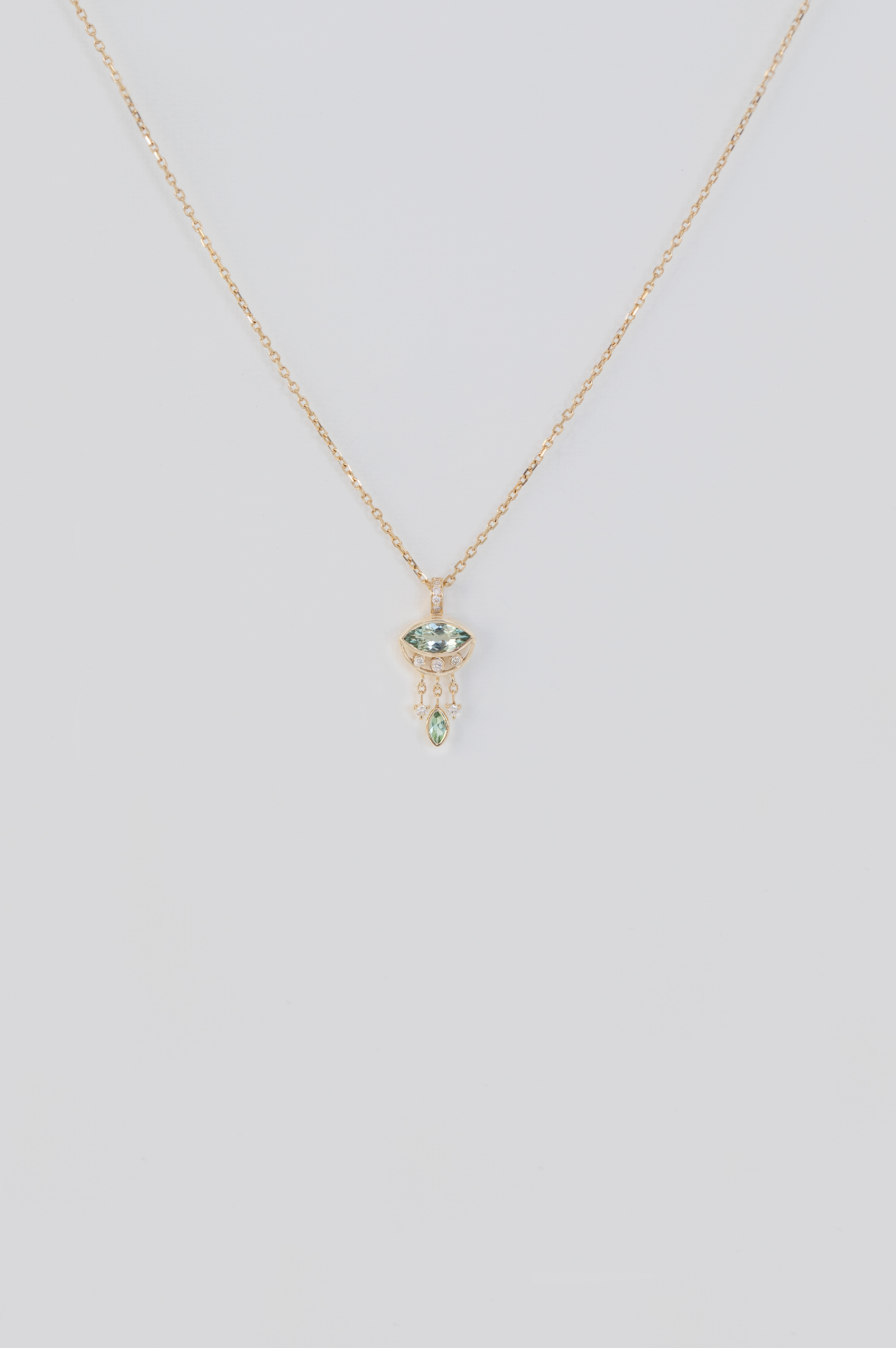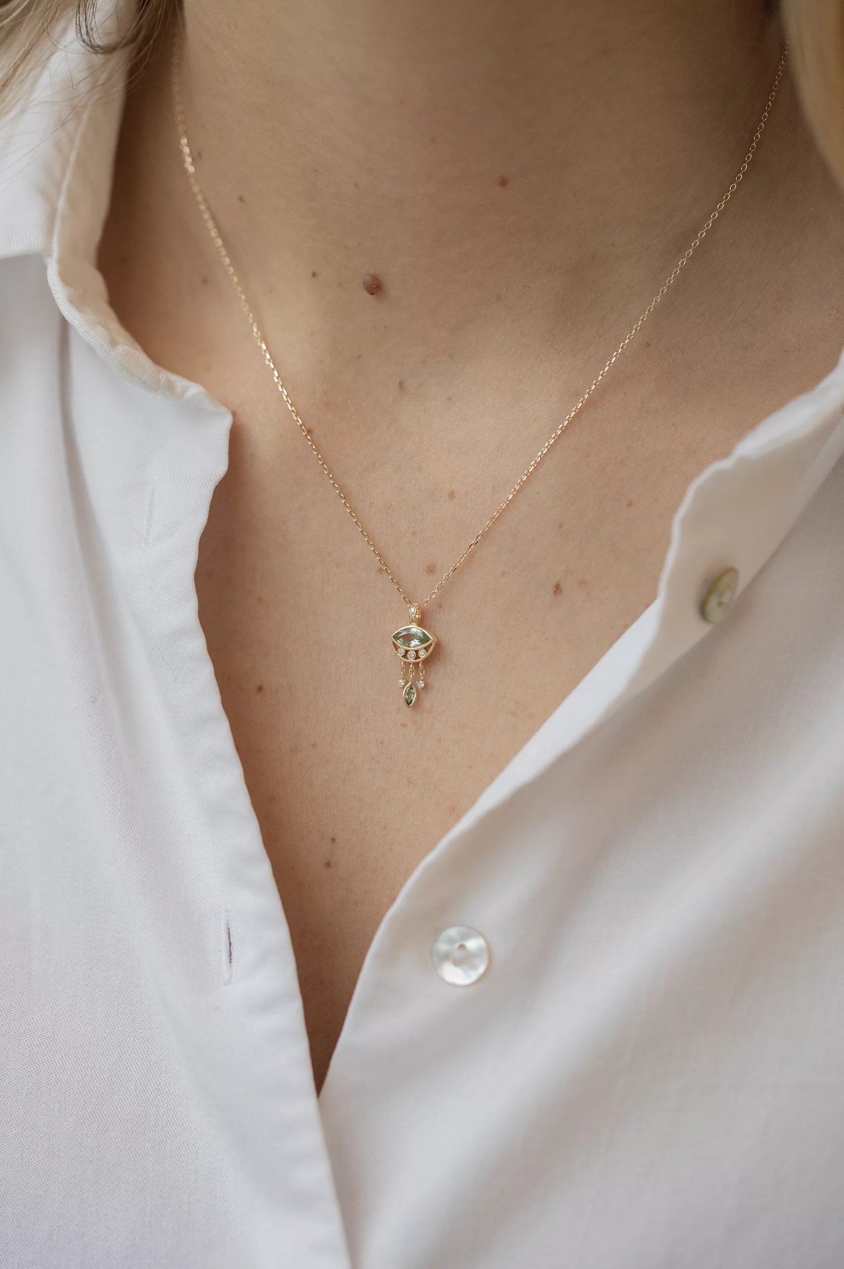 Celine Daoust 14k light yellow gold marquise light green tourmaline marquise eye & dangling details with diamonds necklace.