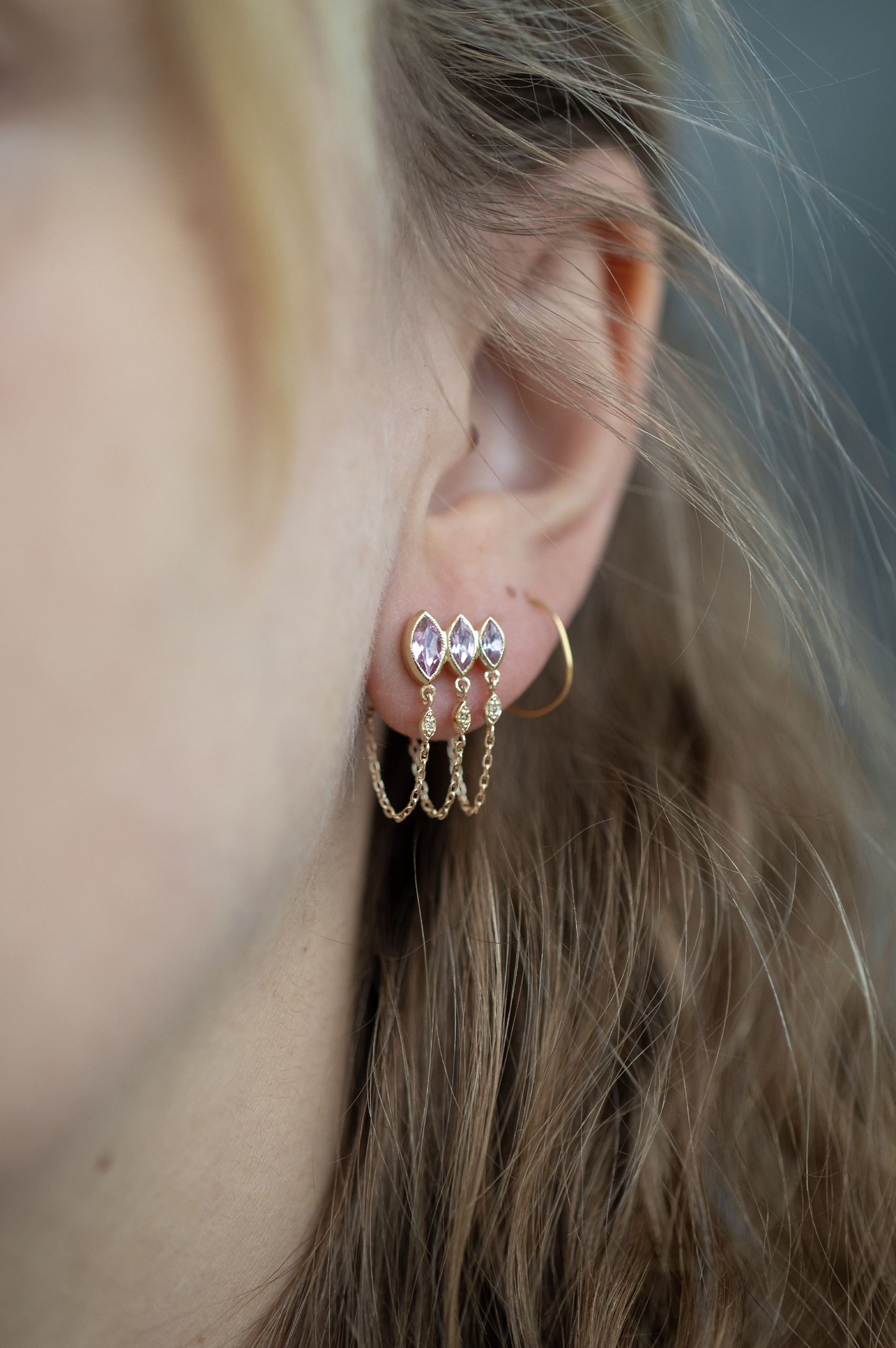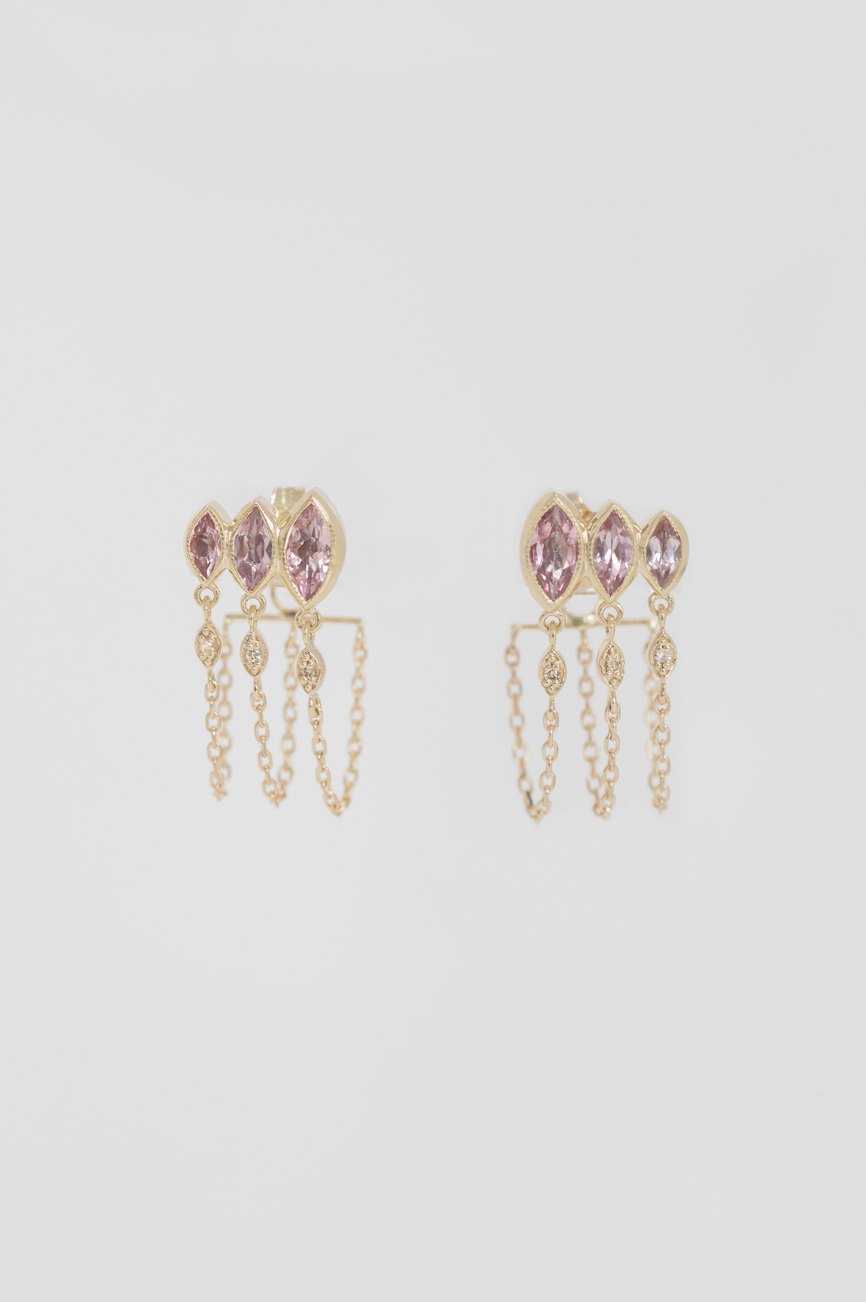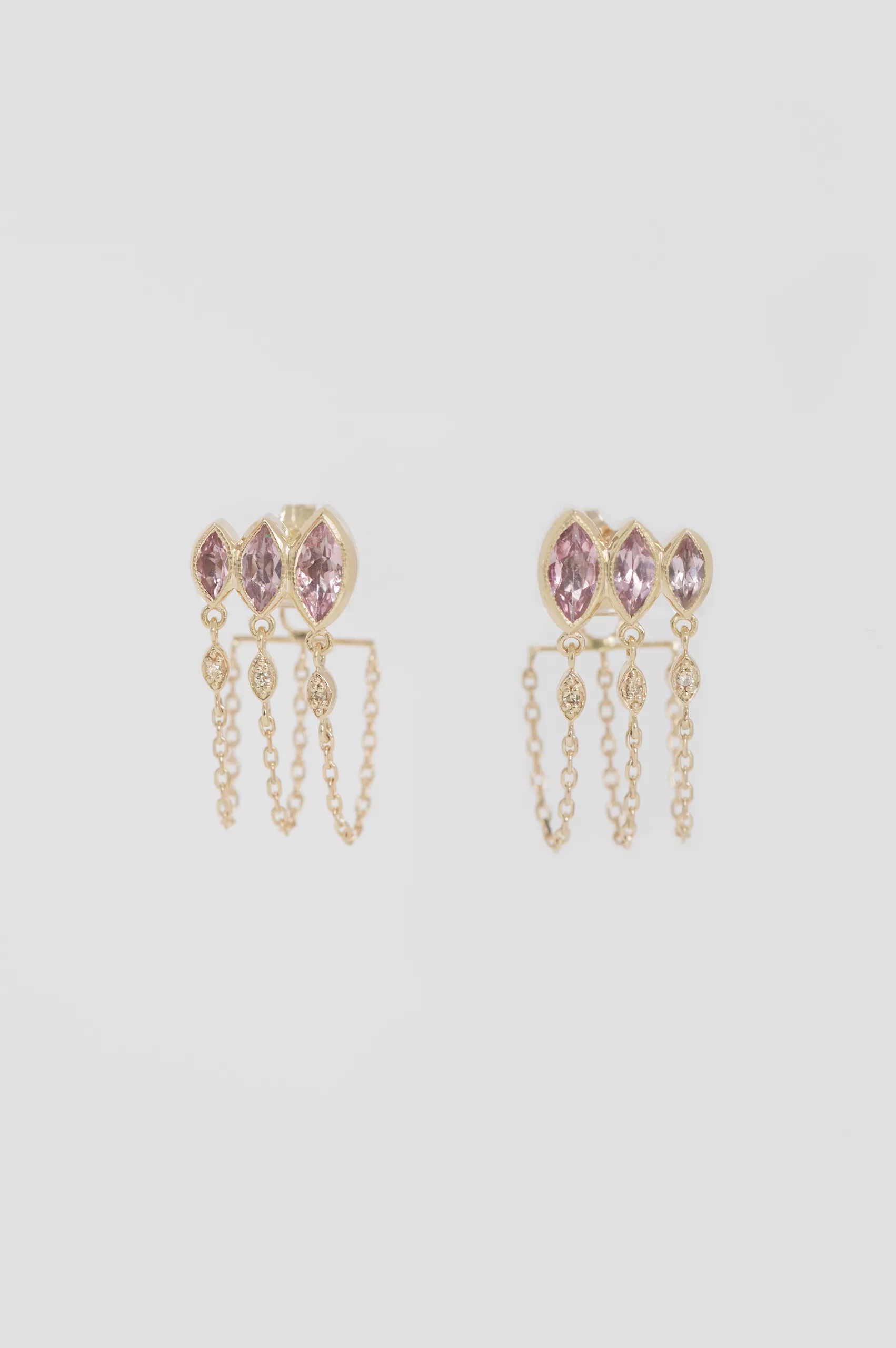 Celine Daoust 14k light yellow gold triple light pink marquise tourmaline chain earrings.