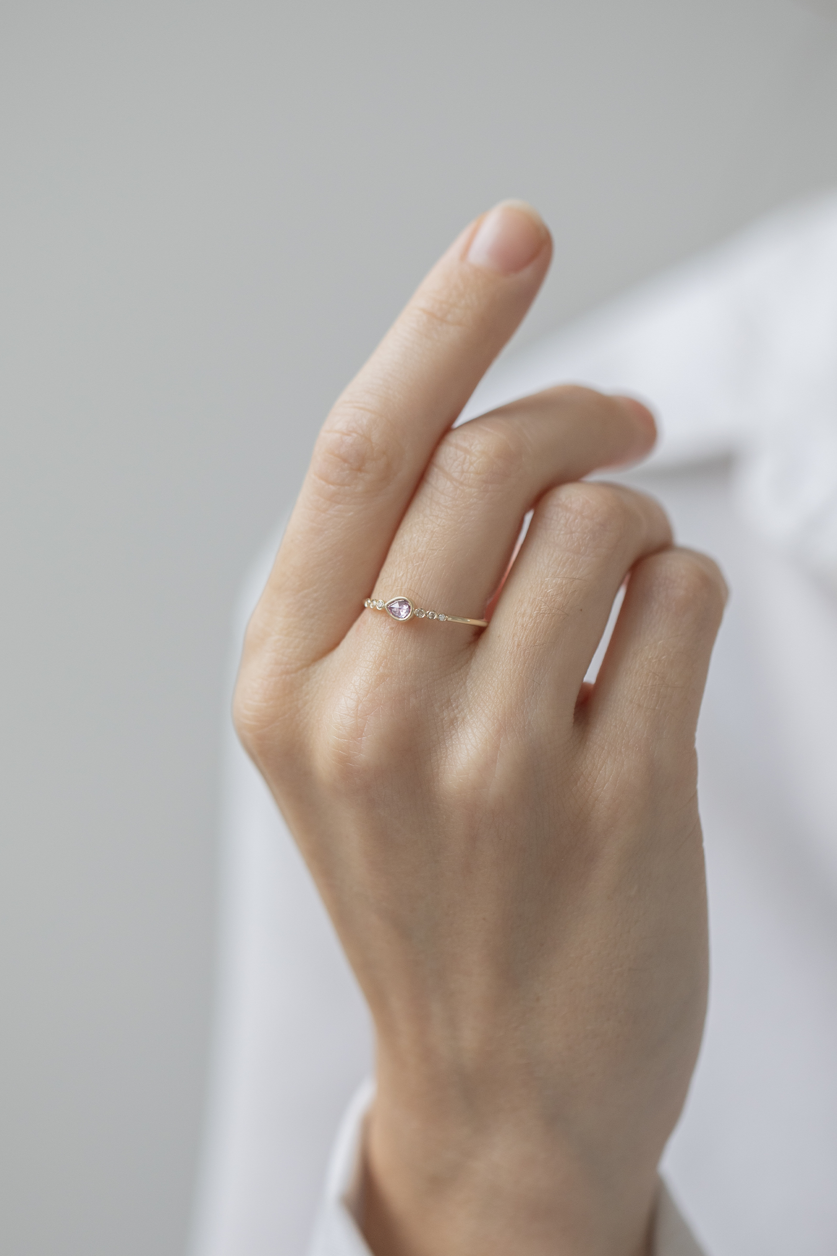 Céline Daoust 14k light yellow gold with one central light pink sapphire and six diamonds. The stone comes in a gradient of light pink.