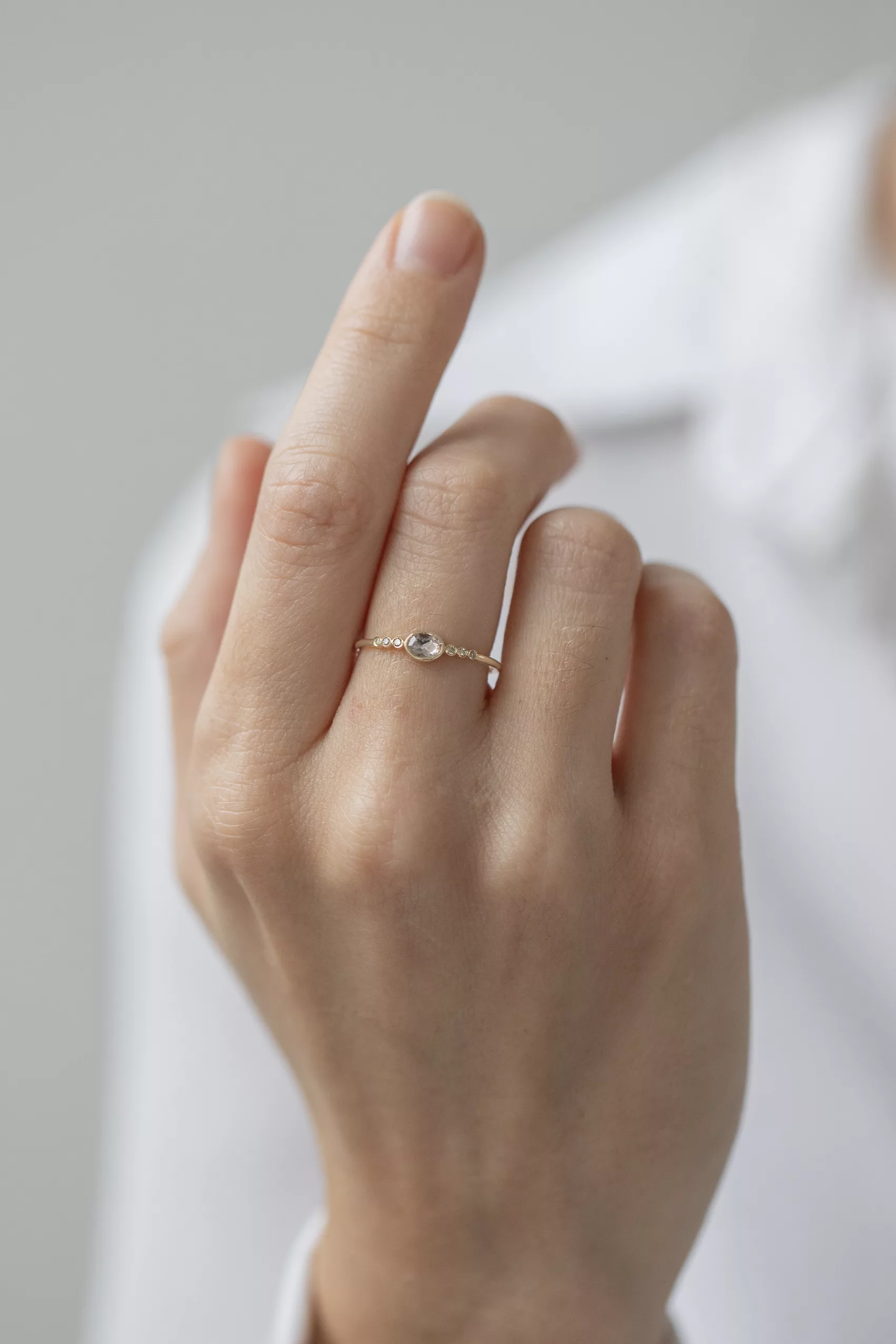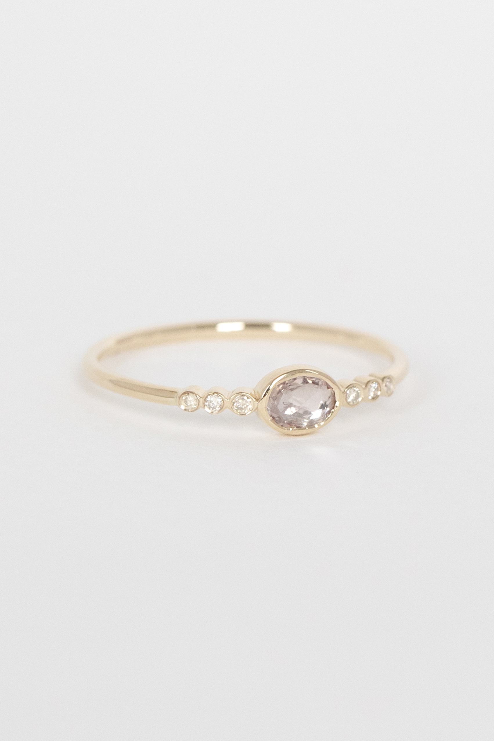 Céline Daoust 14k light yellow gold with one central light pink sapphire and six diamonds. The stone comes in a gradient of light pink.