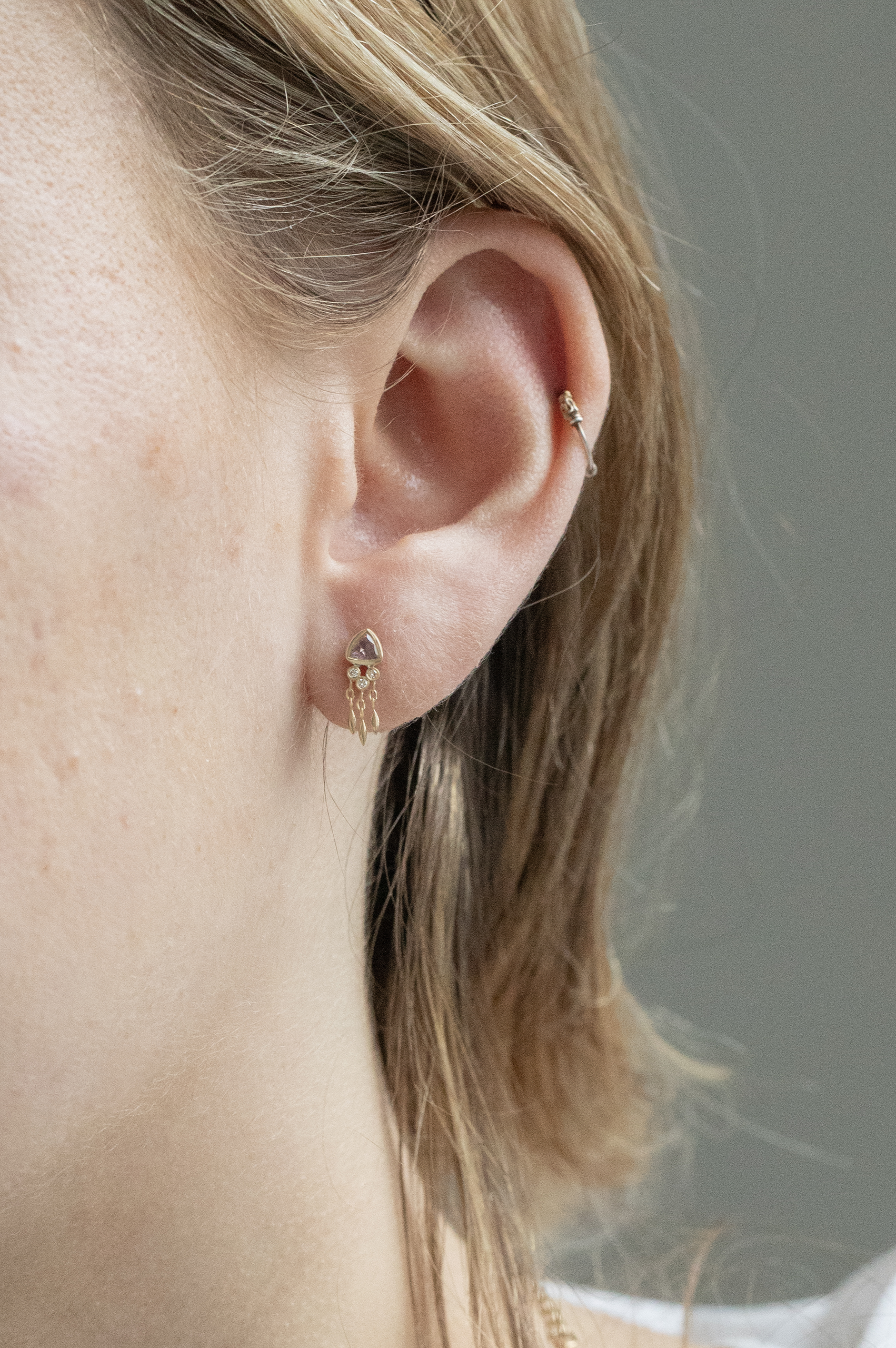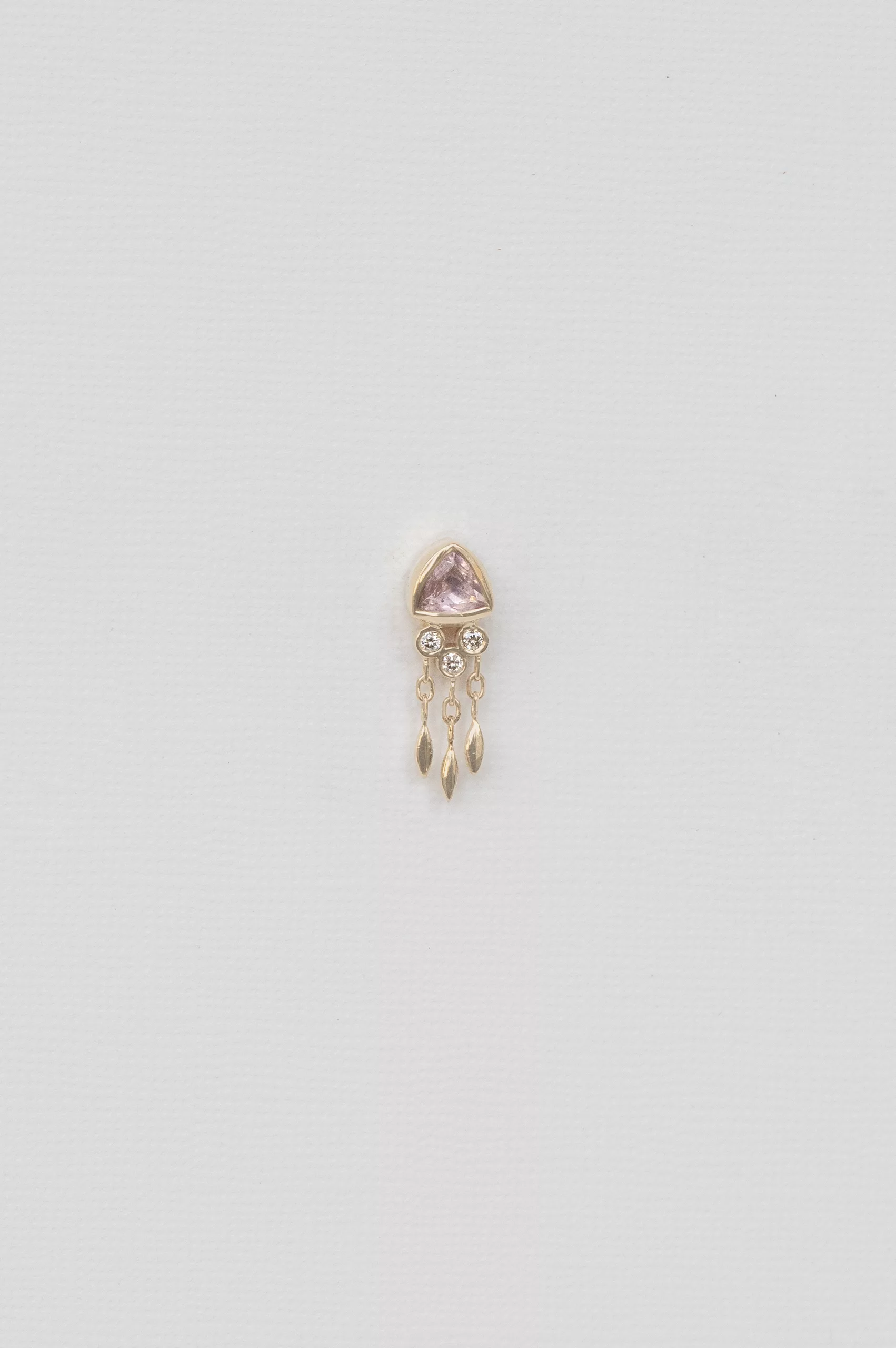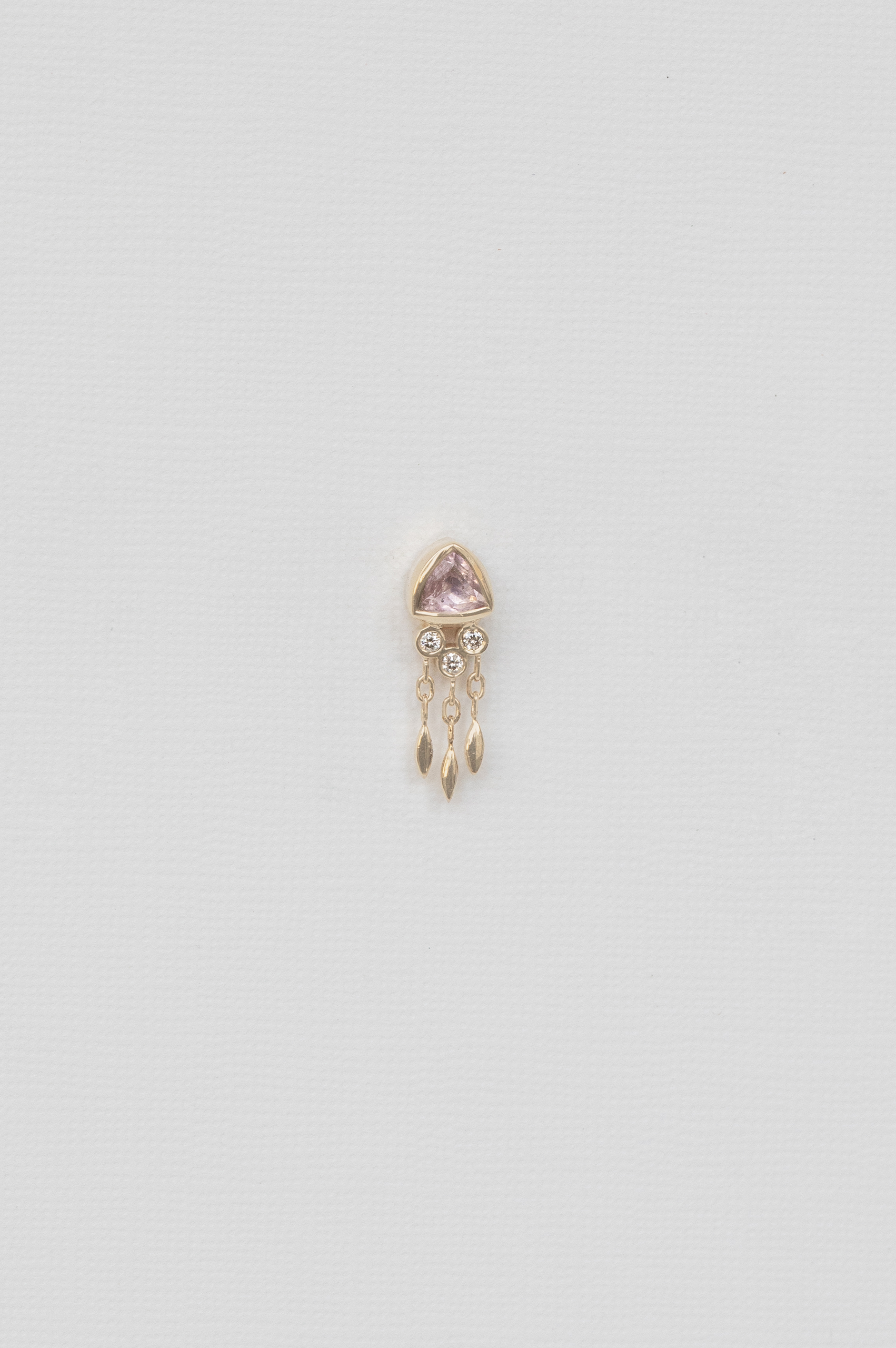 Céline Daoust 14kt light yellow gold earring with one light pink tourmaline, diamonds and dangling details. The color stone is a light pink.