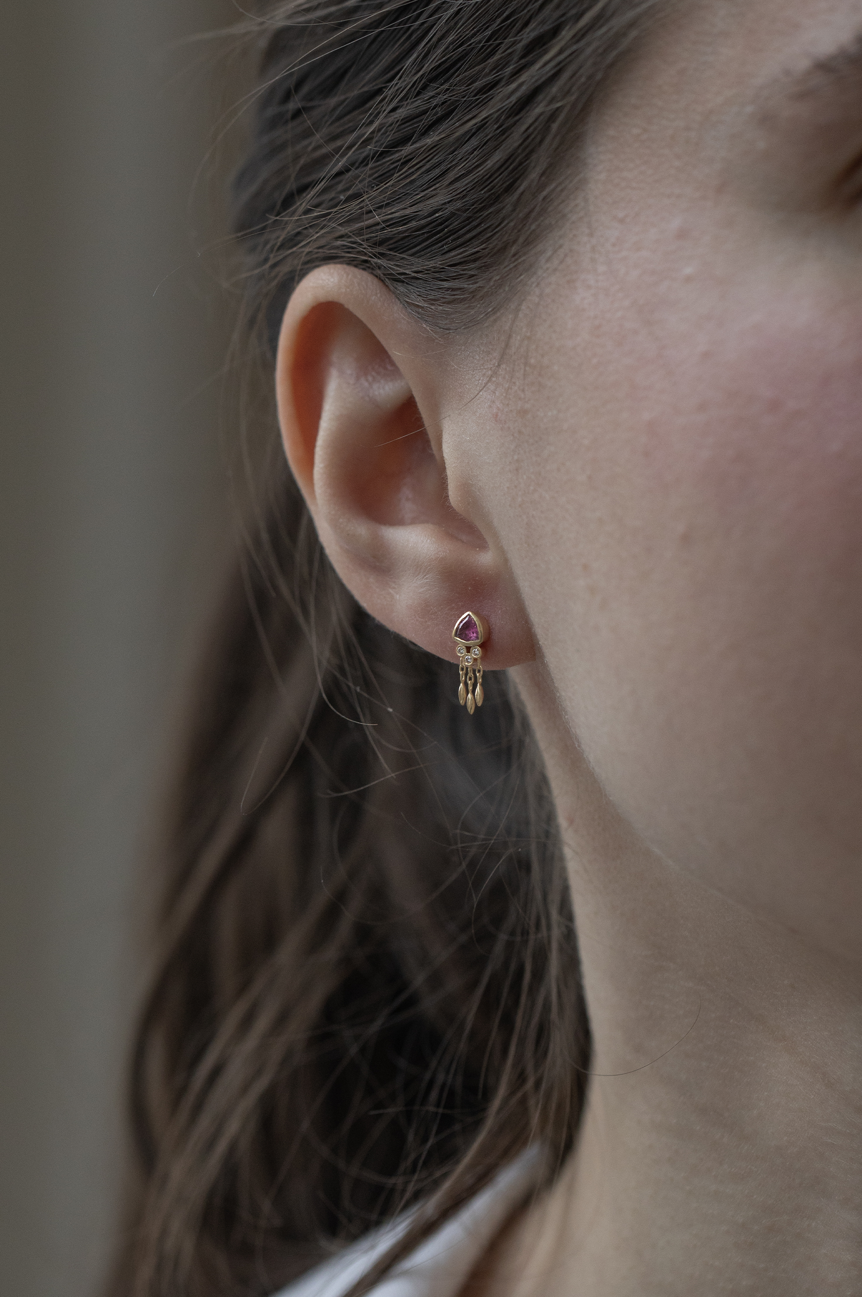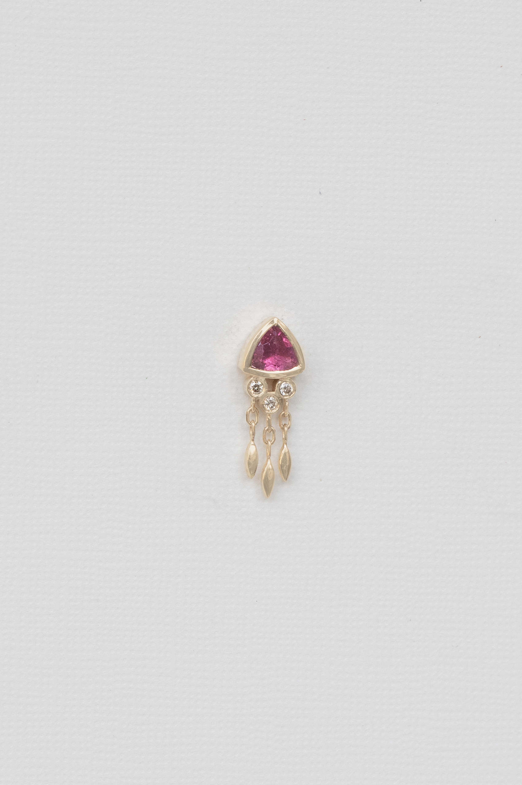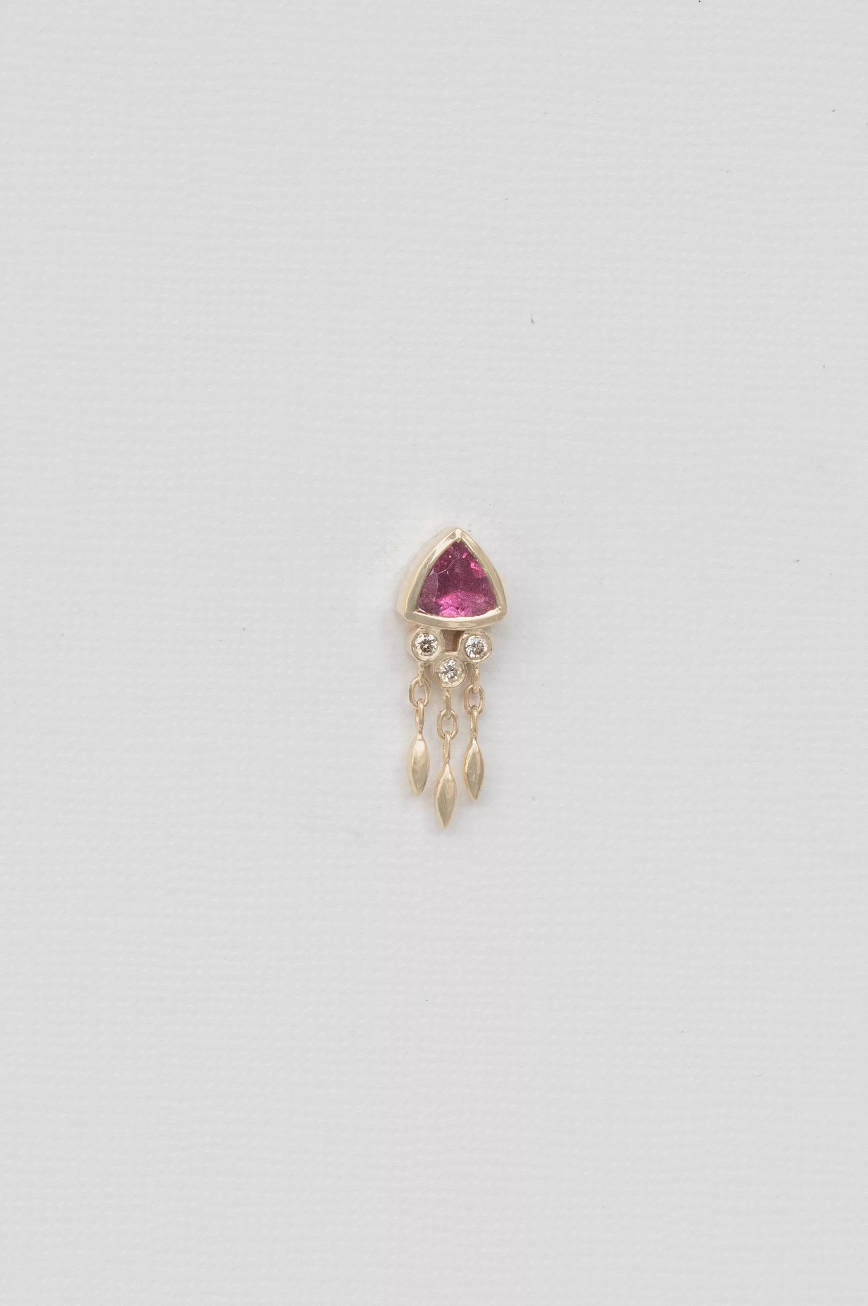 Céline Daoust 14kt light yellow gold earring with one pink tourmaline, diamonds and dangling details. The color stone is a deep pink.