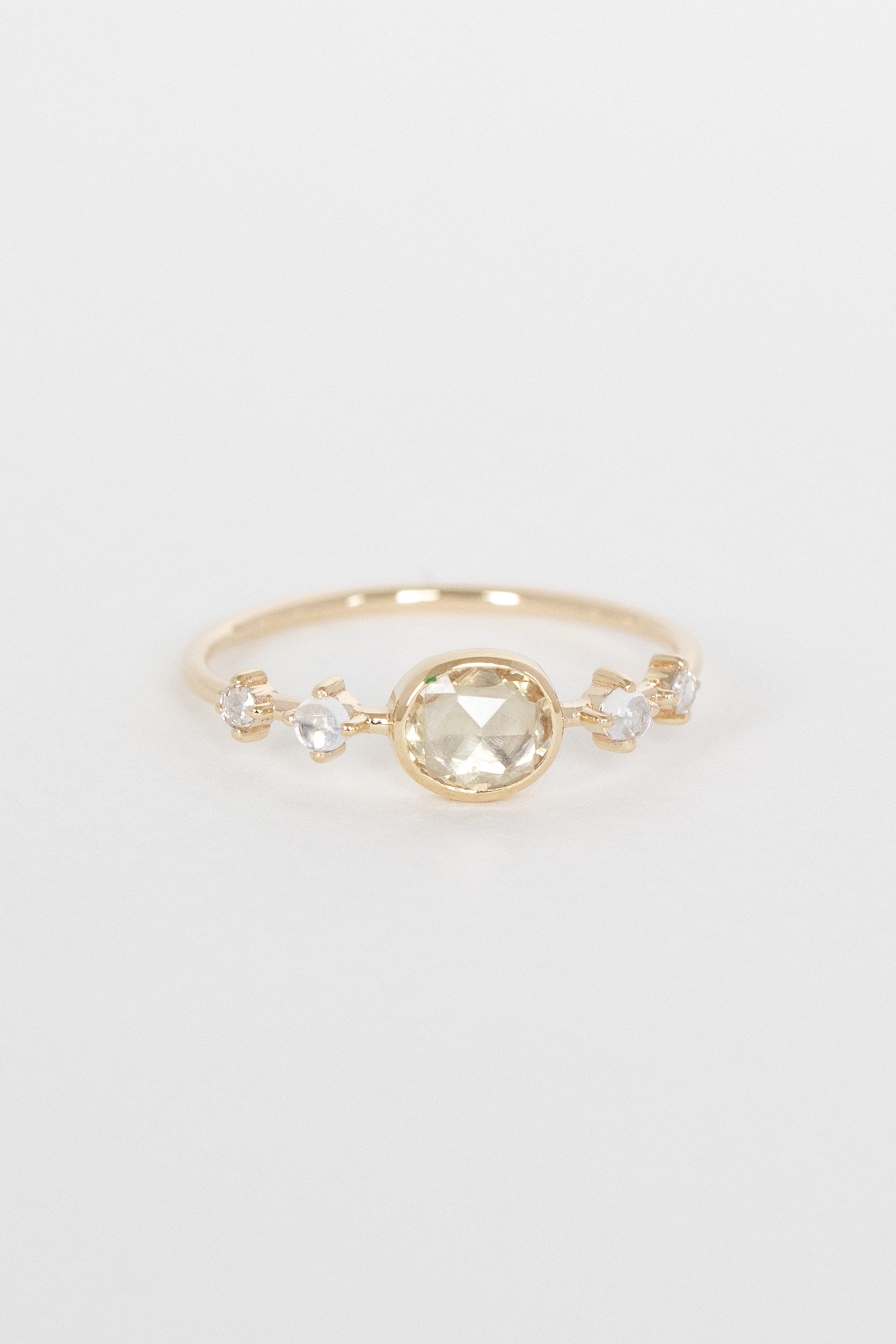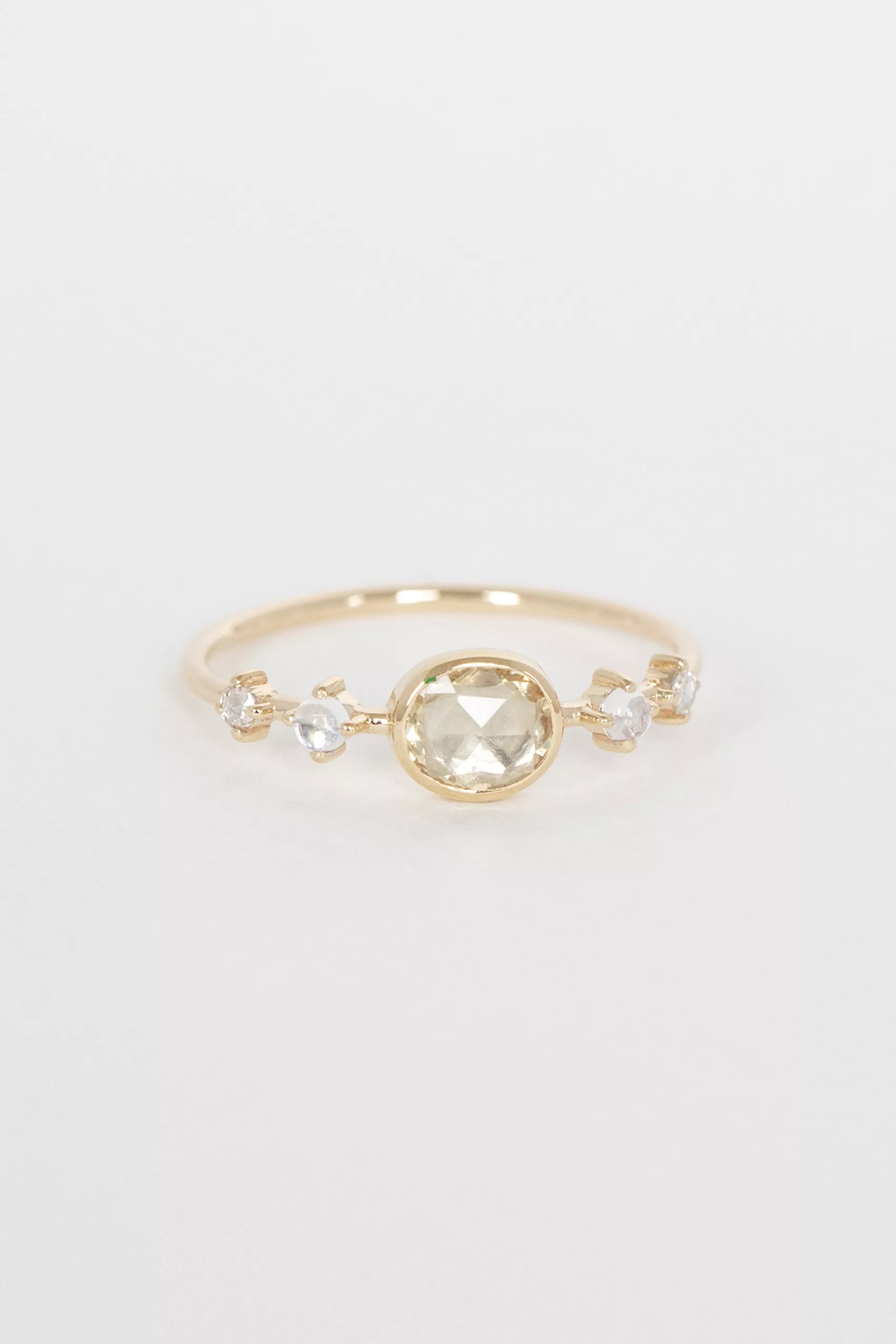 Celine Daoust 14k light yellow gold ring with one champagne central sapphire, two moonstones and two diamonds. The stone comes in gradient of light yellow.