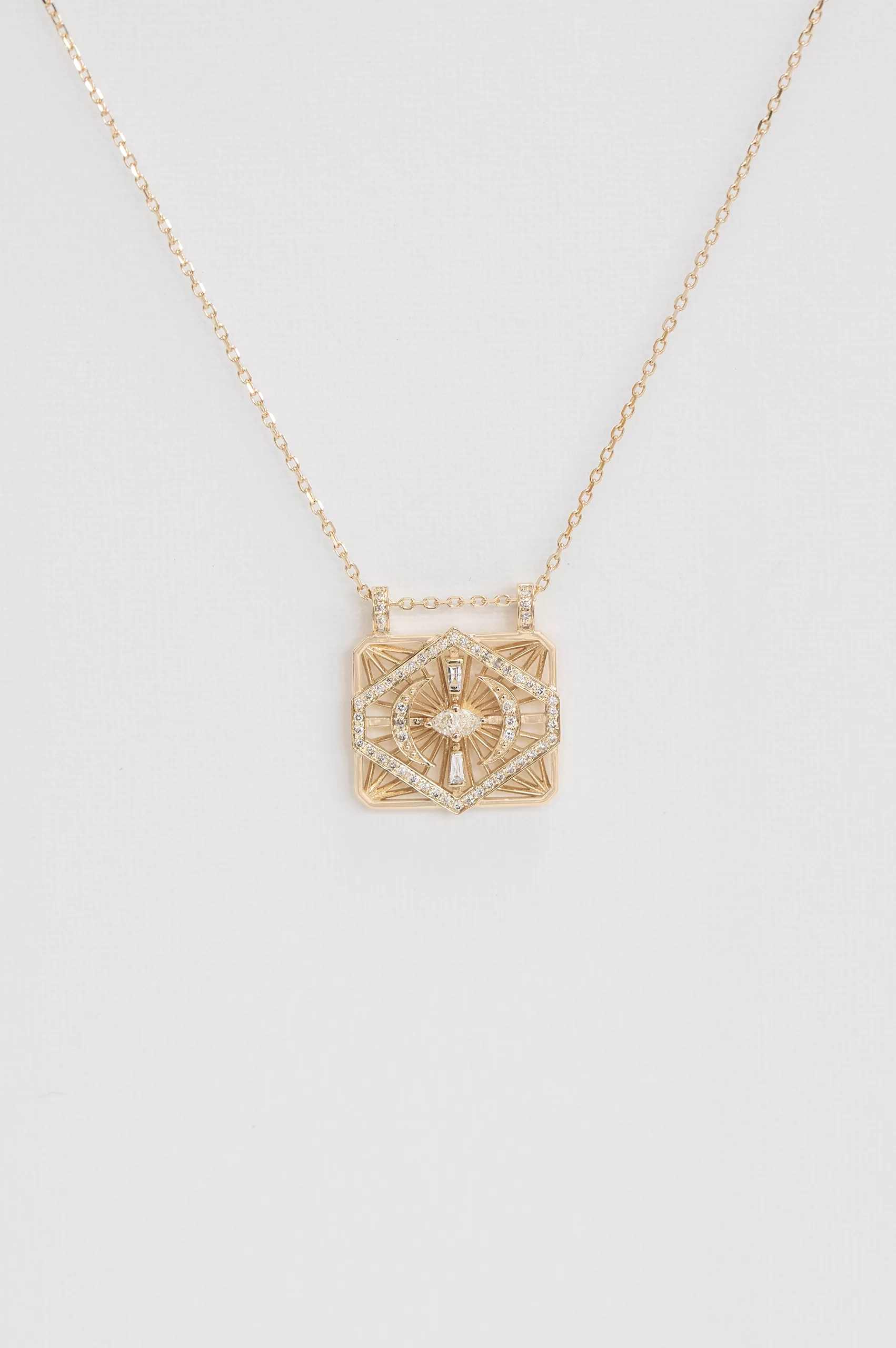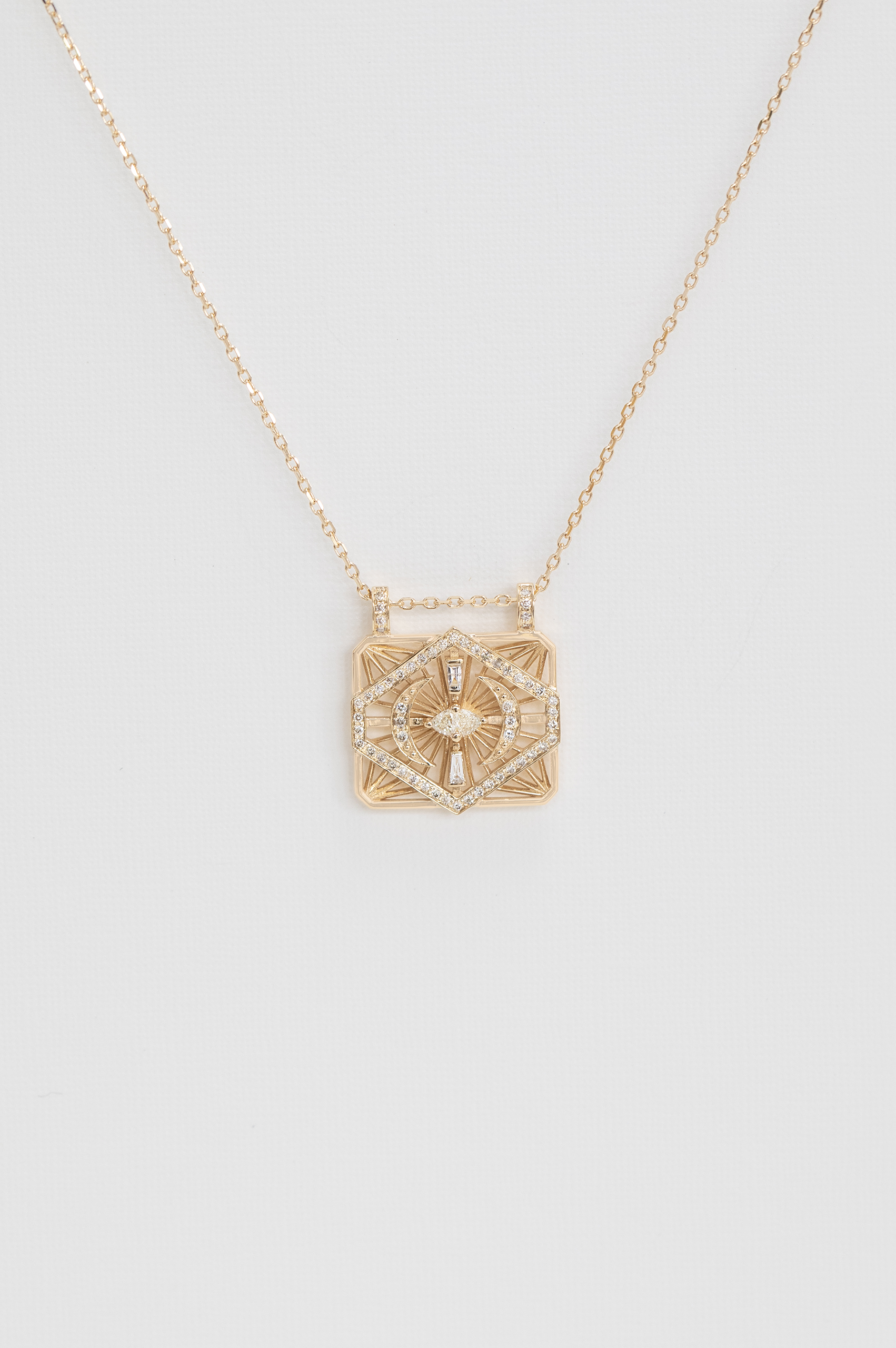 Celine Daoust 14k light yellow gold dream maker losange diamonds and moons open rectangle chain necklace.