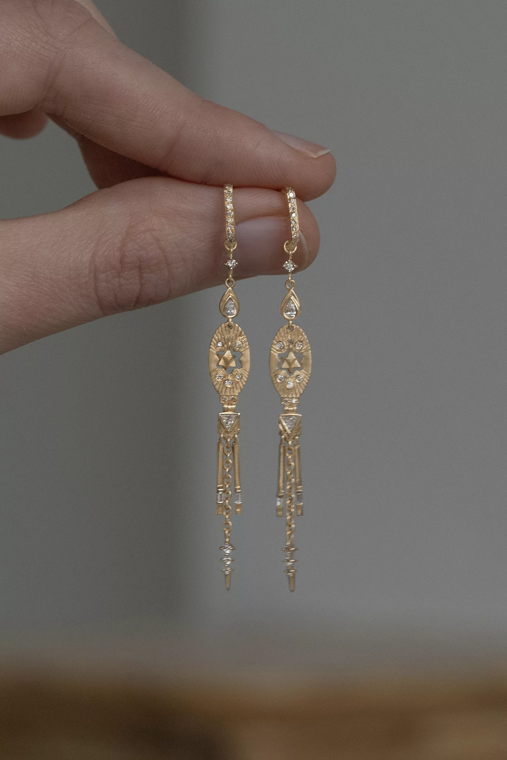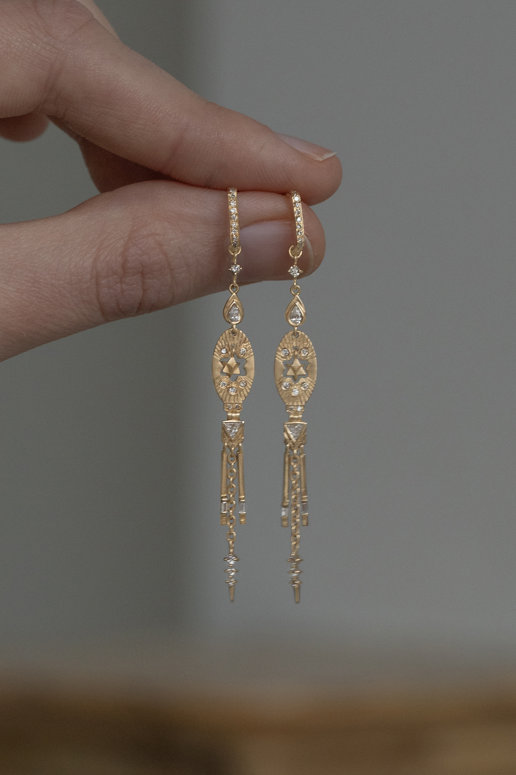 Celine Daoust 14k light yellow gold merkabah earring with diamond and gold details.