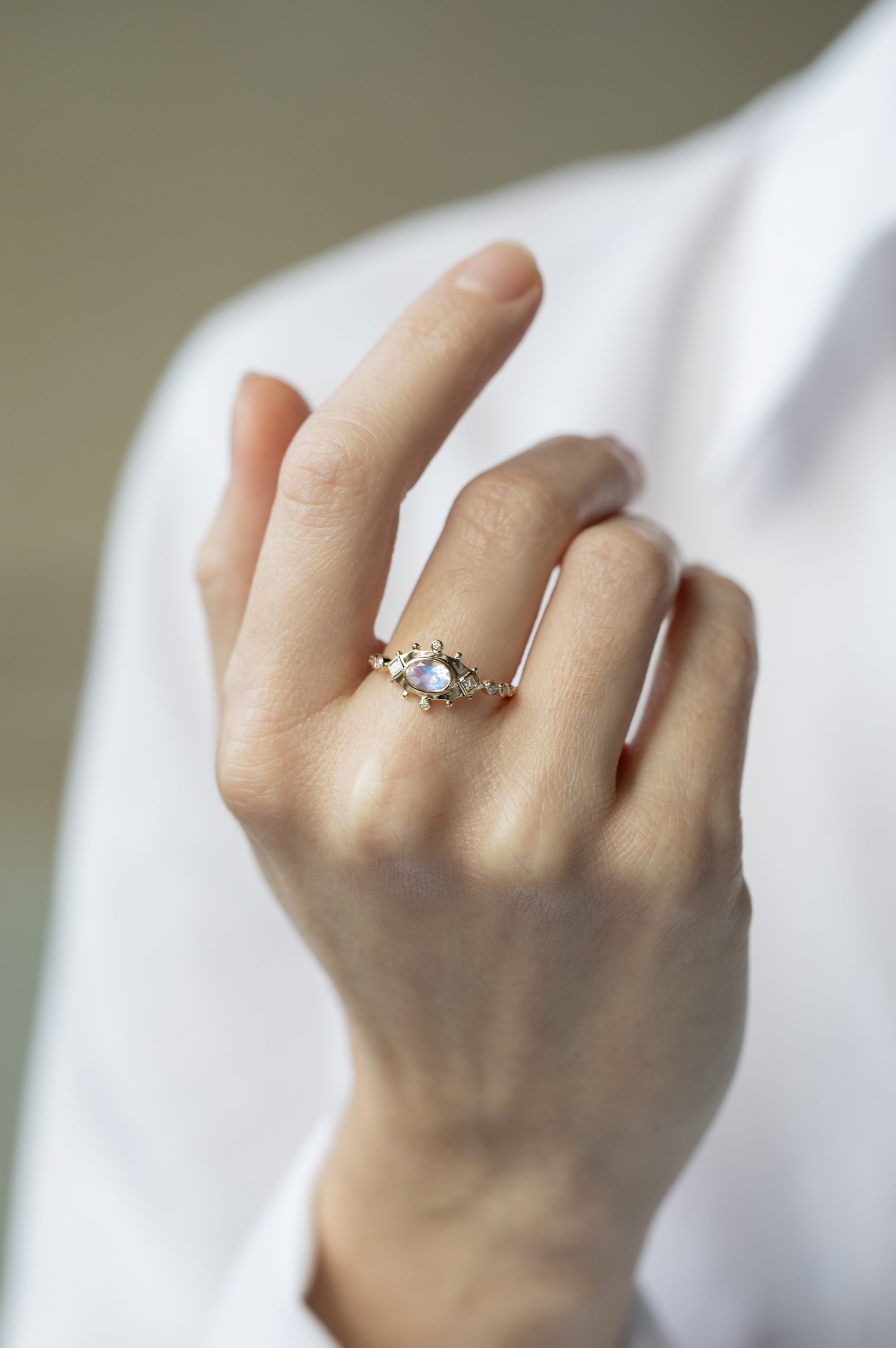Celine Daoust 14k light yellow gold ring with one moonstone, two square diamonds and diamonds. The stone comes in a gradient of light iridescent tones.