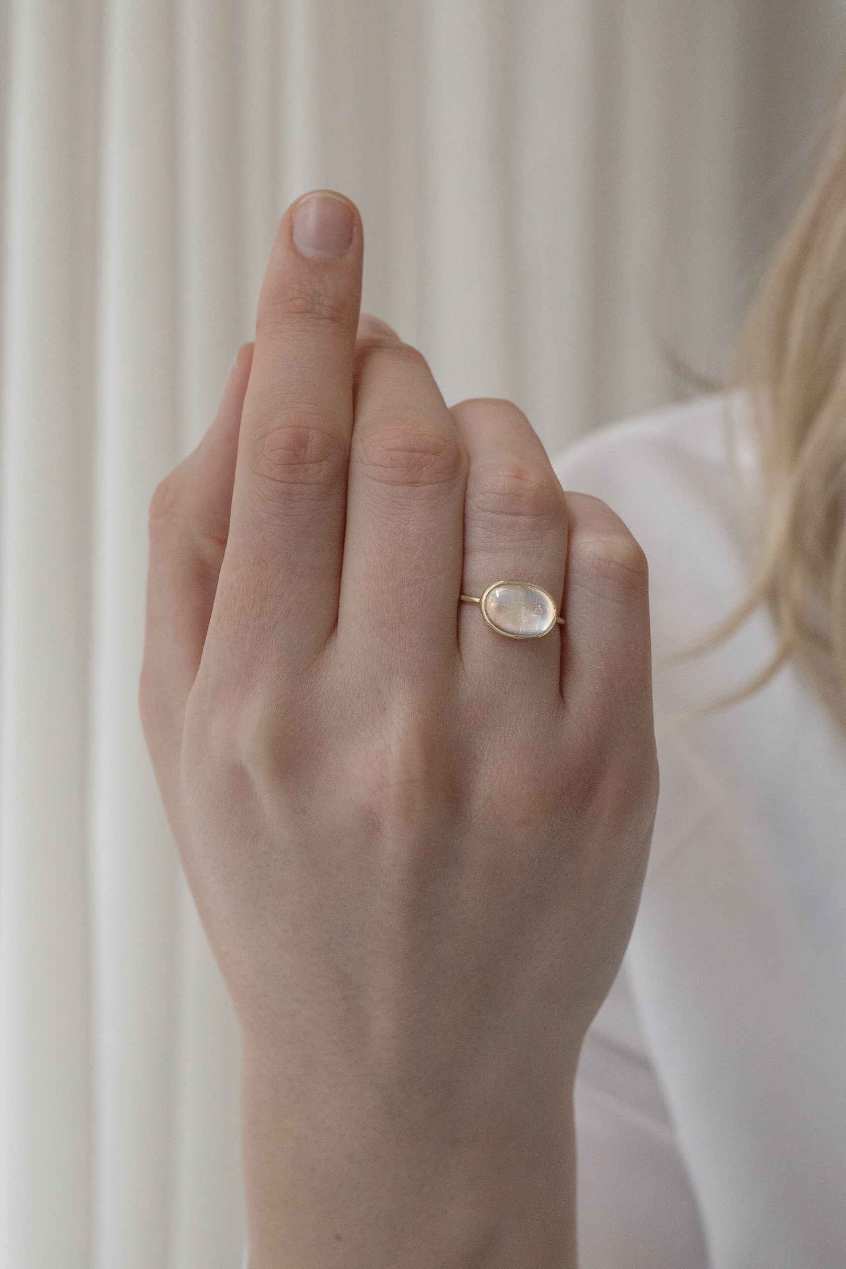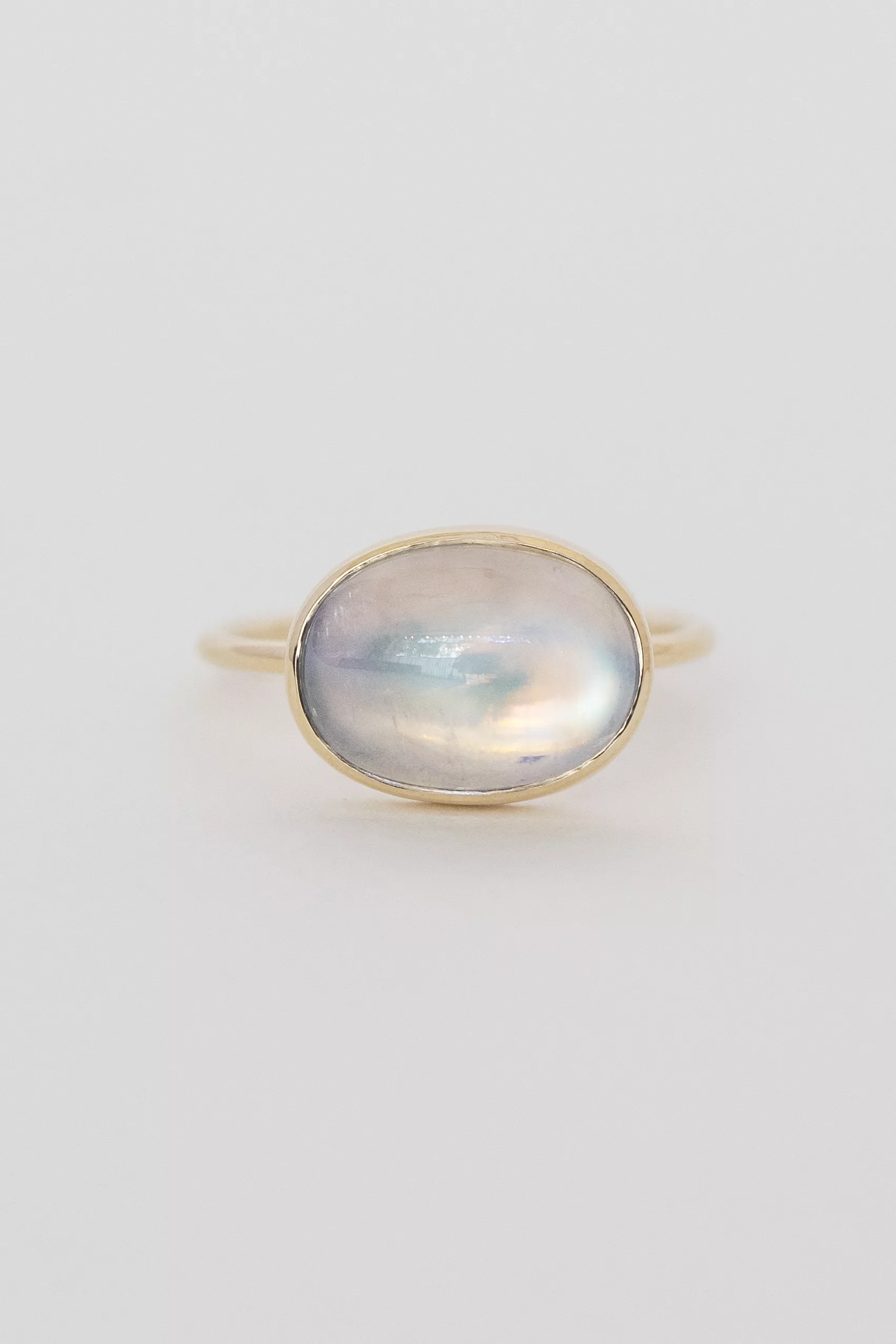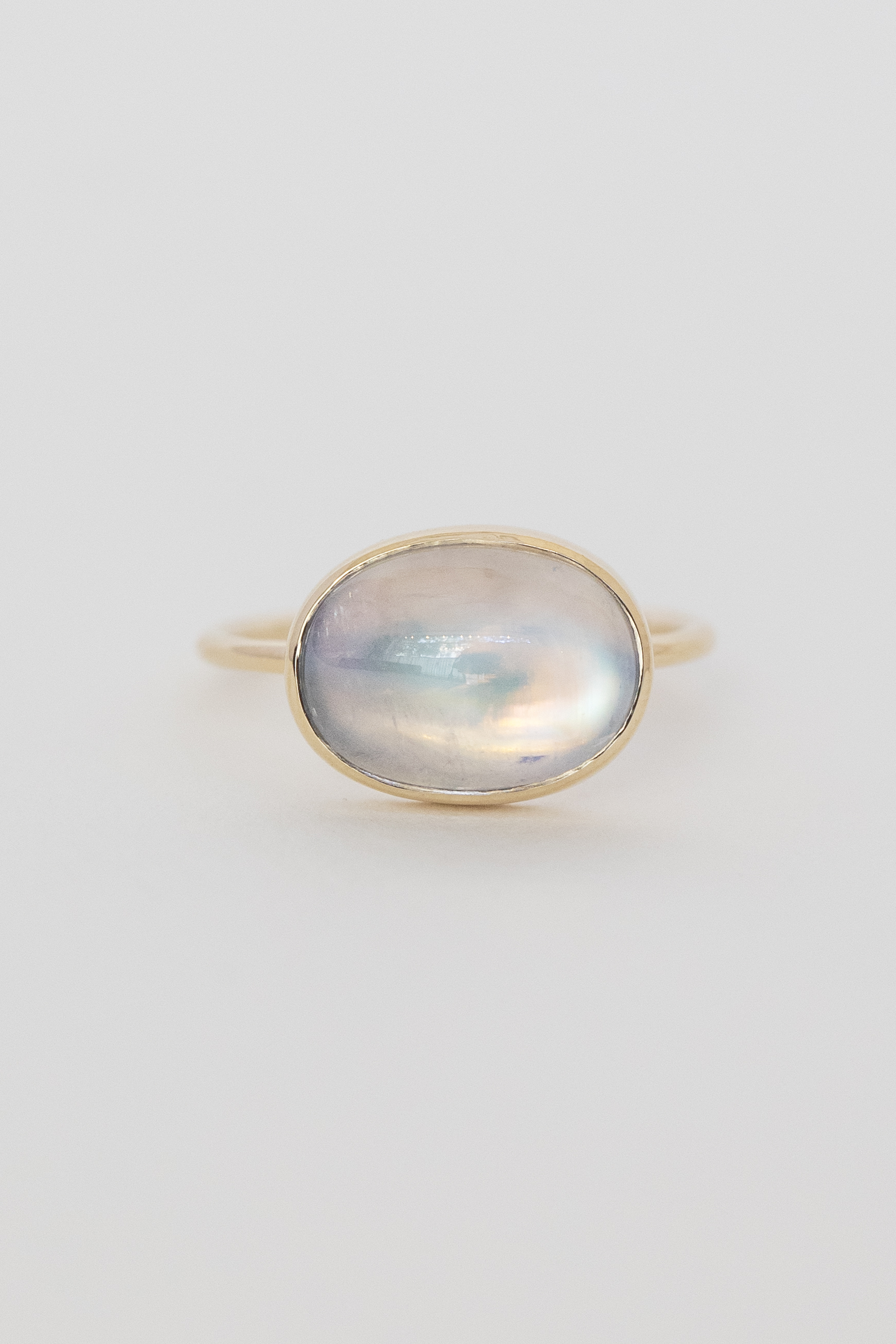 Celine daoust 14k light yellow gold ring with one moonstone bright. The stone comes in a gradient of light iridescent tones.