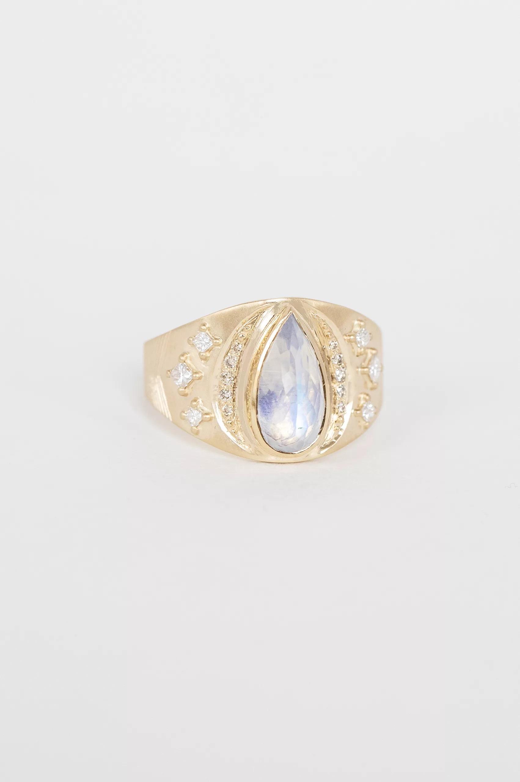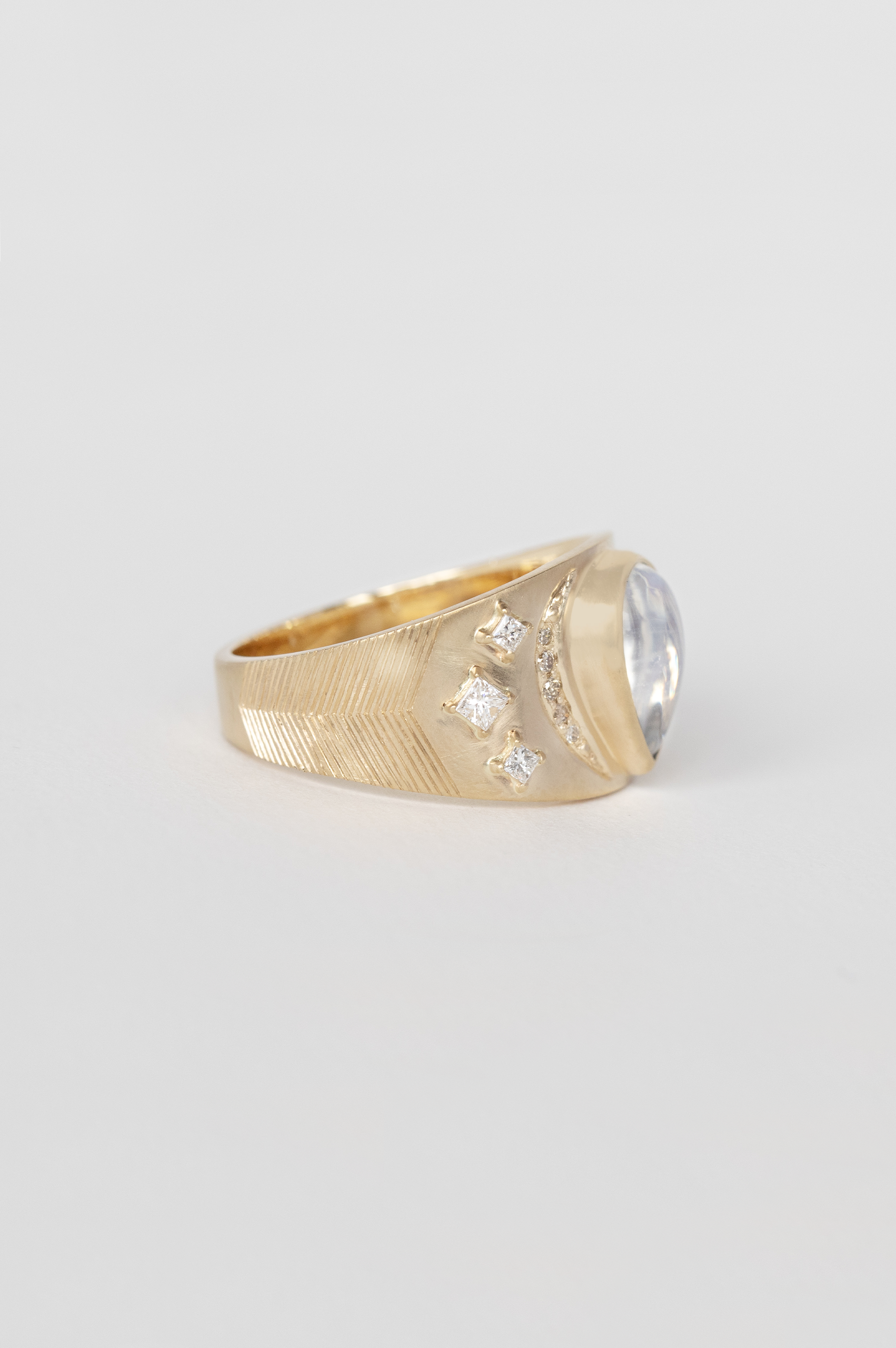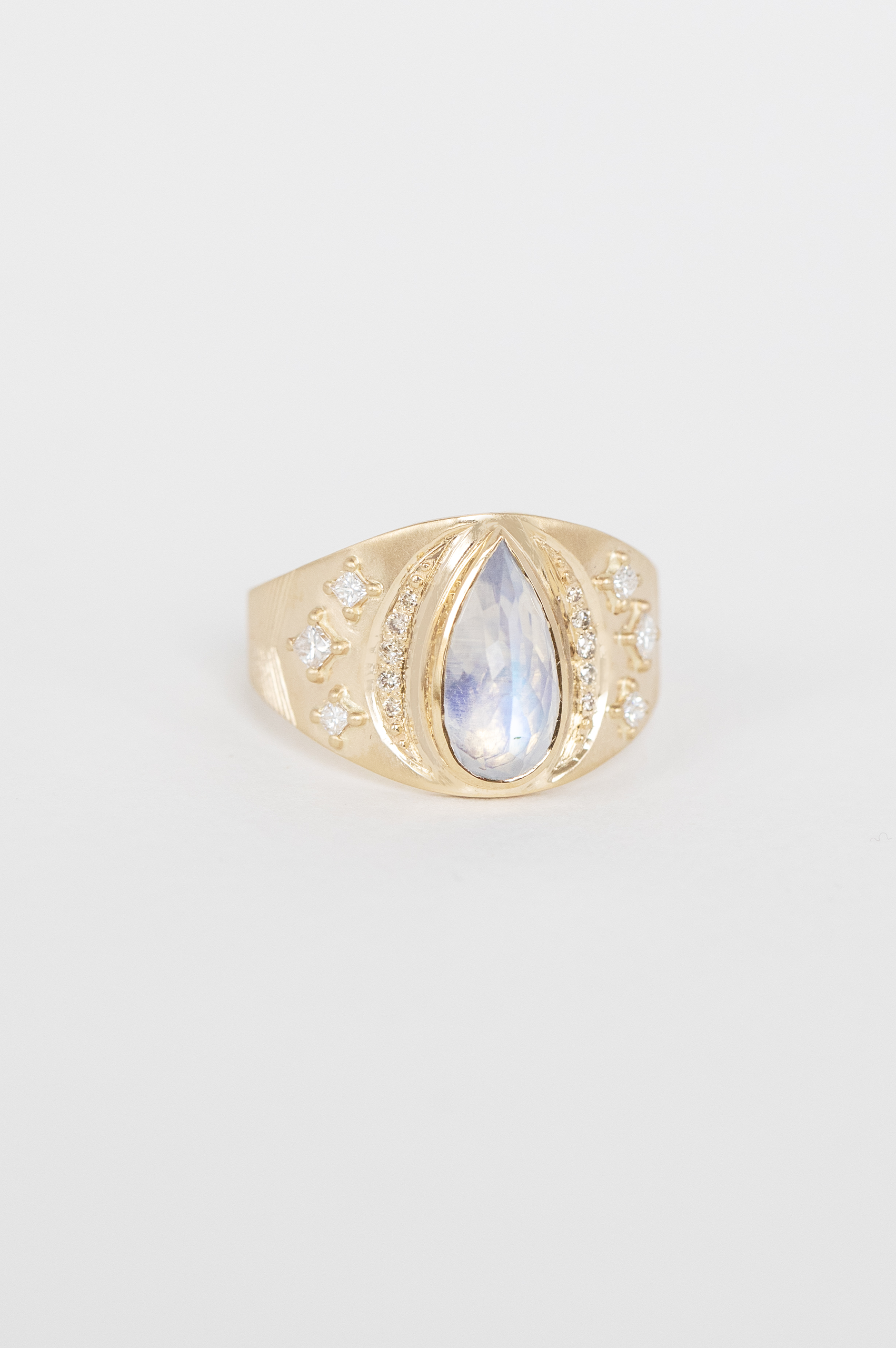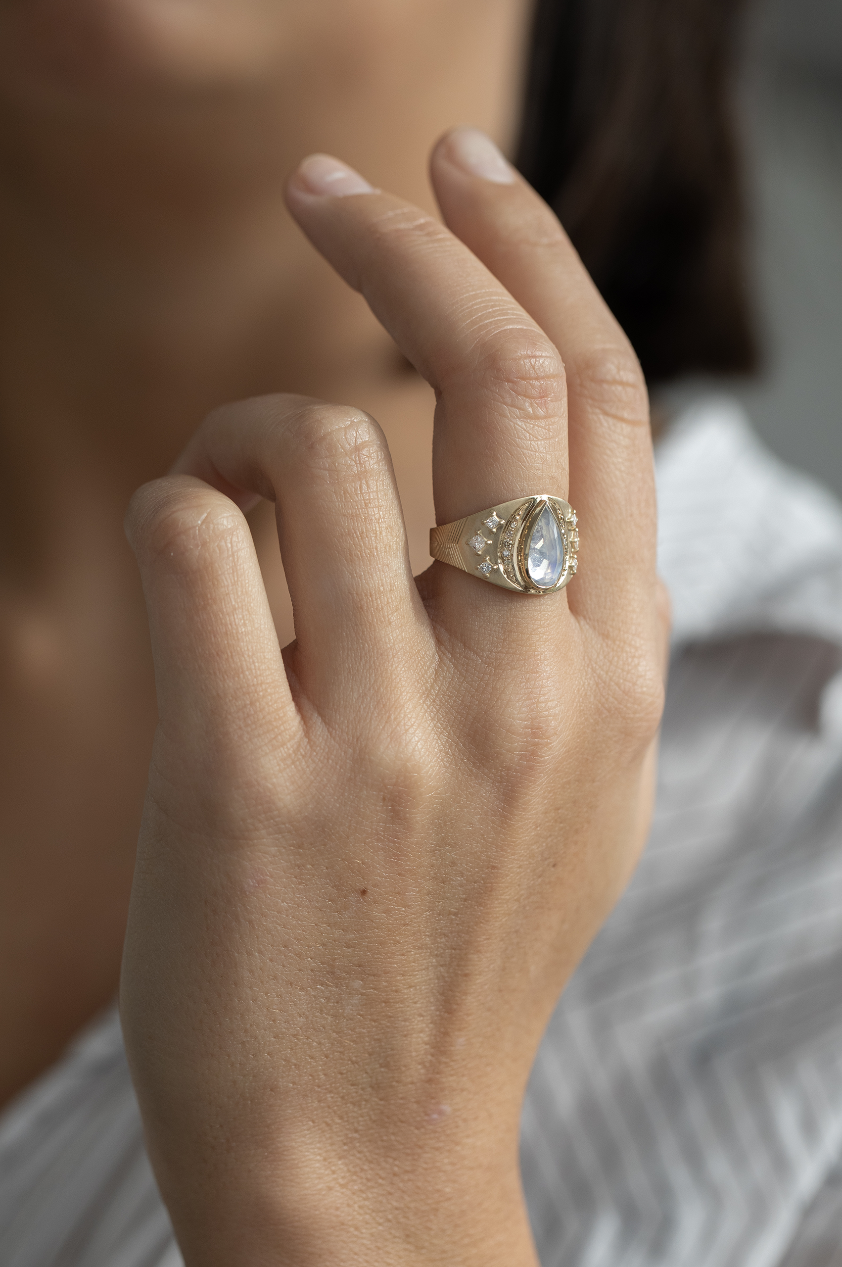 Celine daoust 14k light yellow gold ring with a pear moonstone, moon details and square diamonds. The stone comes in a gradient of light iridescent tones.
