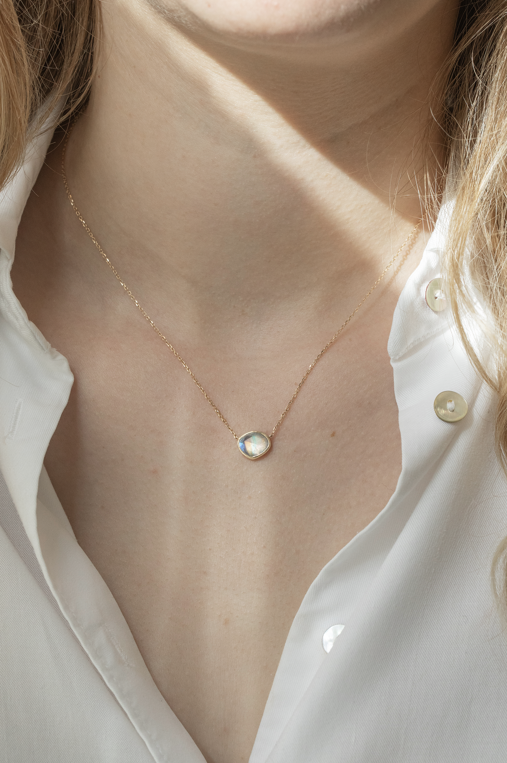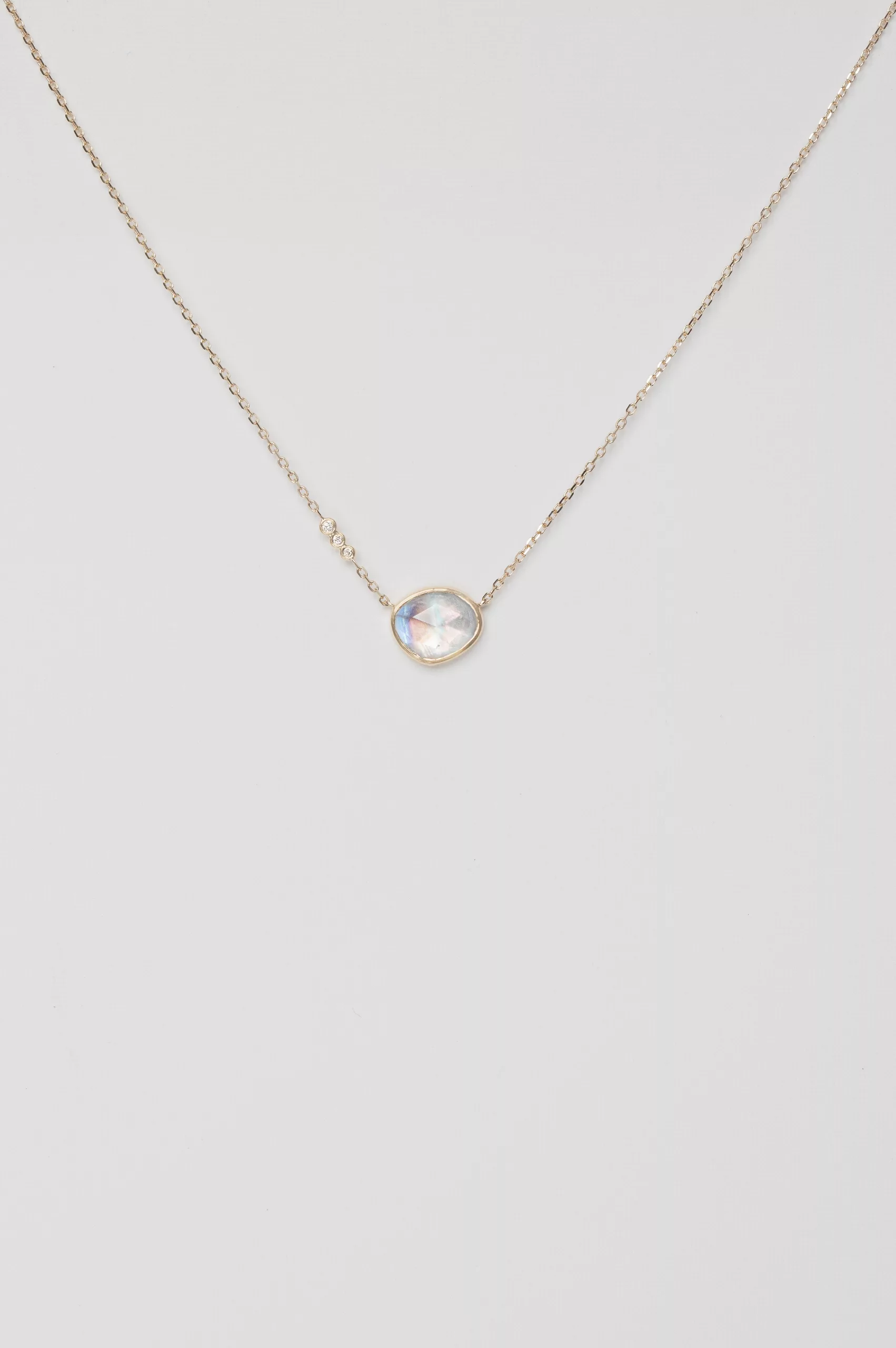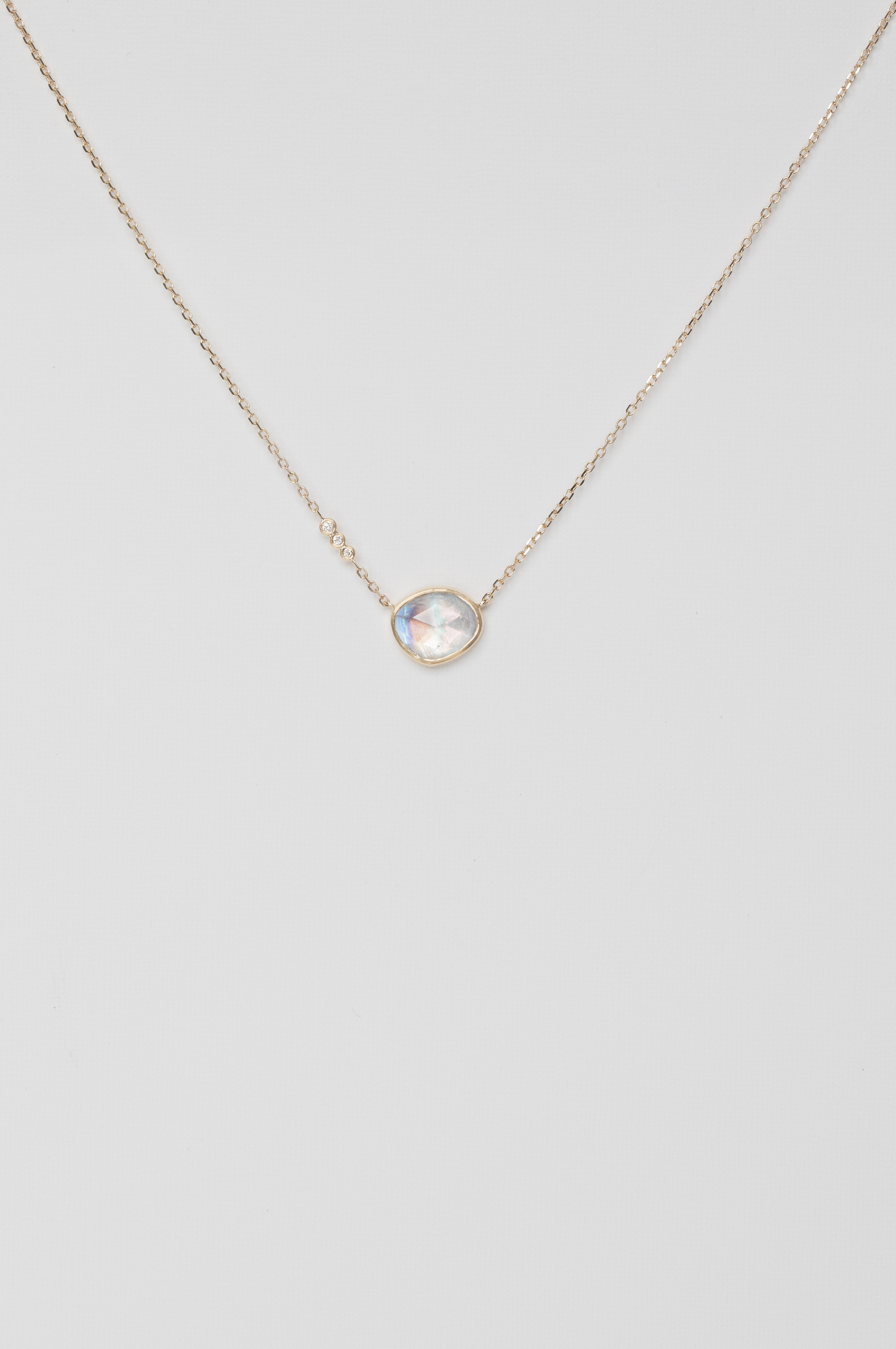 Celine Daoust 14k light yellow gold chain necklace with a pendant set with one moonstone and three diamonds.The stone comes in a gradient of light blue.