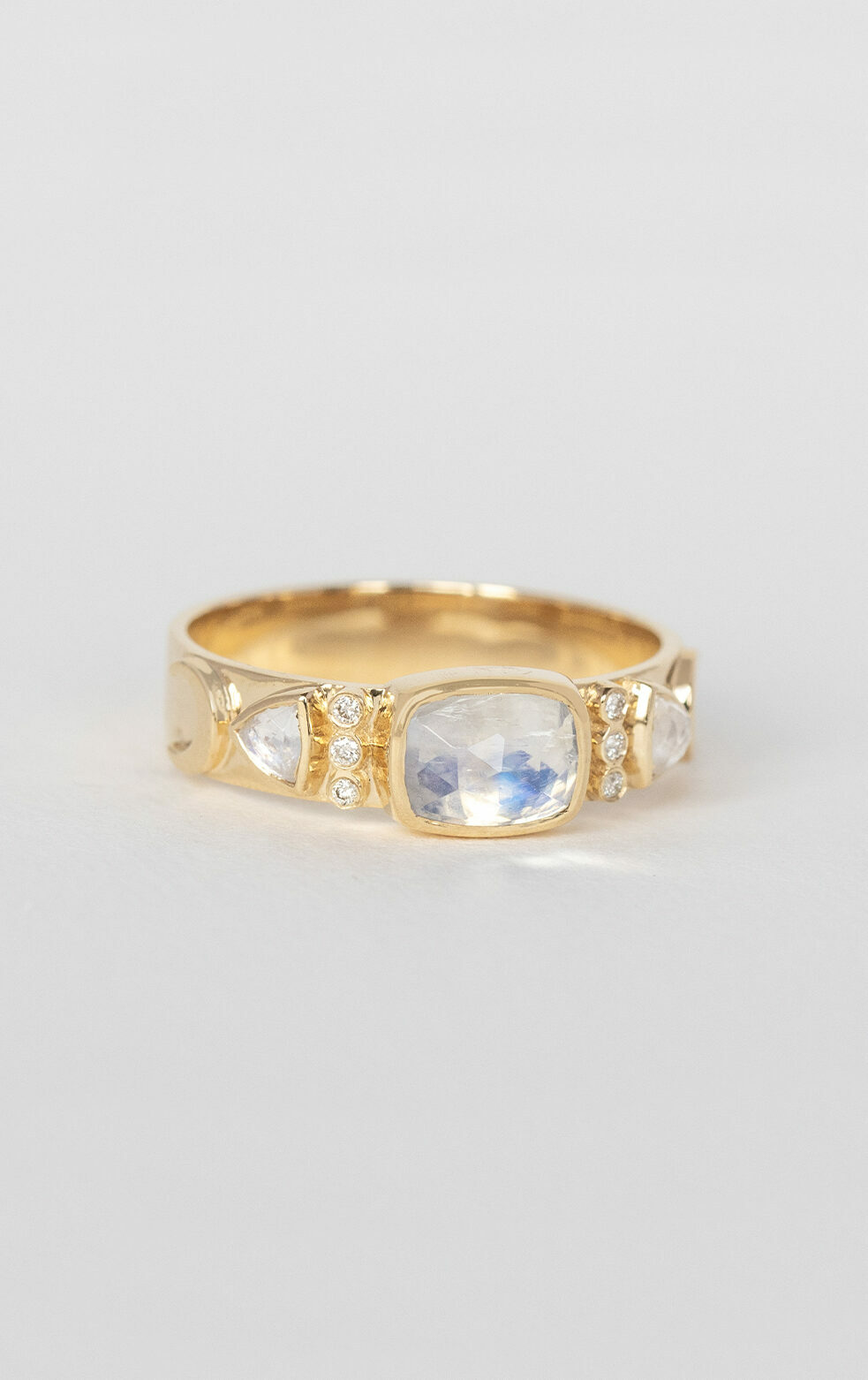 Celine Daoust 14k light yellow gold ring with one moonstone, triangles and rose cut diamonds. The stones come in a gradient of light iridescent tones.
