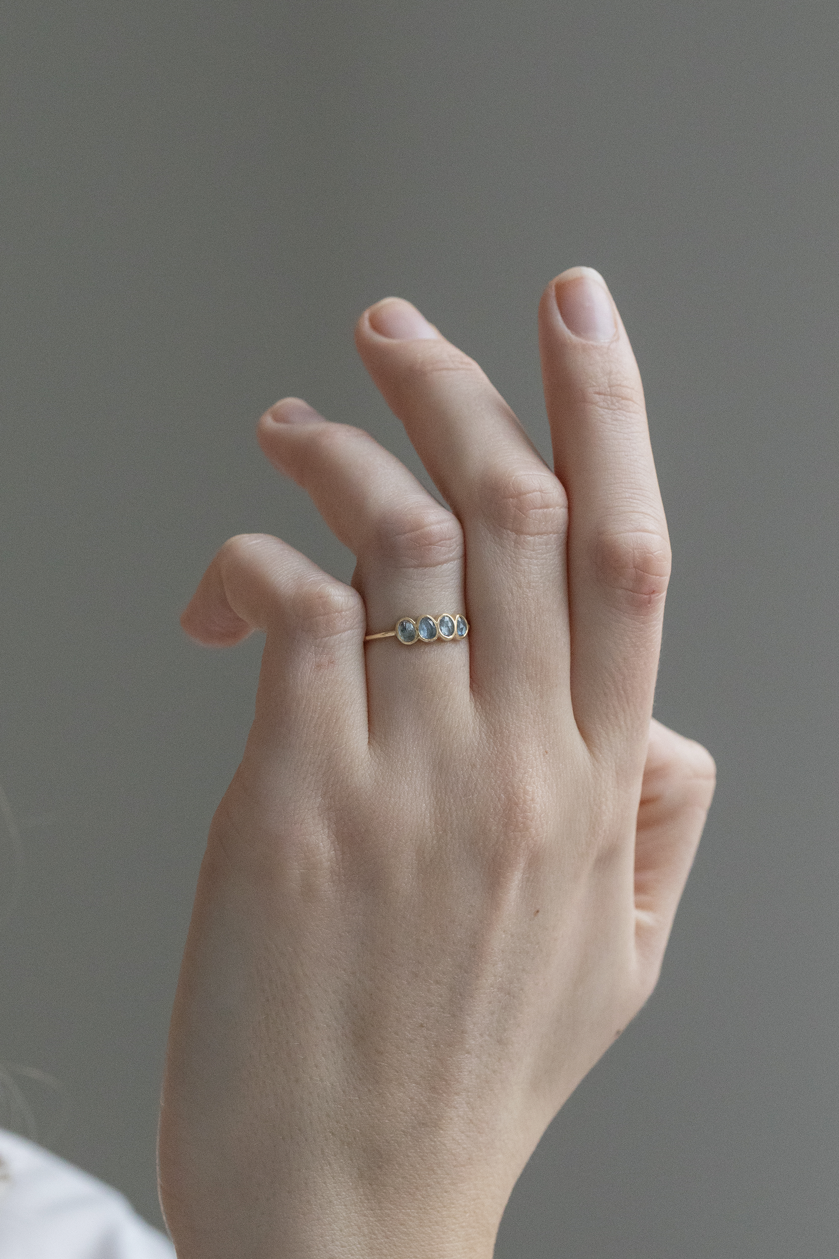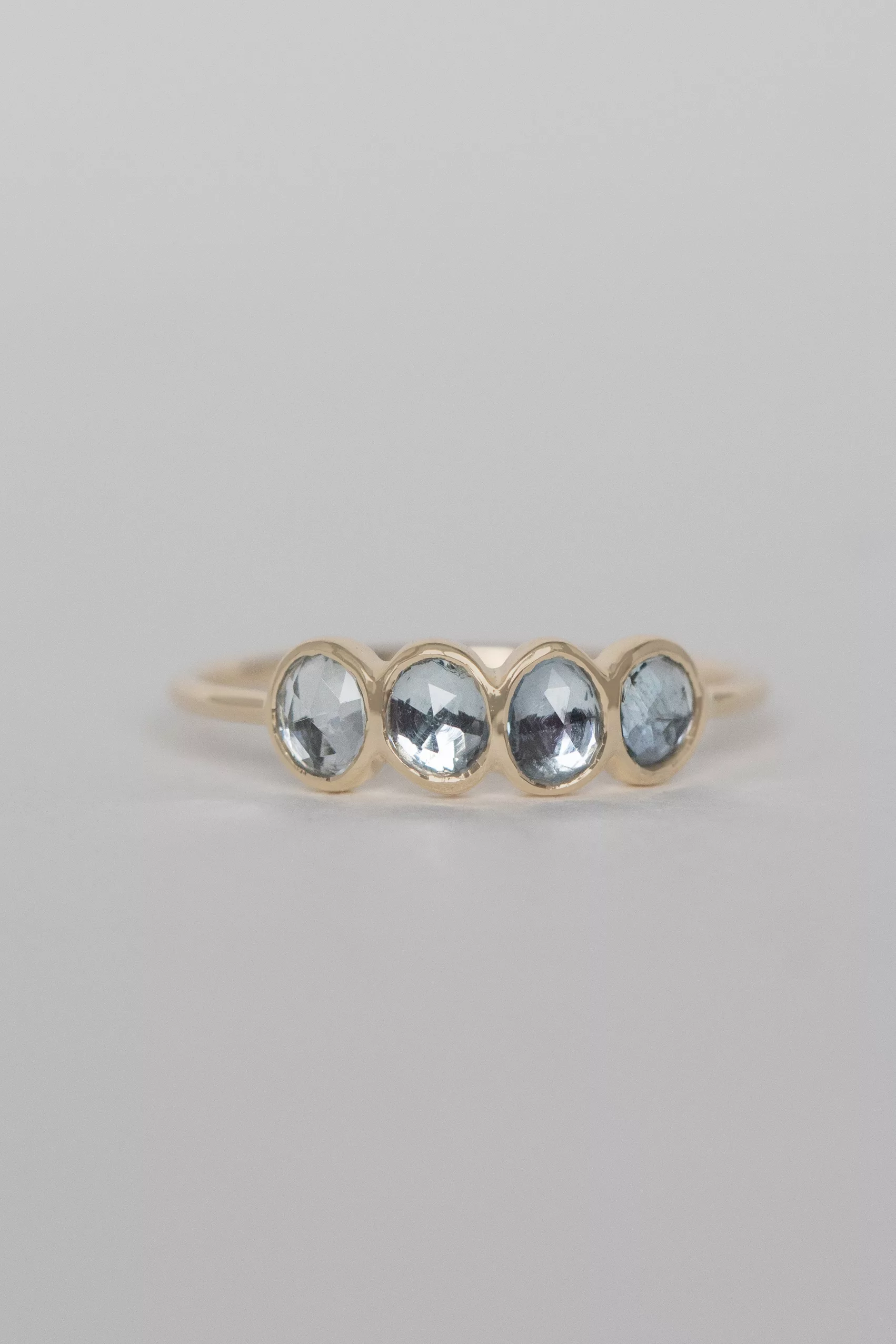 Céline Daoust 14k light yellow gold ring with four aquamarines. The stones come in a gradient of light blue.