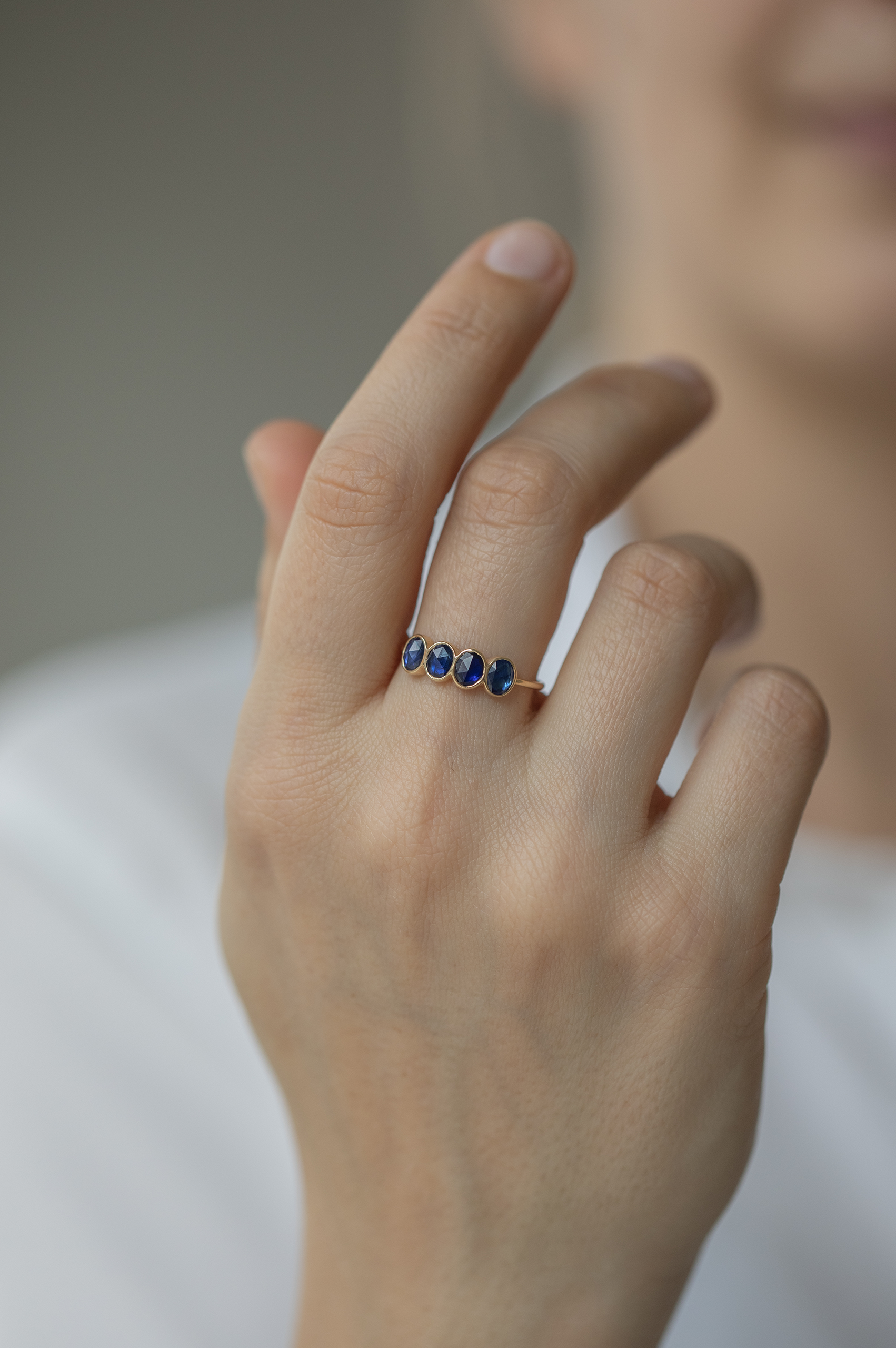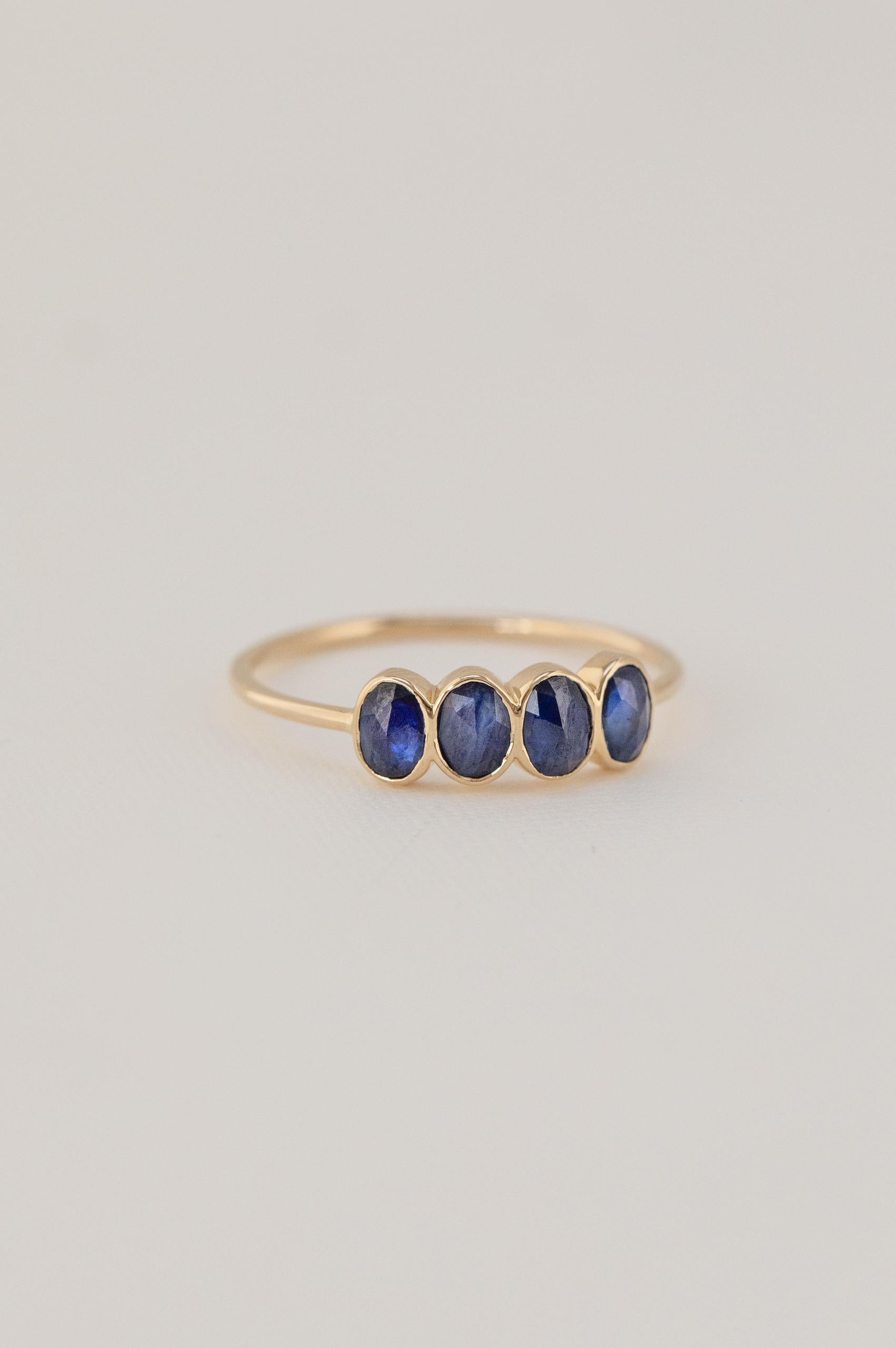 CELINE DAOUST 14K YELLOW GOLD RING WITH FOUR SAPPHIRES. THE STONES COME IN A GRADIENT OF light and dark blue.