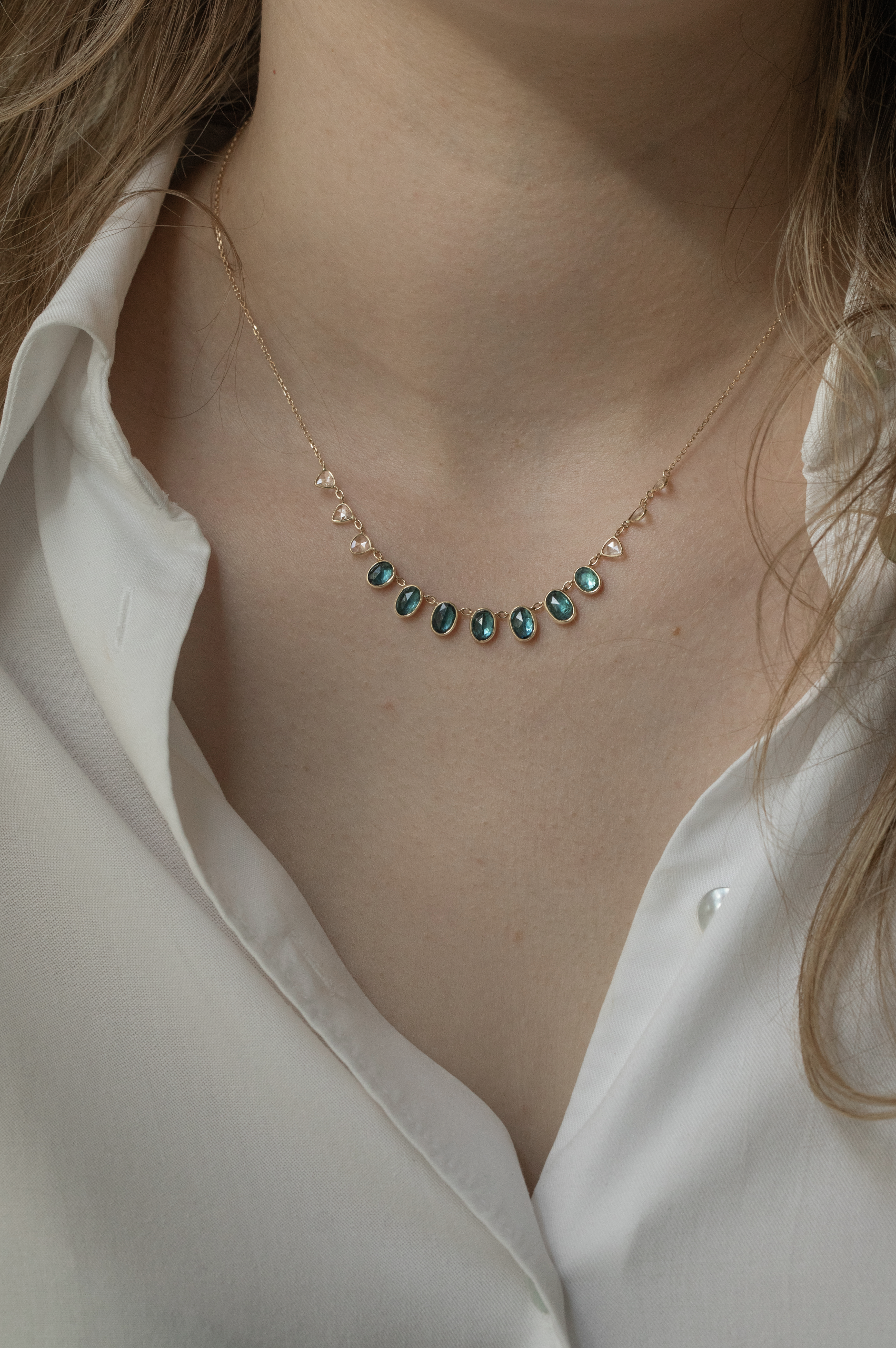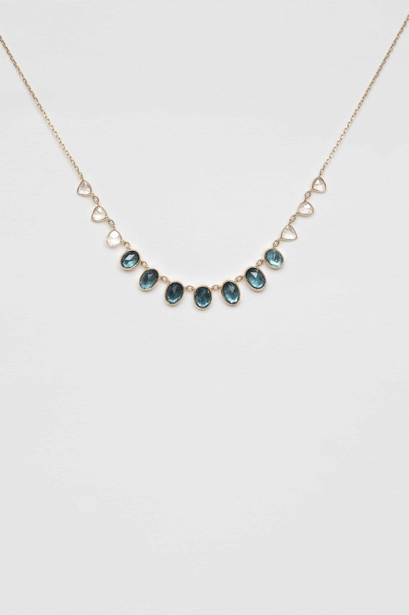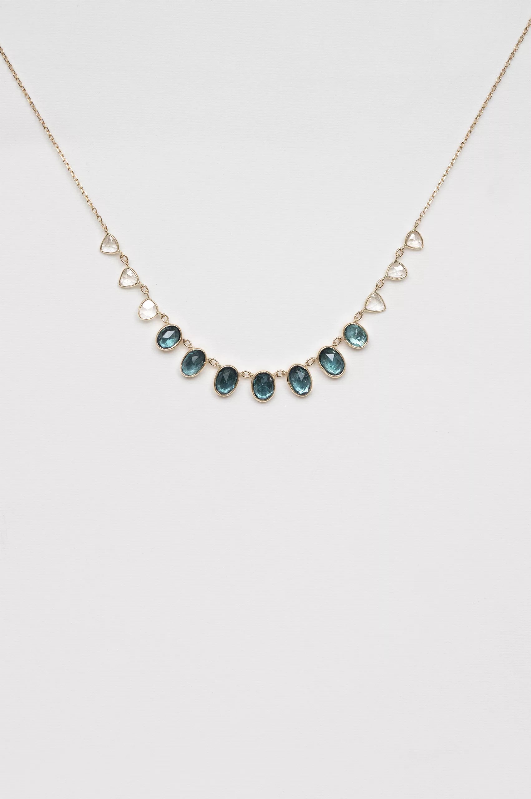 Celine Daoust 14k light yellow gold multi blue tourmalines and rose cut diamonds necklace. The stones come in a gradient of light and dark blue.