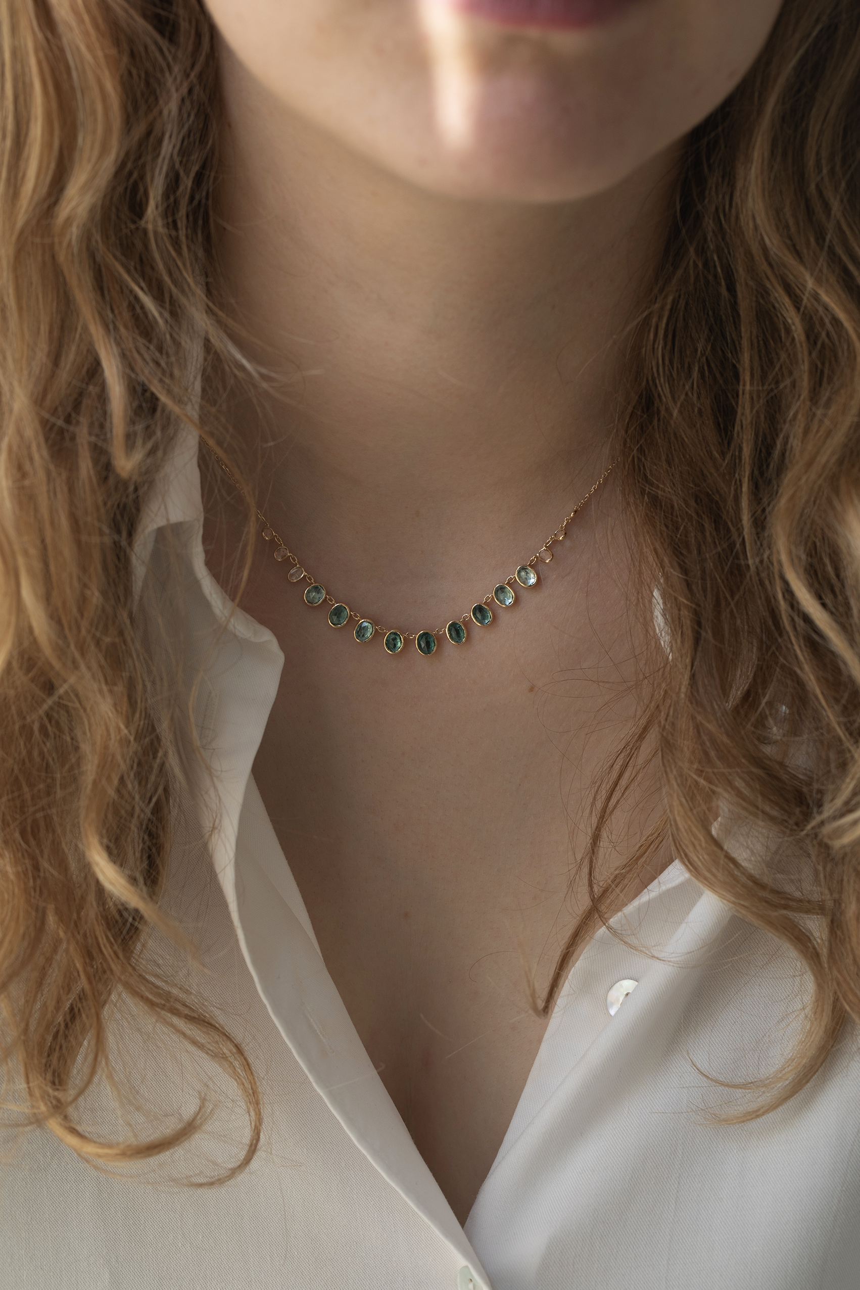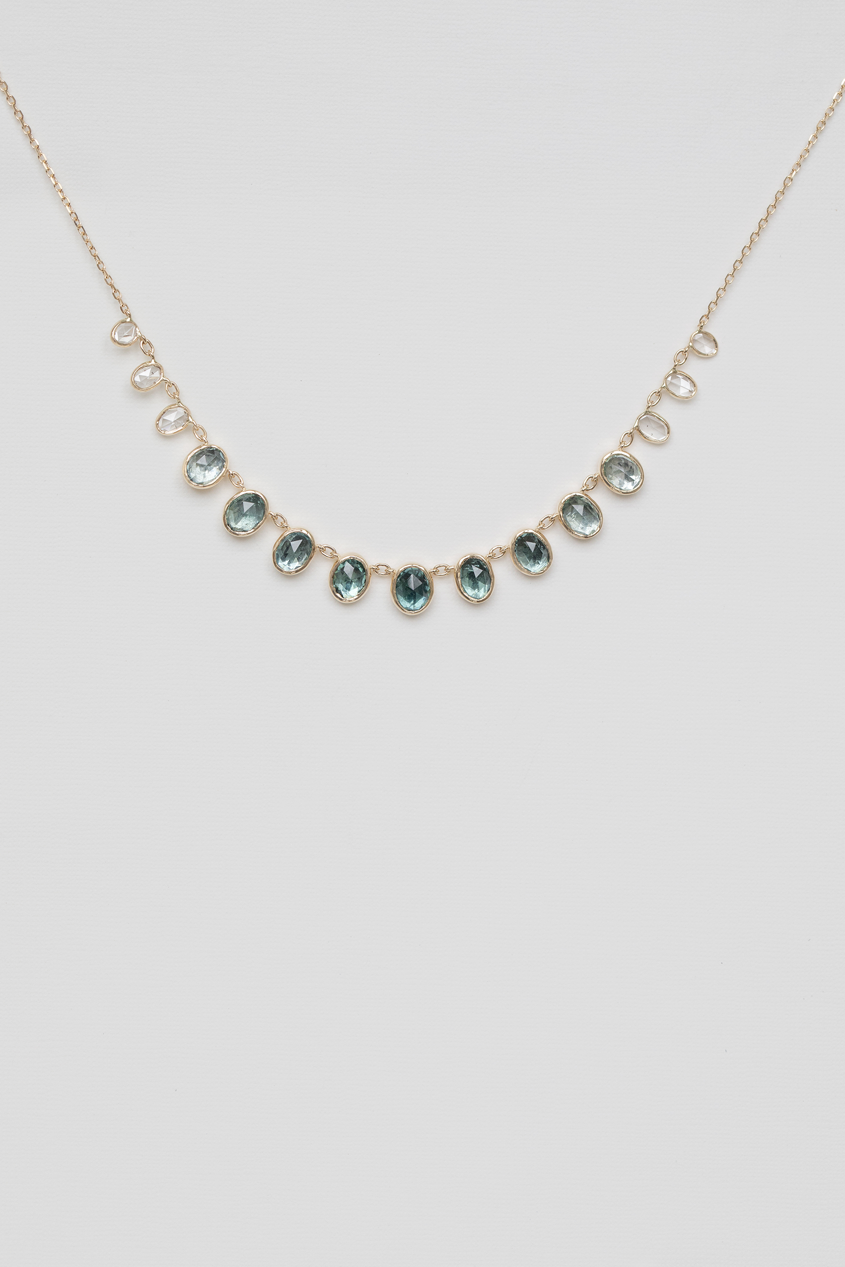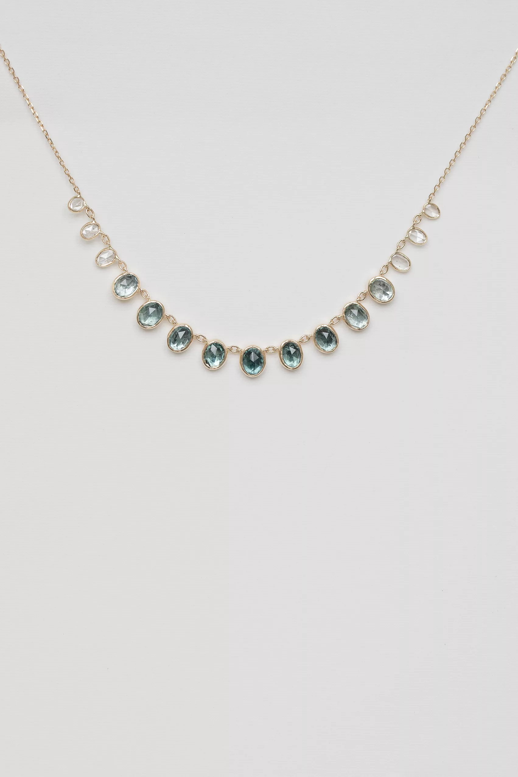 Celine Daoust 14k light yellow gold multi blue tourmalines and rose cut diamonds necklace. The stones come in a gradient of light and dark blue.