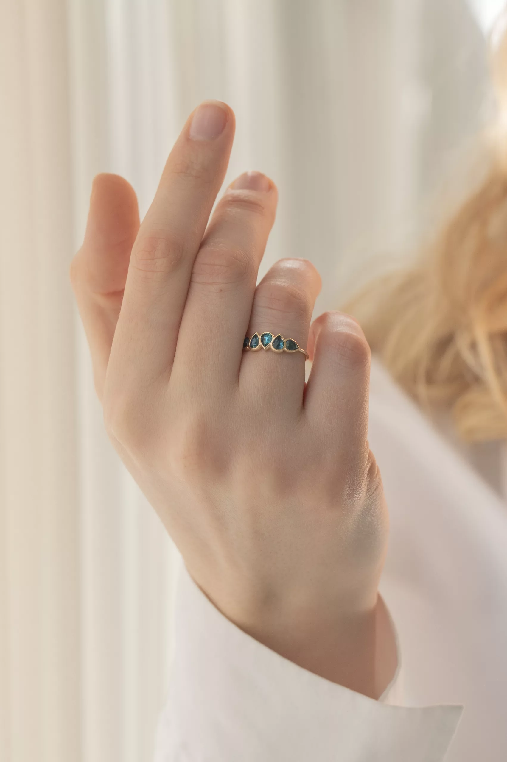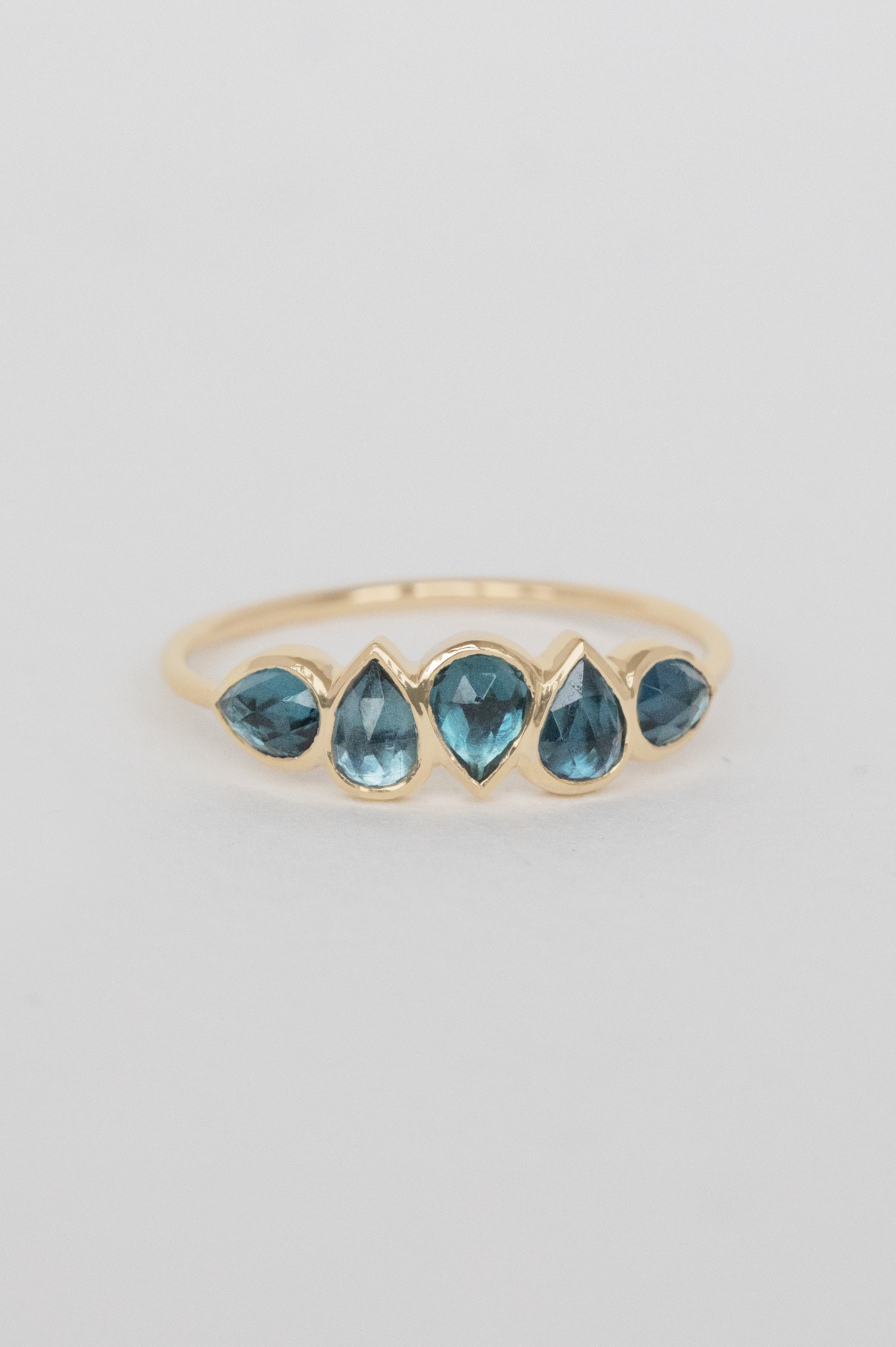 Céline Daoust 14k light yellow gold ring with five tourmalines. The stones come in a gradient of dark blue.