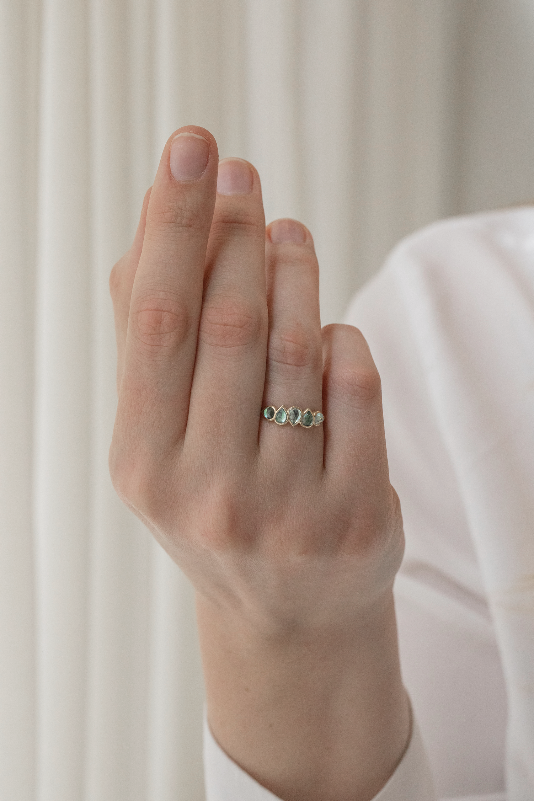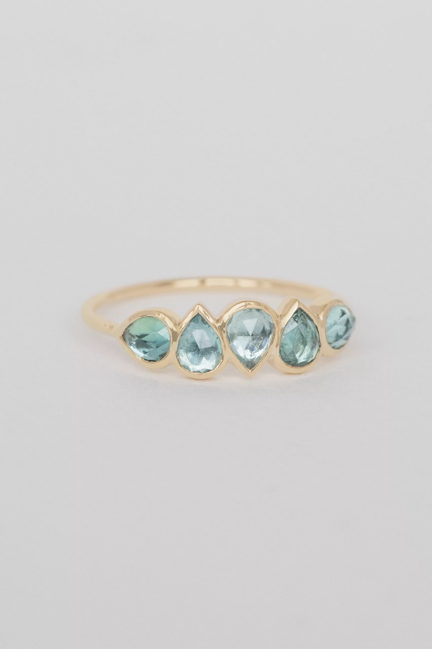 Céline Daoust 14k light yellow gold ring with five tourmalines. The stones come in a gradient of blue.