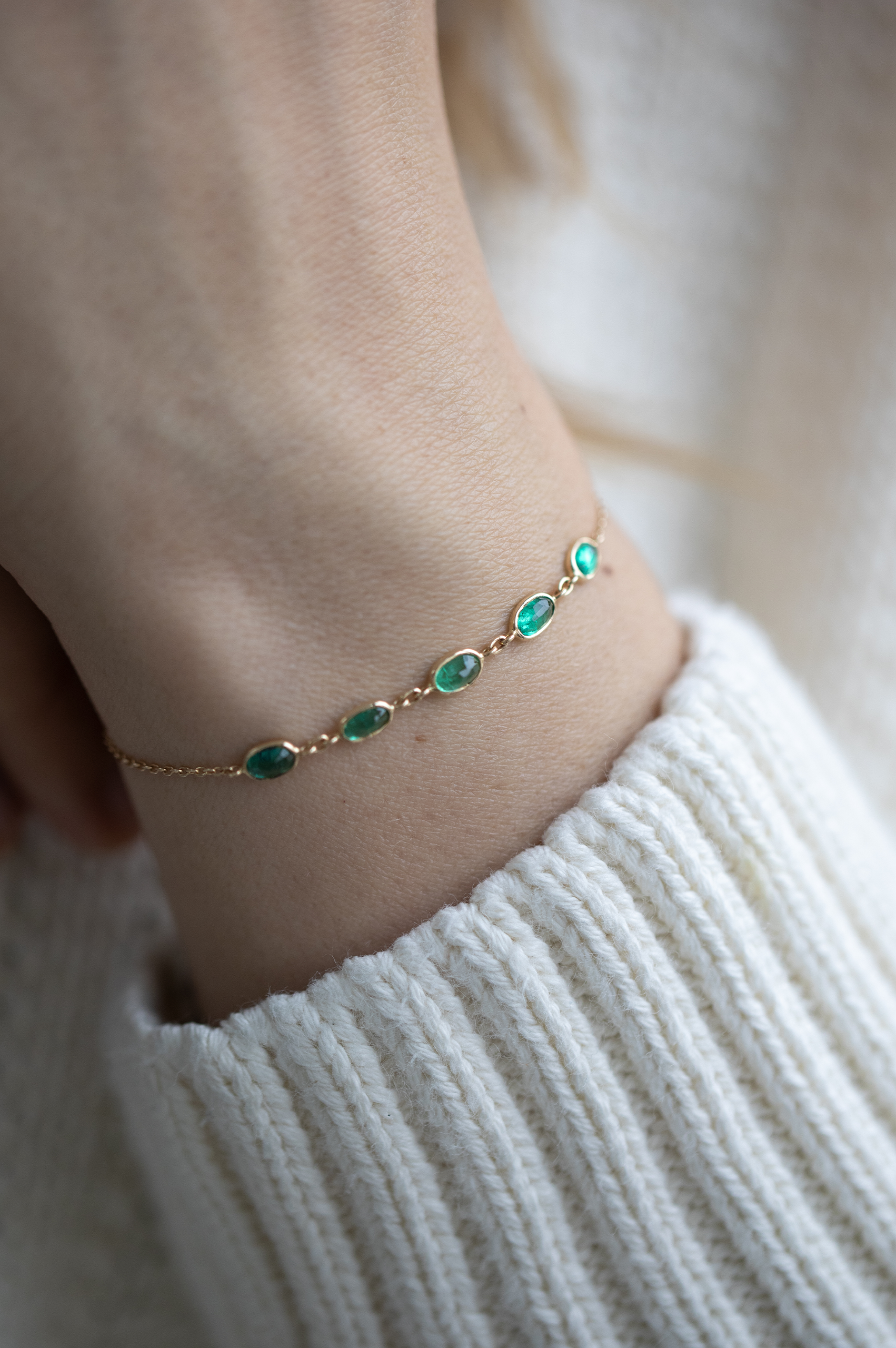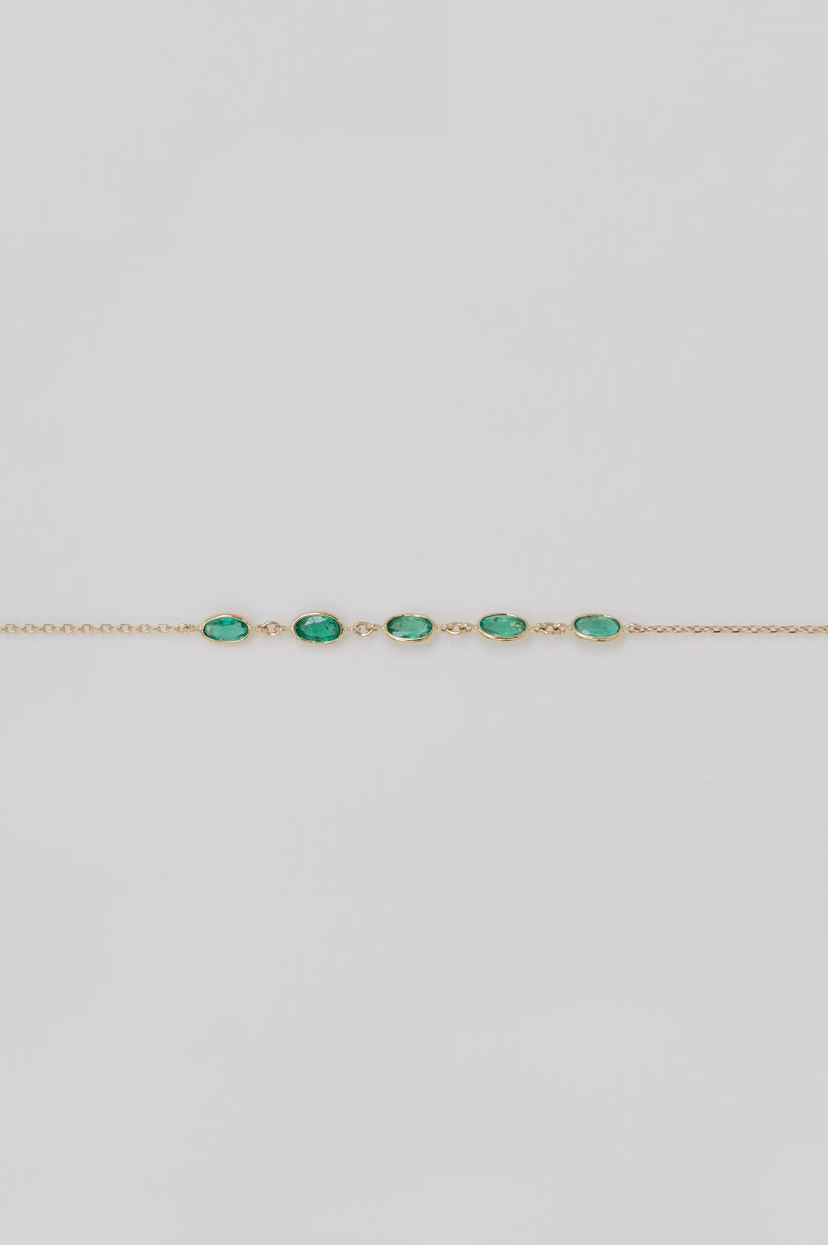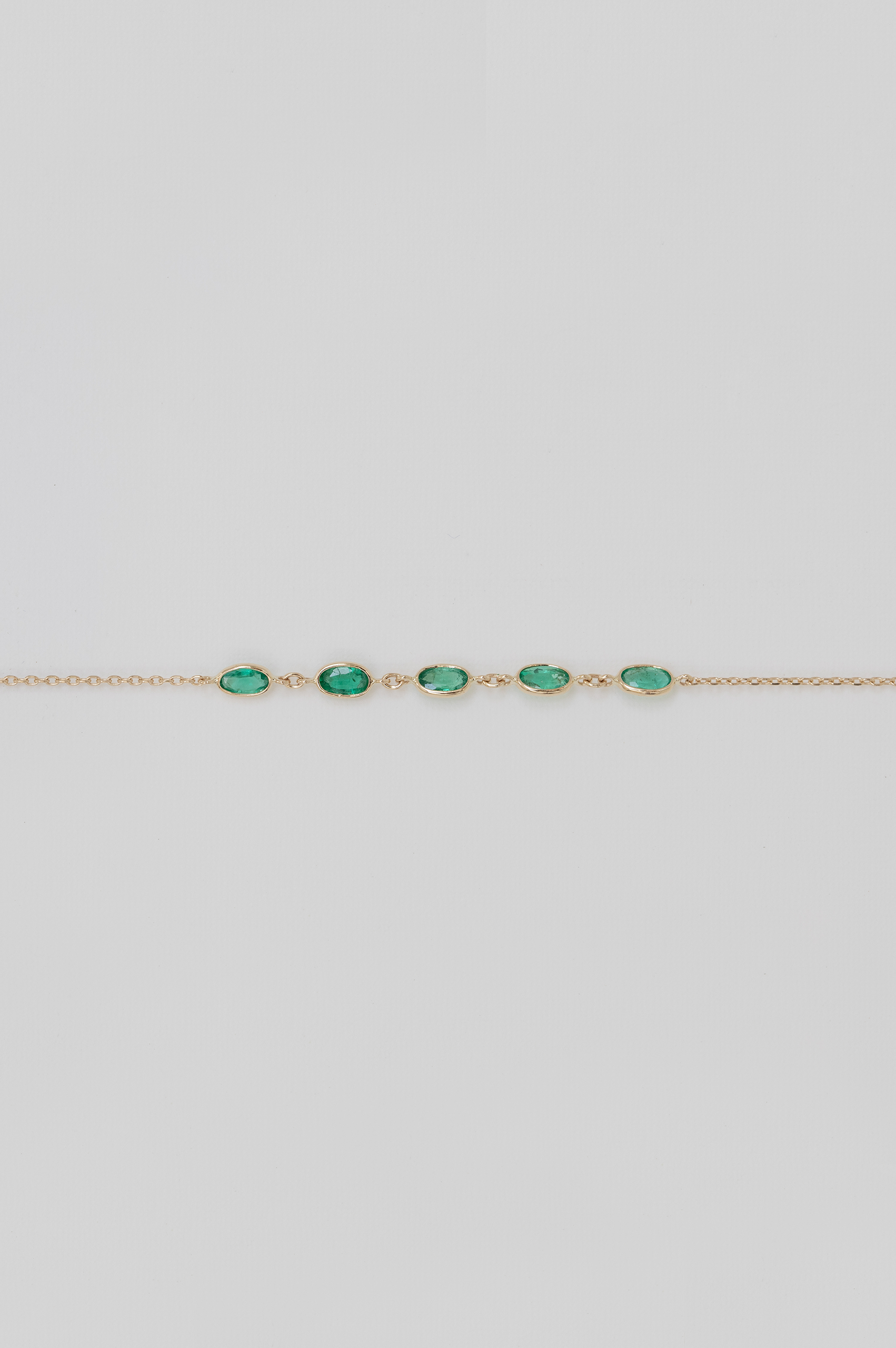 Celine Daoust 14k light yellow gold bracelet with five emeralds. The stones come in a gradient of green.