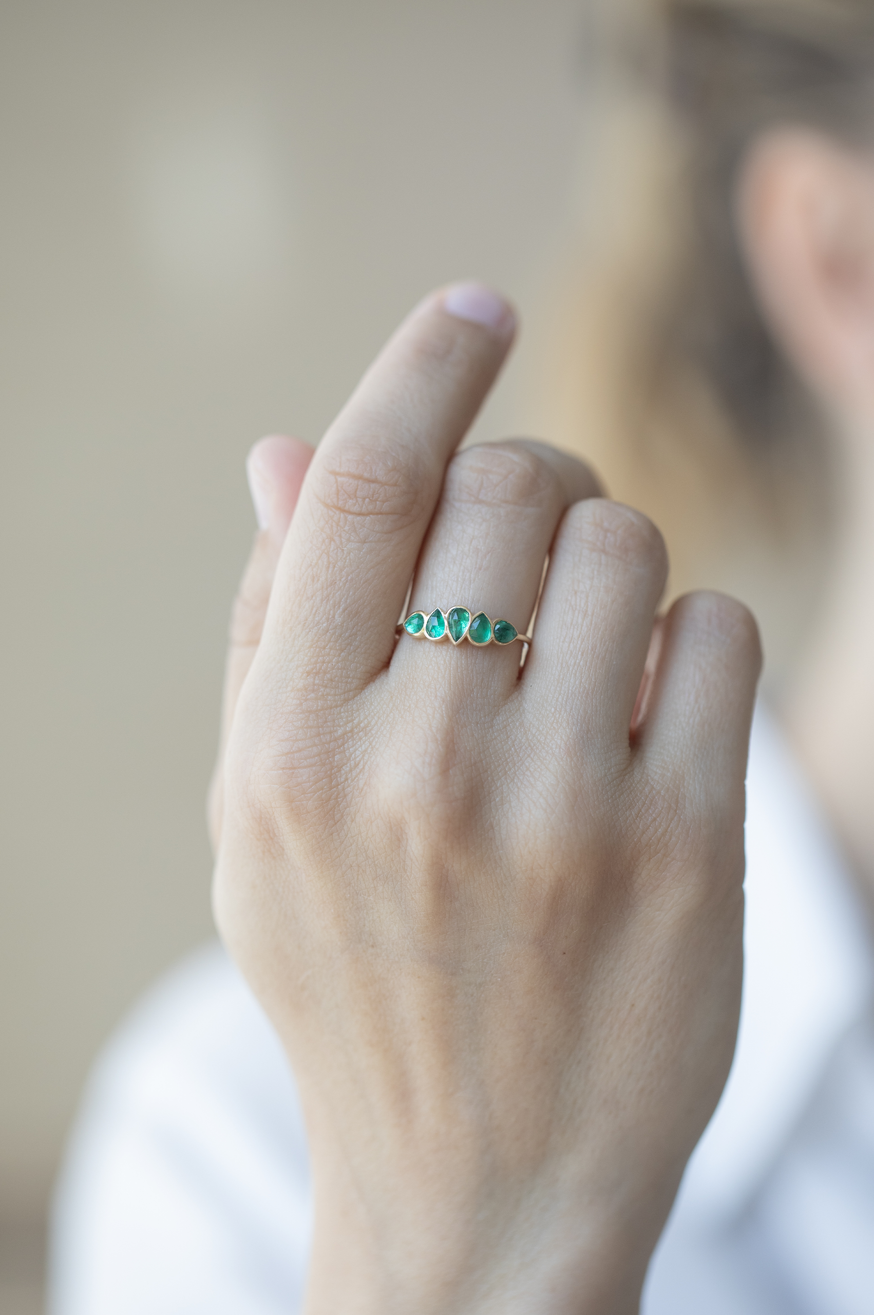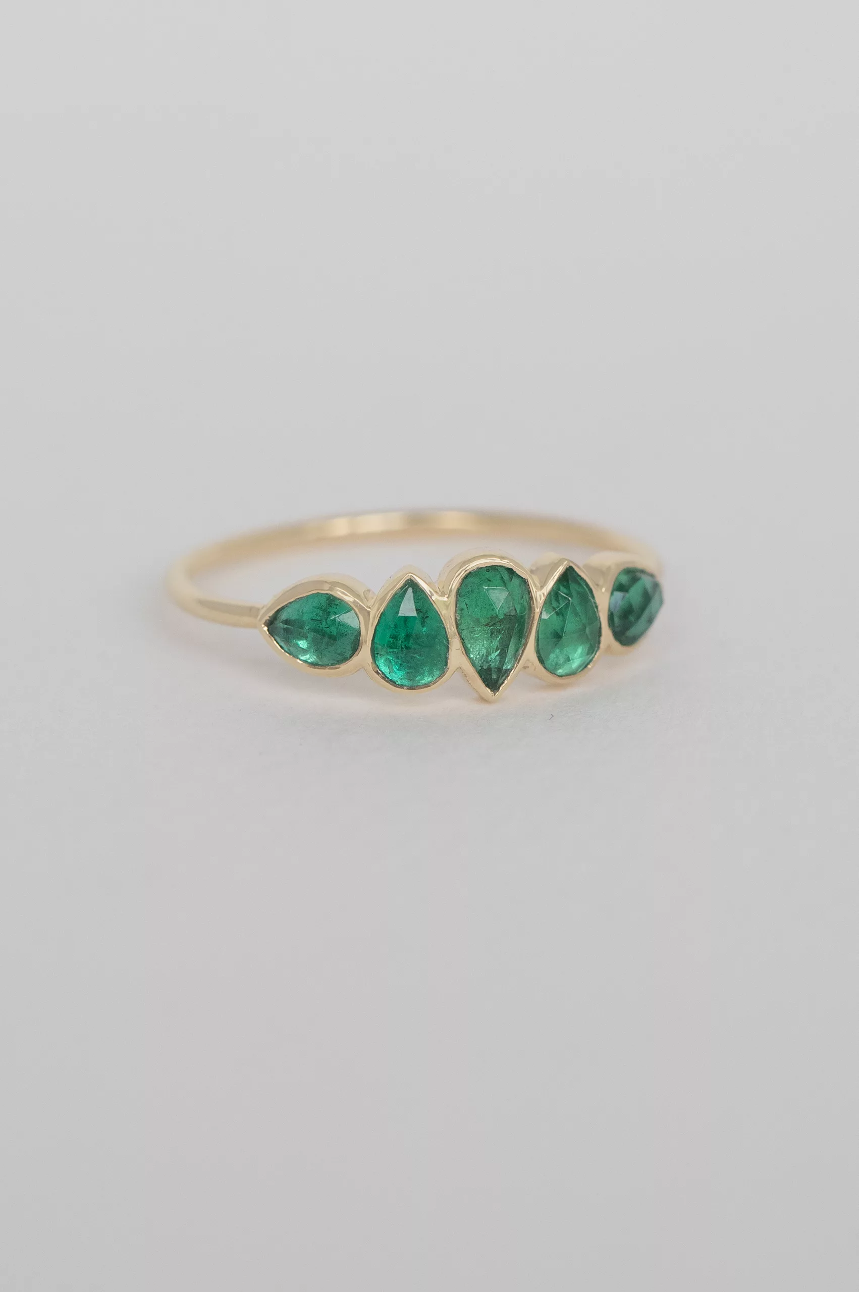 Celine Daoust 14k light yellow gold ring with five emeralds. The color comes in a gradient of vivid and darker green.