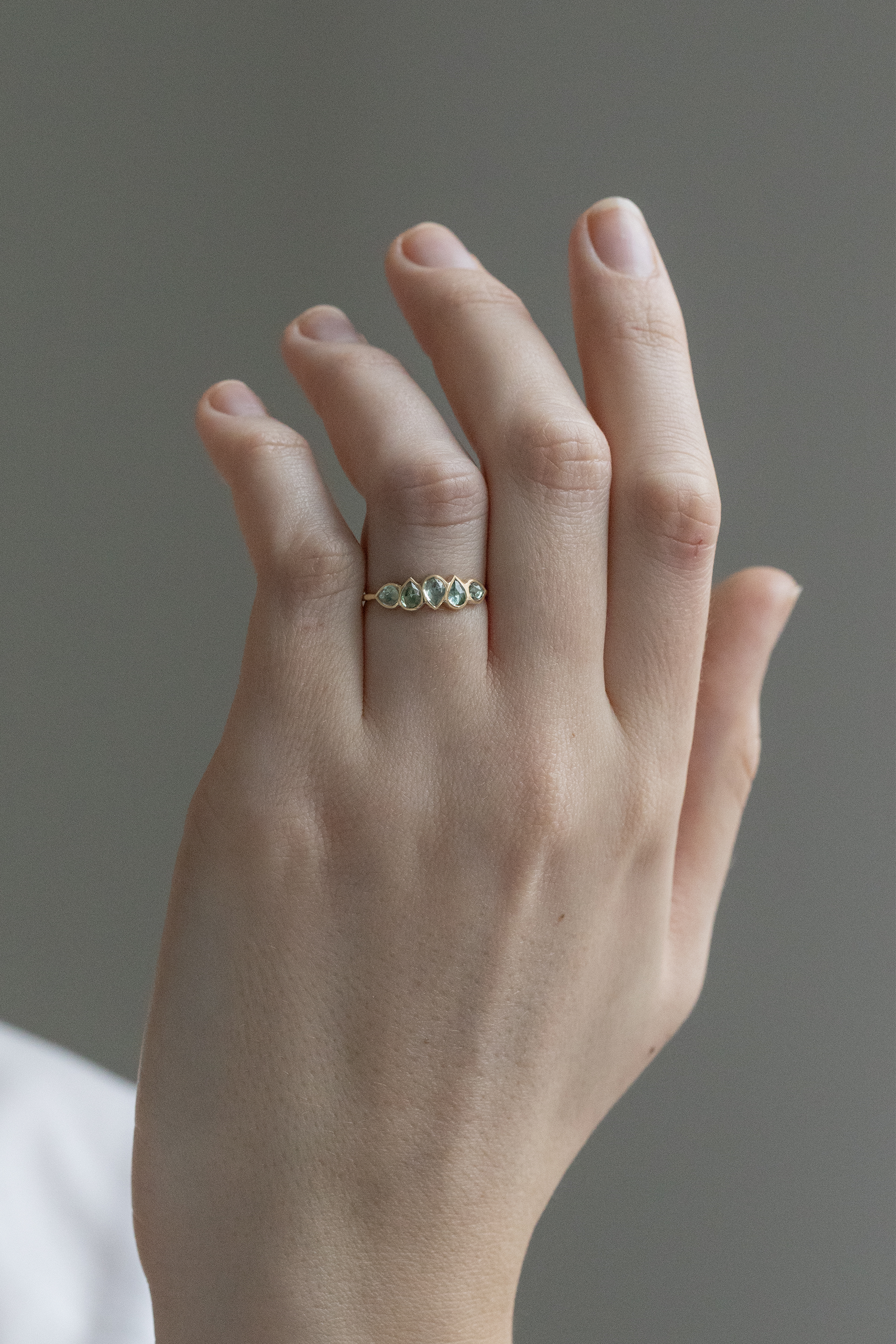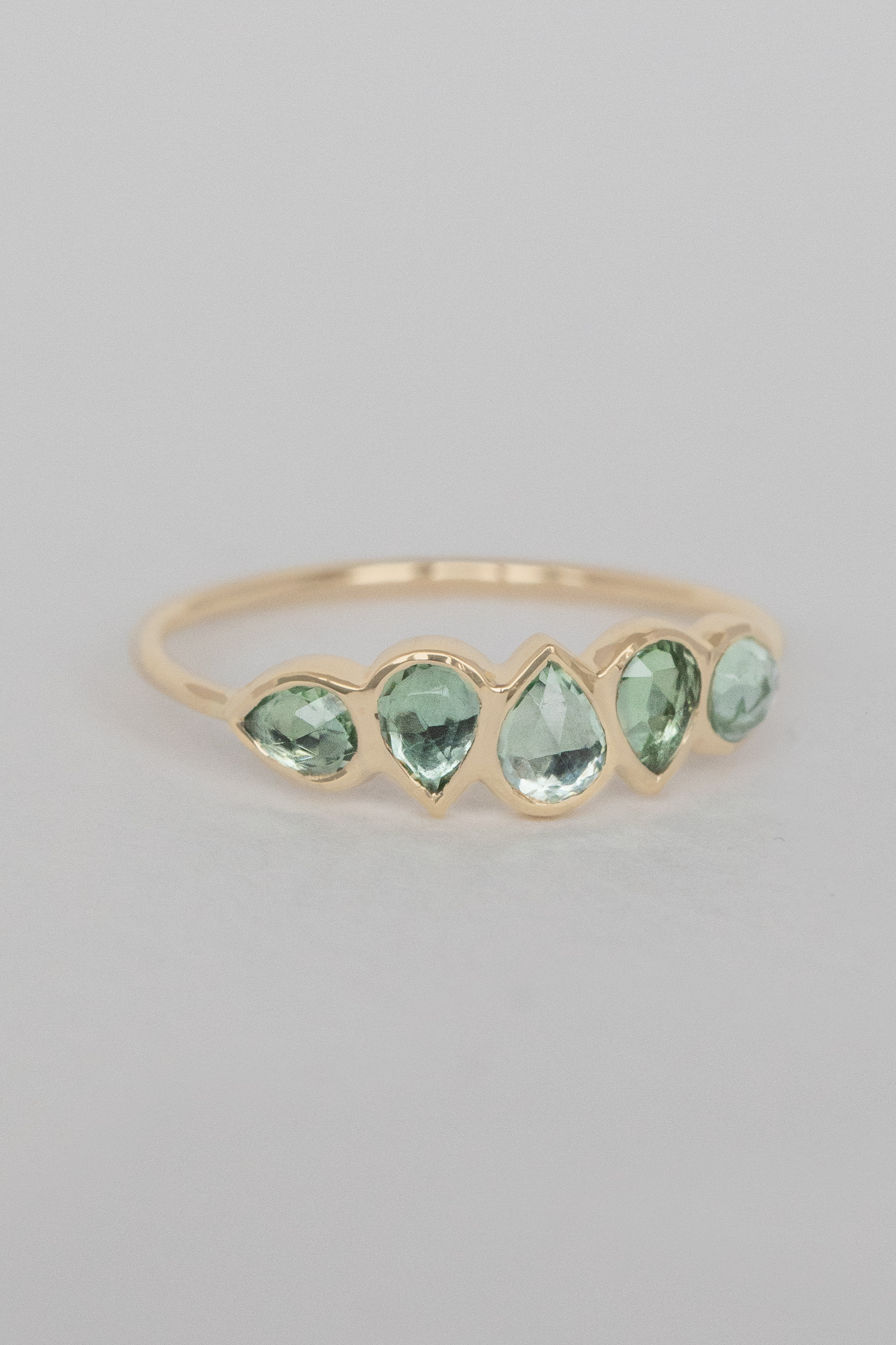 Céline Daoust 14k light yellow gold multi stones ring with five green tourmalines. The stones come in a gradient of dark and light green.
