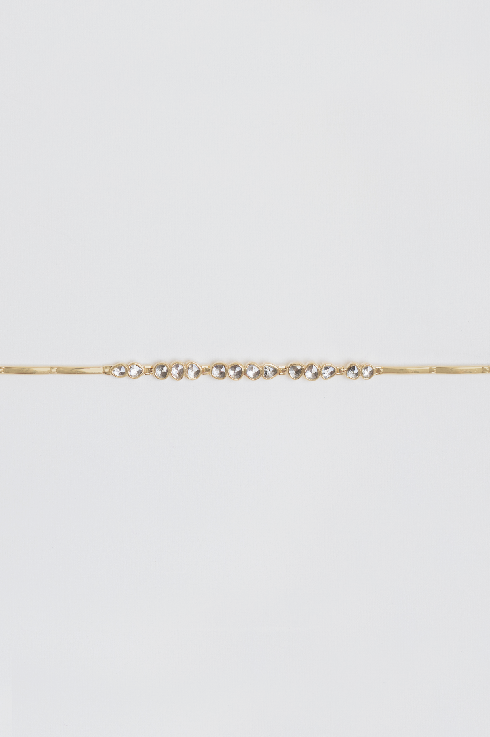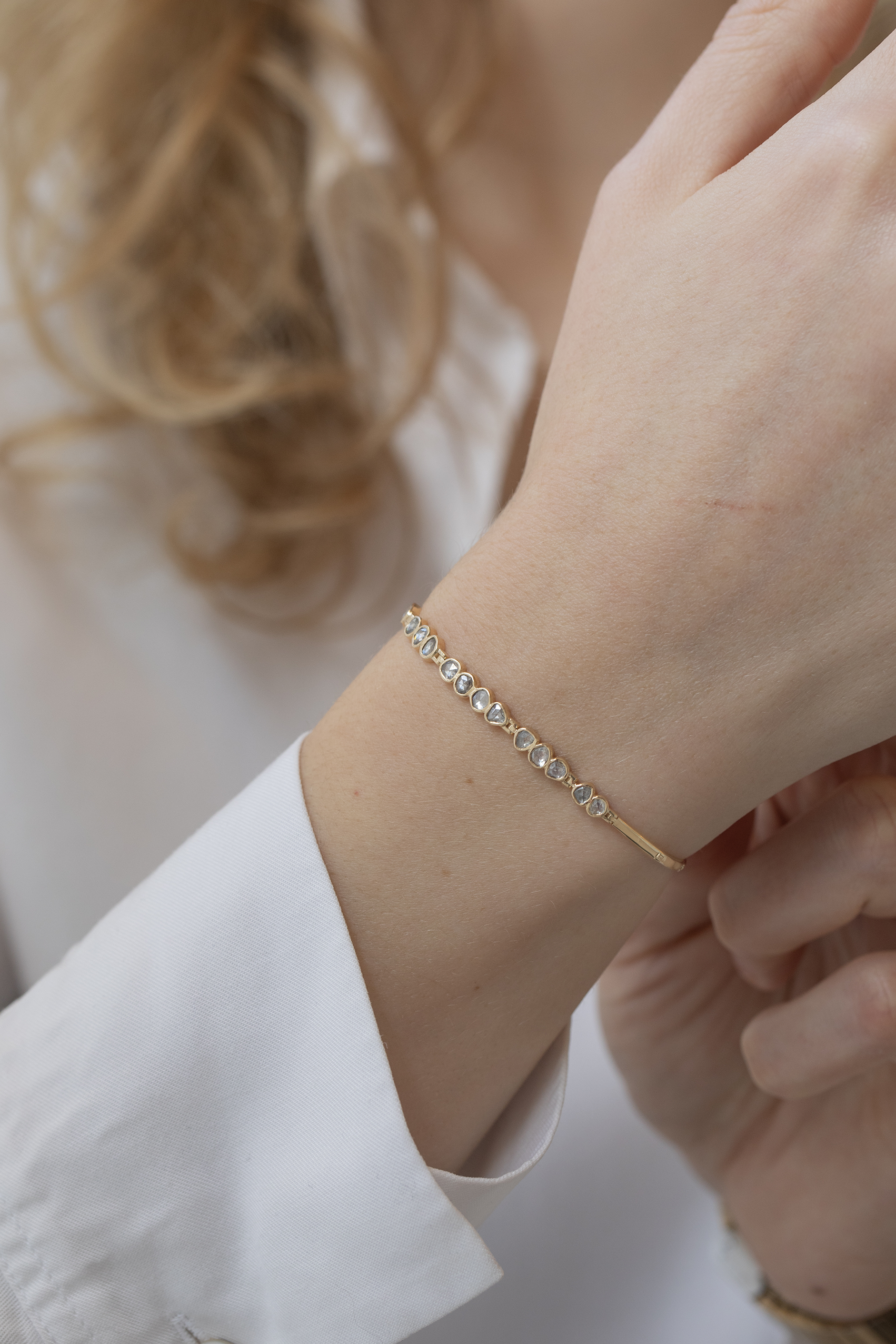 Celine Daoust 14k light yellow gold articulated bracelet with irregular rose cut grey diamonds. The stones come in a gradient of light grey.