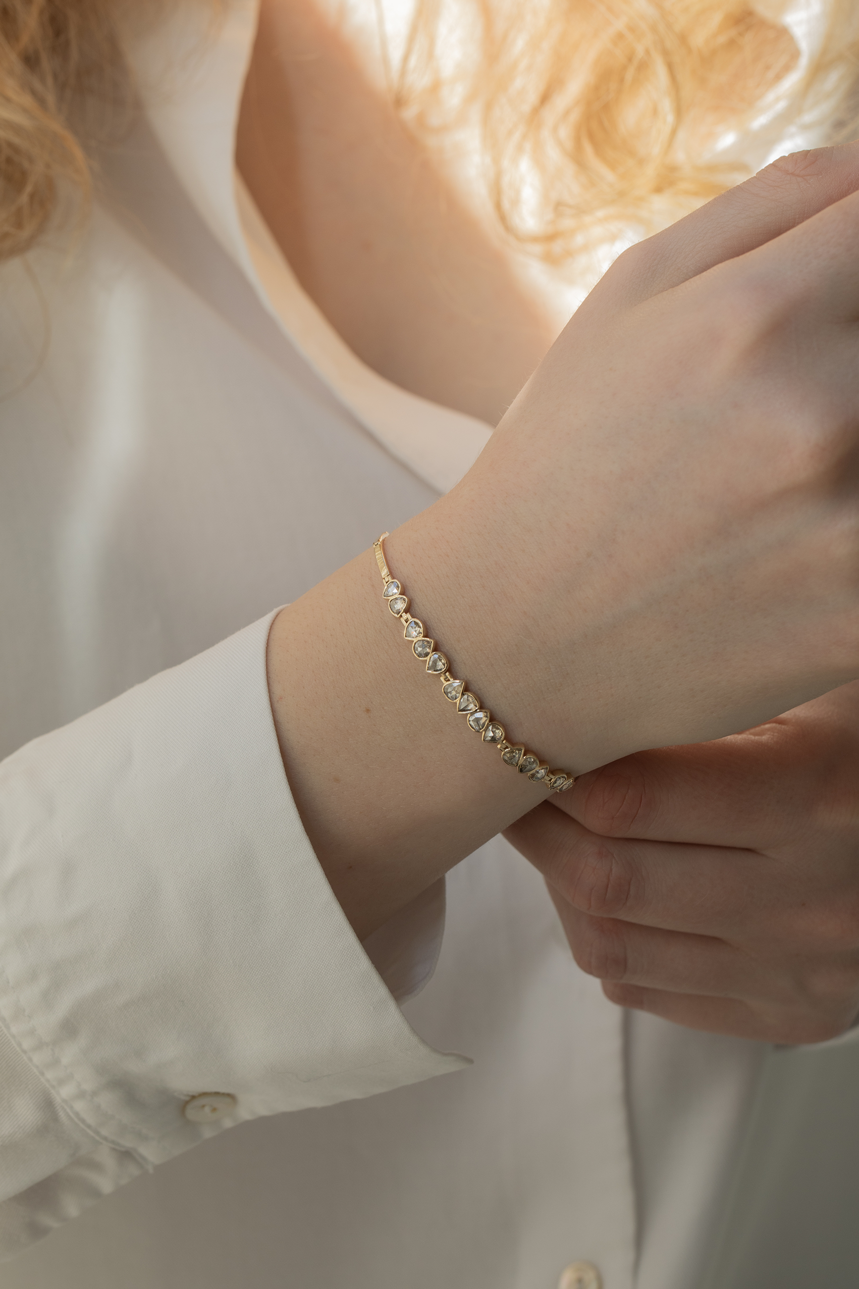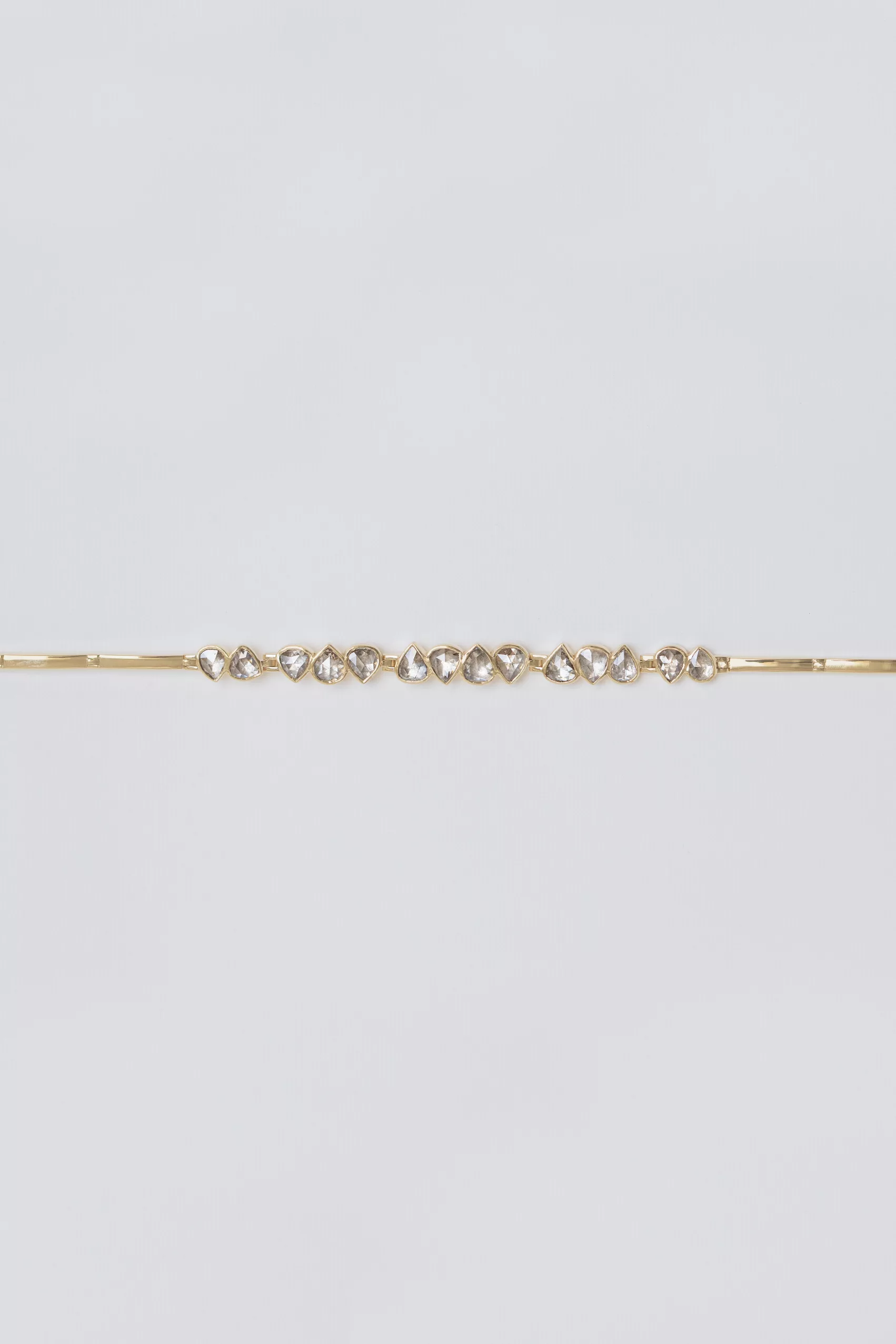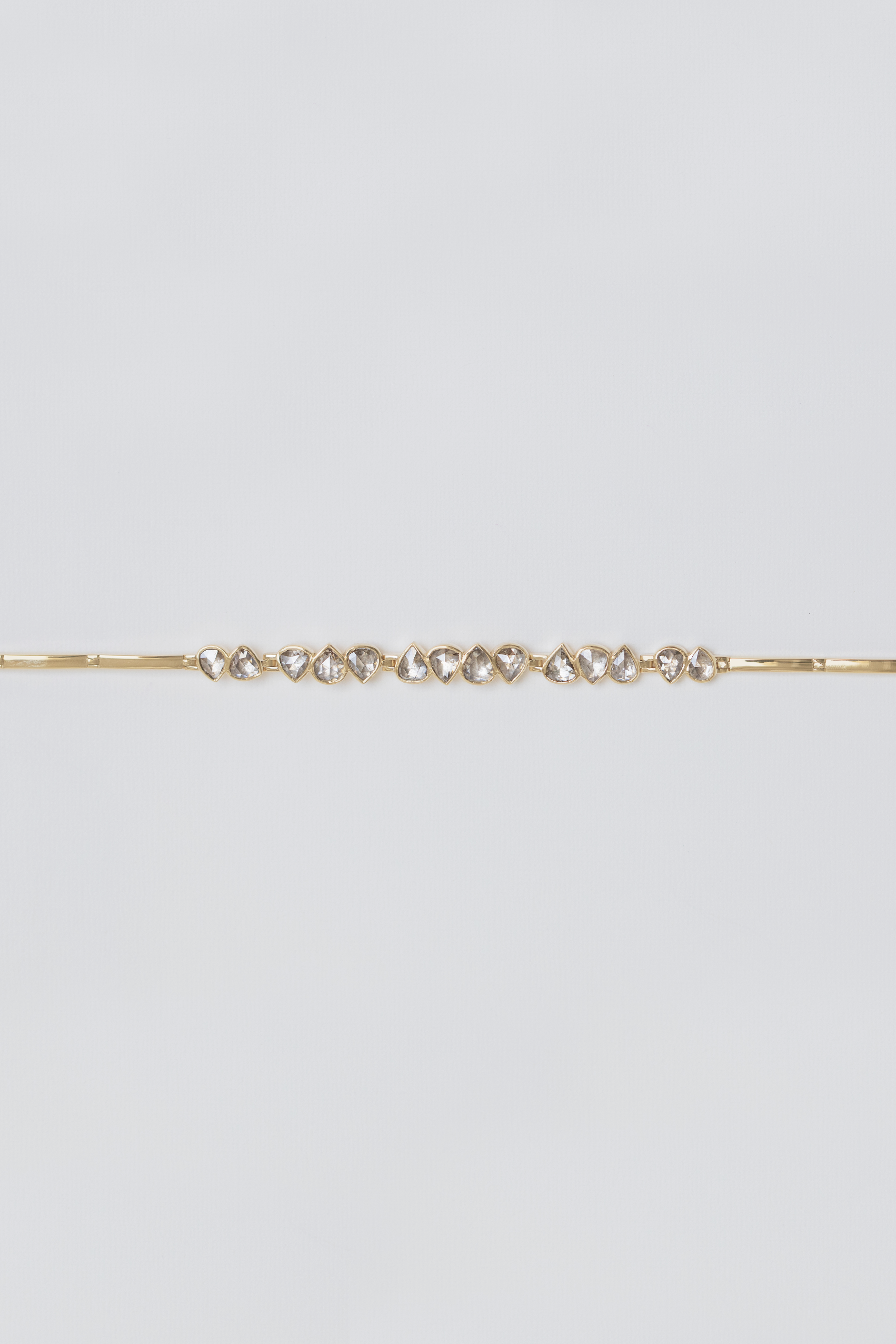 Celine Daoust 14k light yellow gold articulated bracelet with irregular rose cut grey diamonds. The stones come in a gradient of light grey.