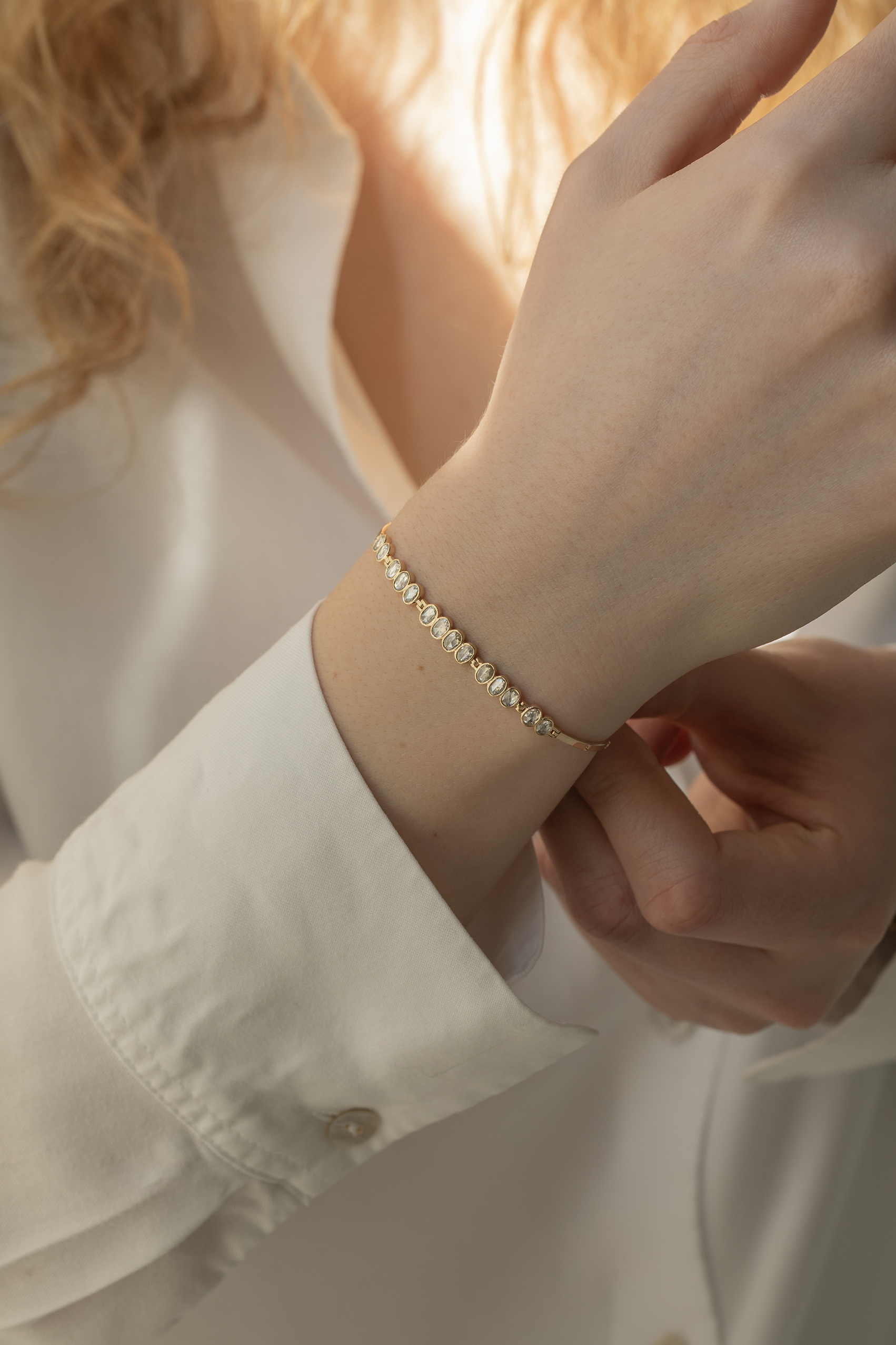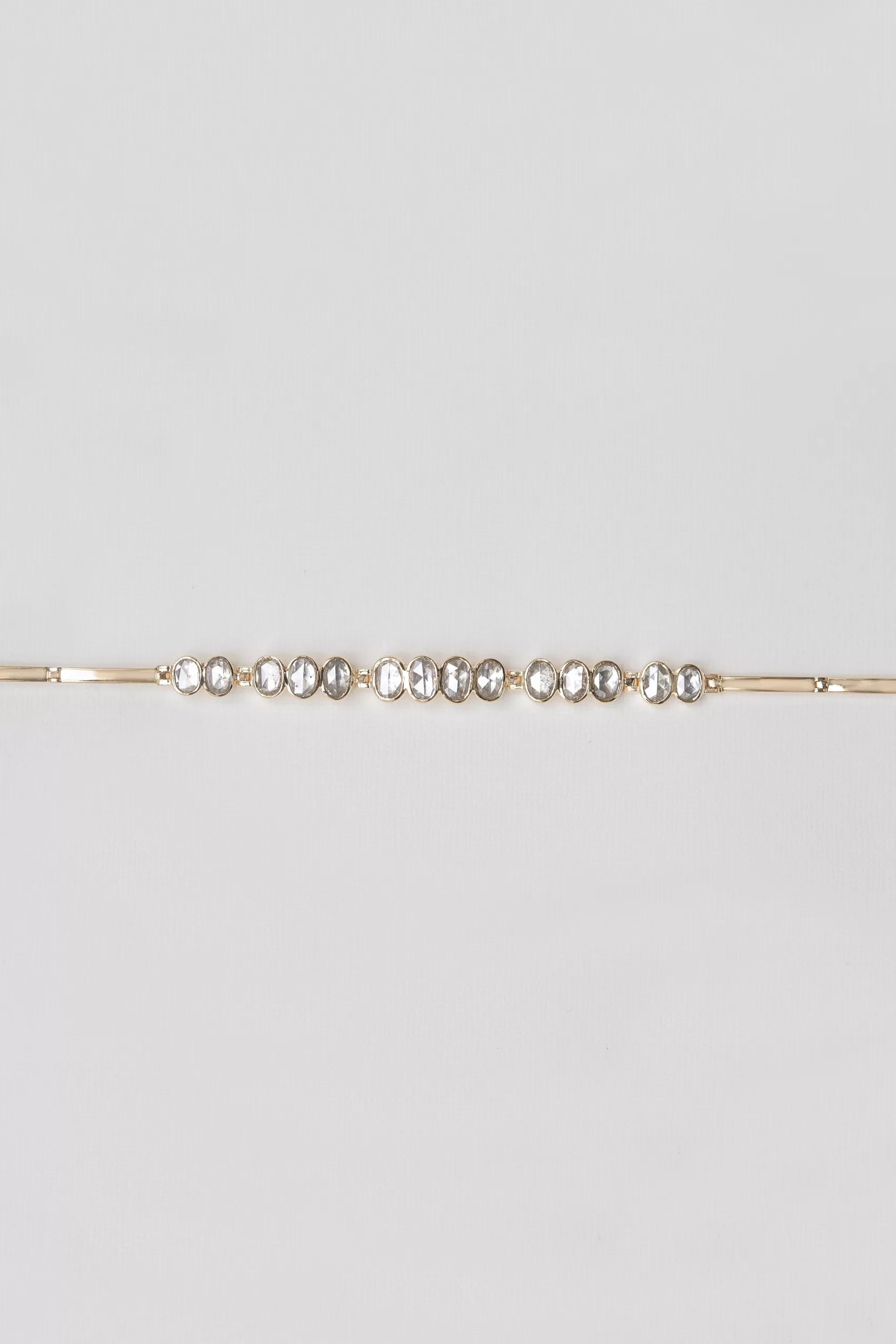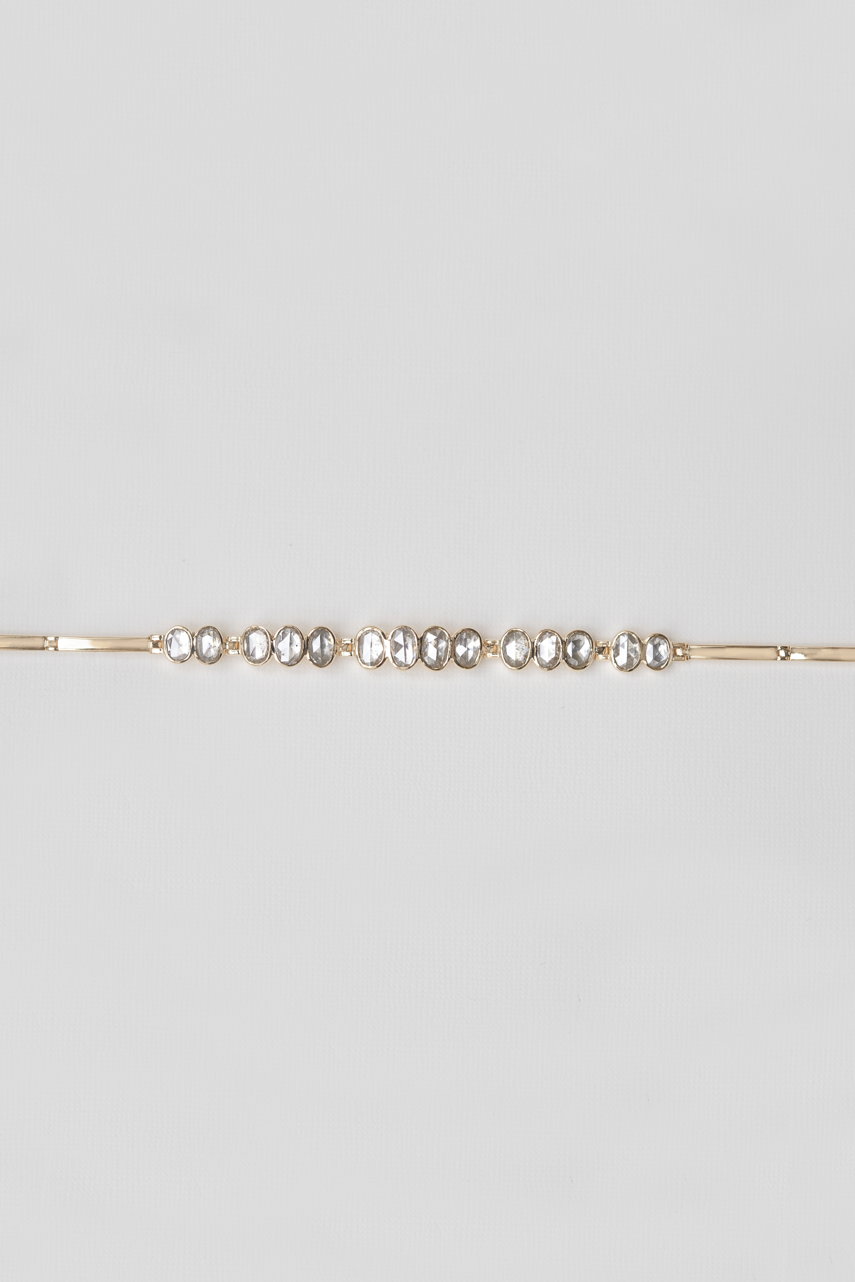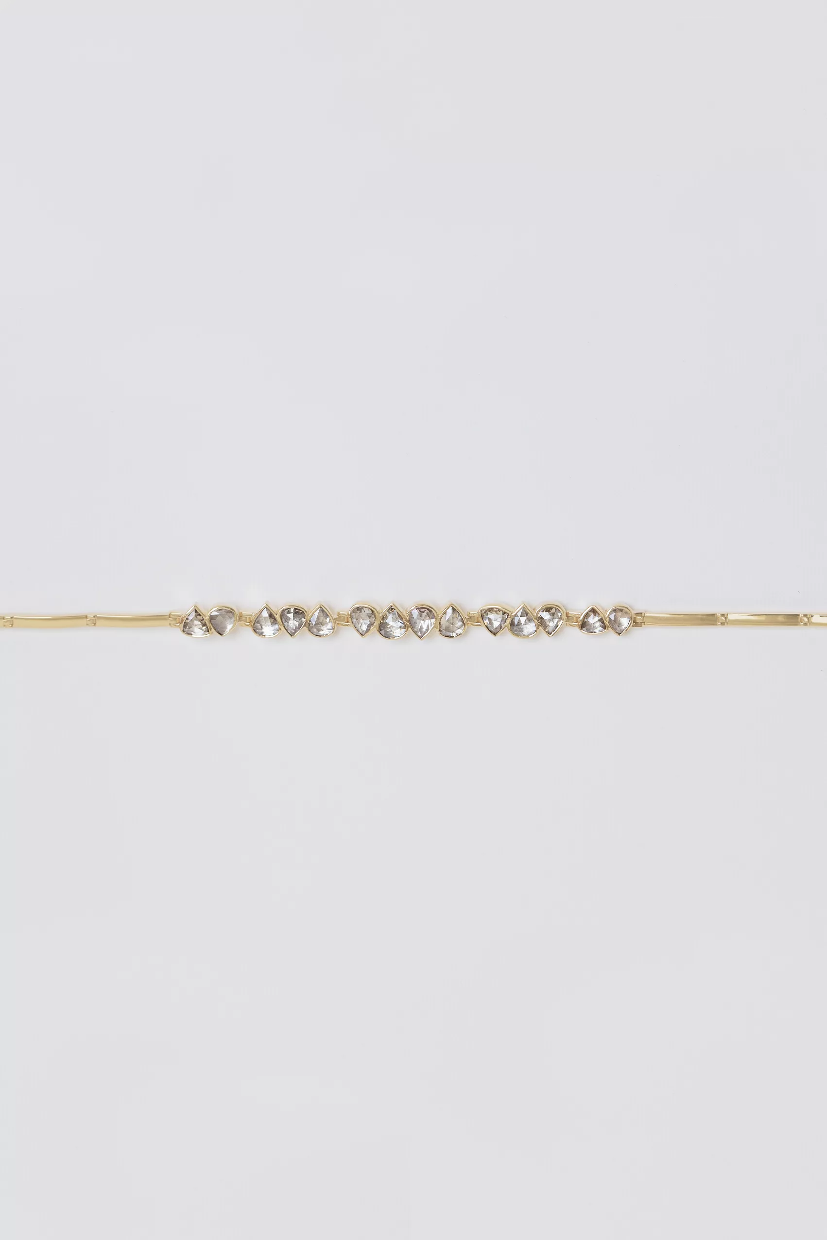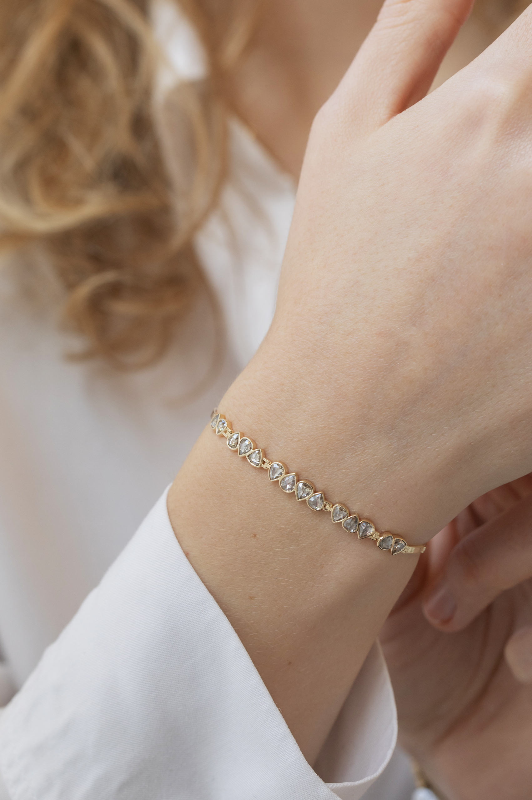 Celine Daoust 14k light yellow gold articulated bracelet with irregular rose cut grey diamonds. The stones come in a gradient of light grey.