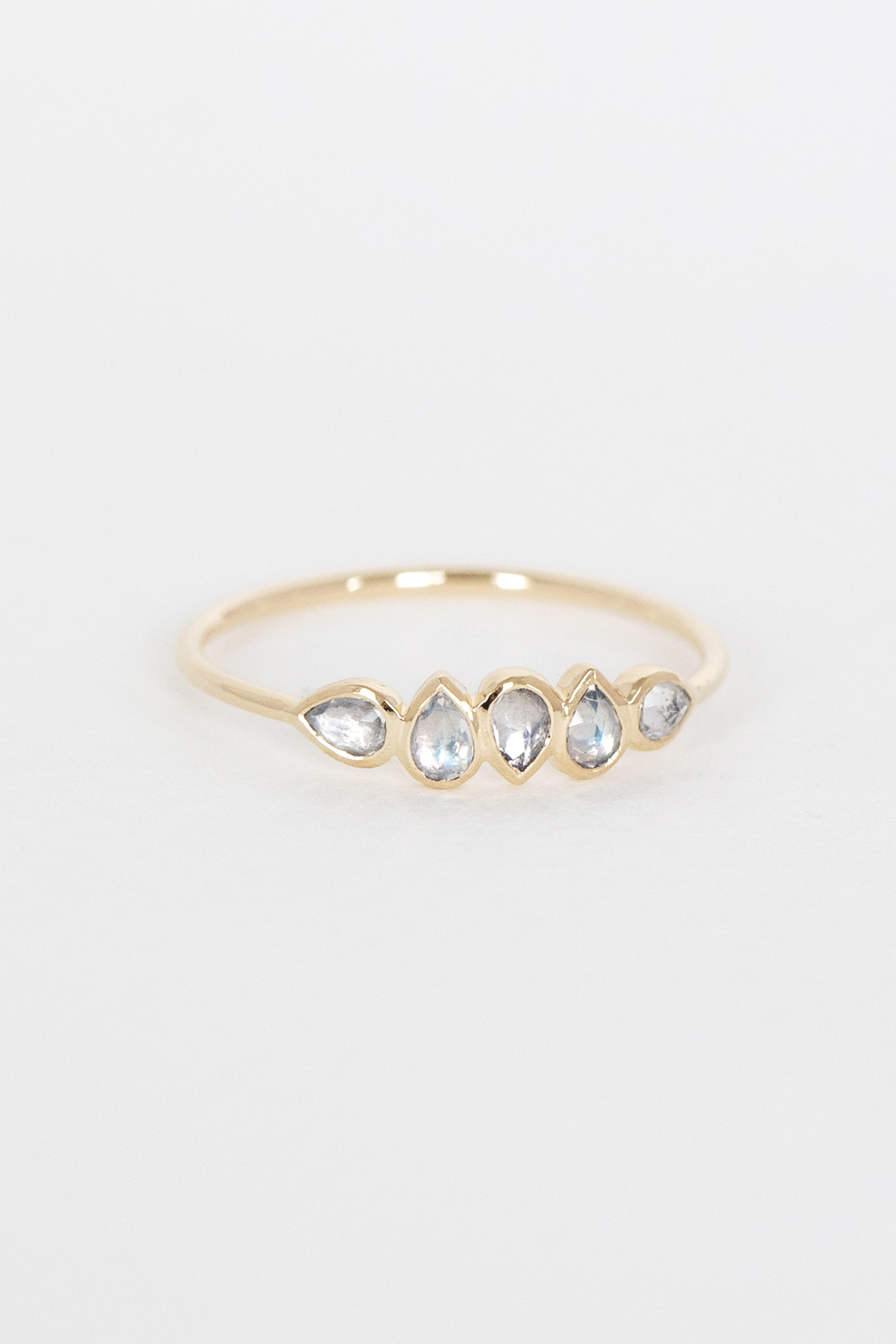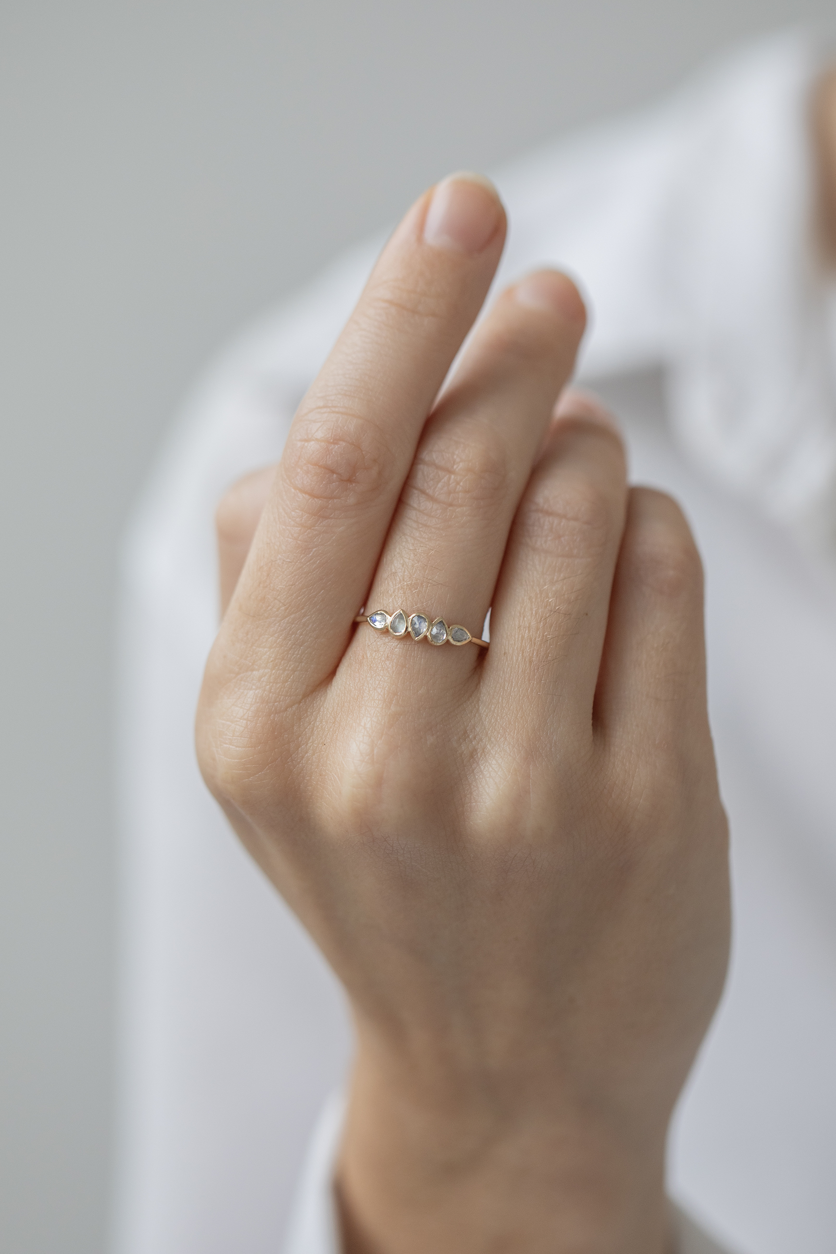 Celine daoust 14k light yellow gold multi ring with five moonstones. The stones are a gradient of light iridescent tones.
