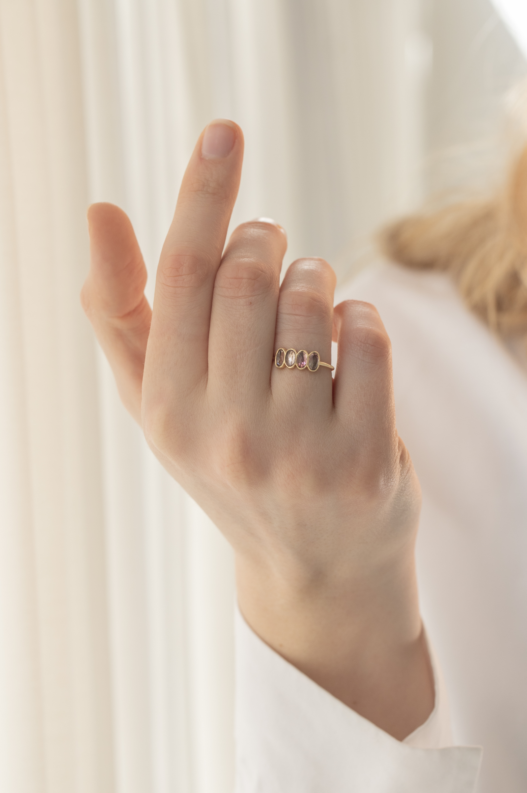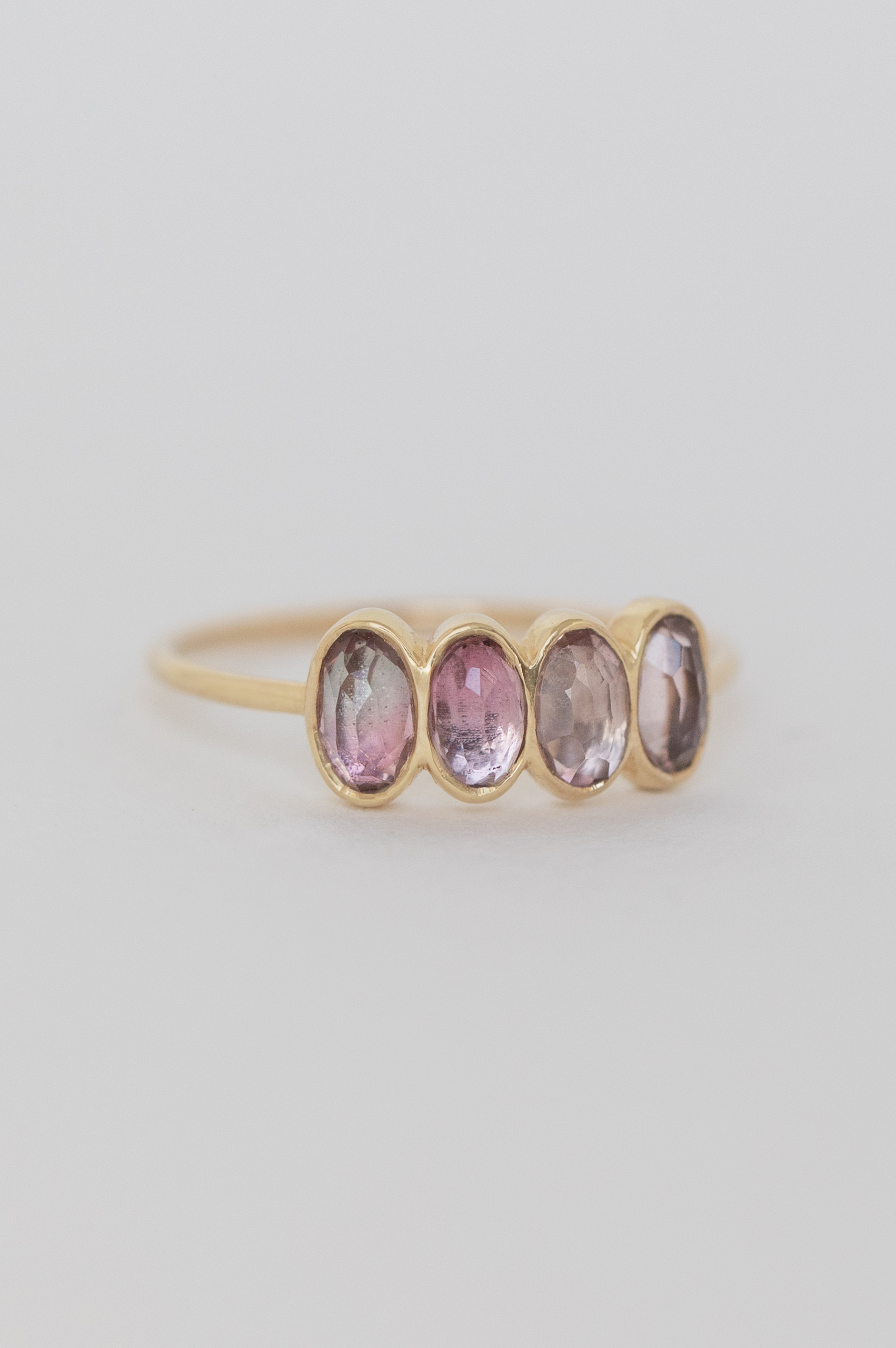 Celine daoust 14k yellow gold ring with four pink tourmalines. The stones come in a gradient of light pink and pink.