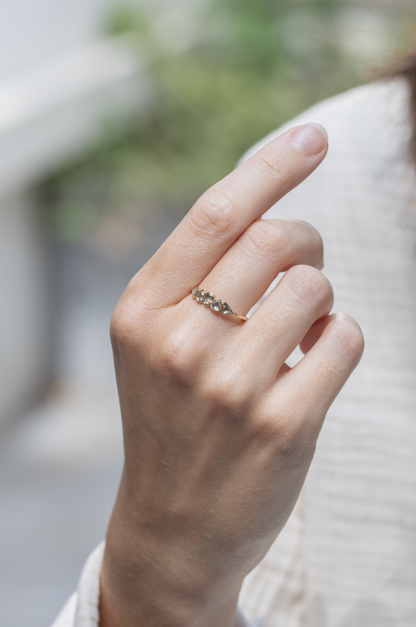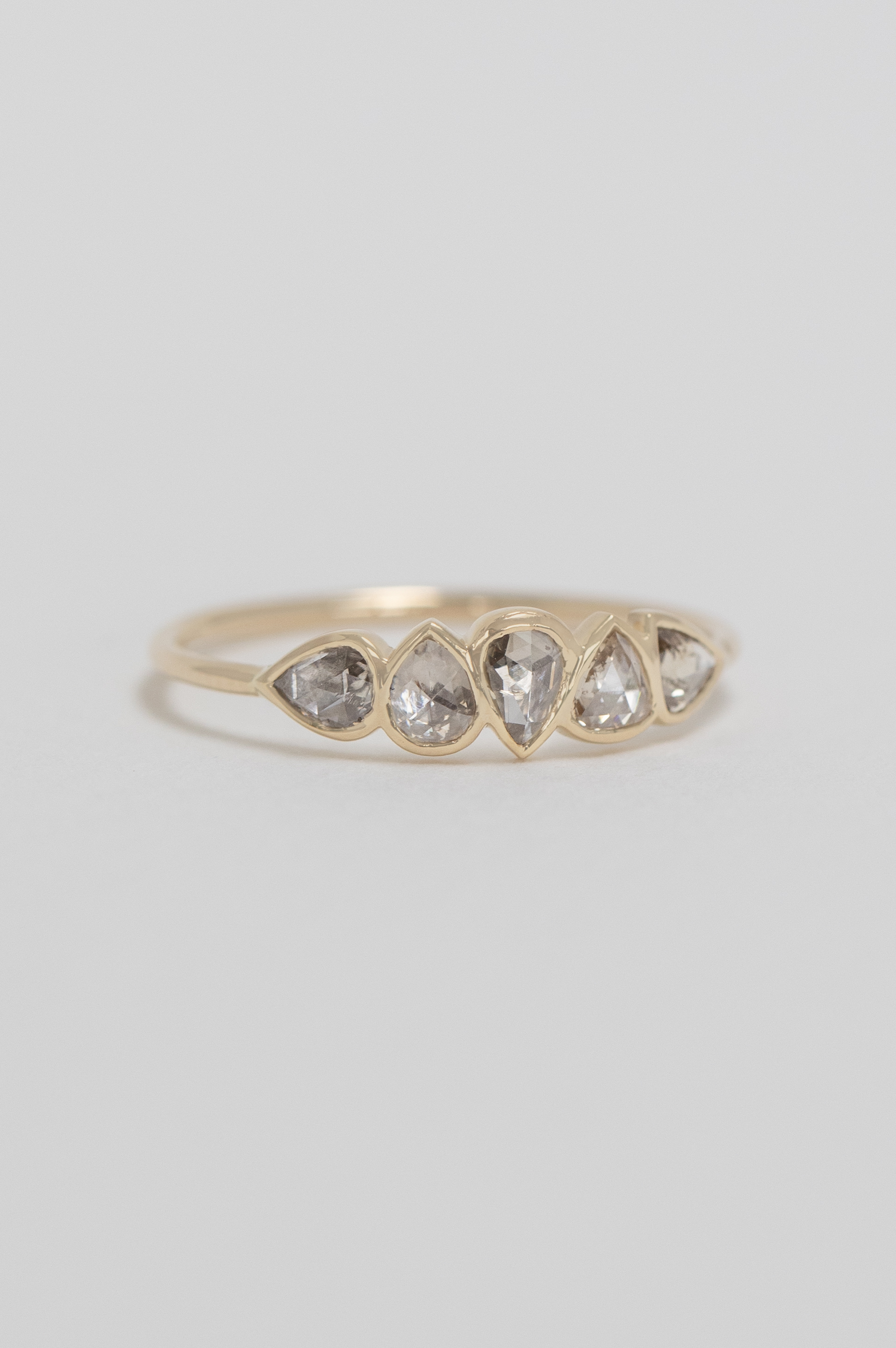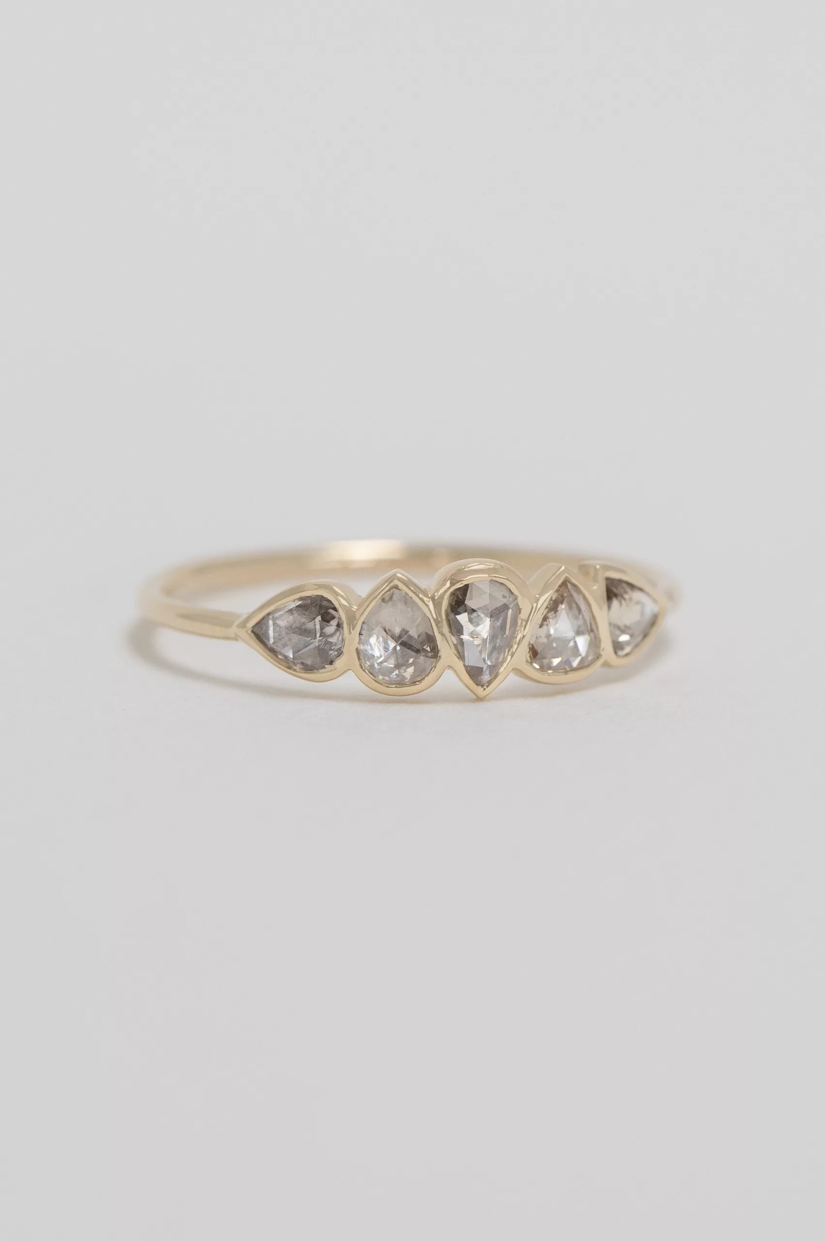 Celine Daoust 14k light yellow gold multi rose cut ring with five grey diamonds. The stones come in a gradient of light grey.